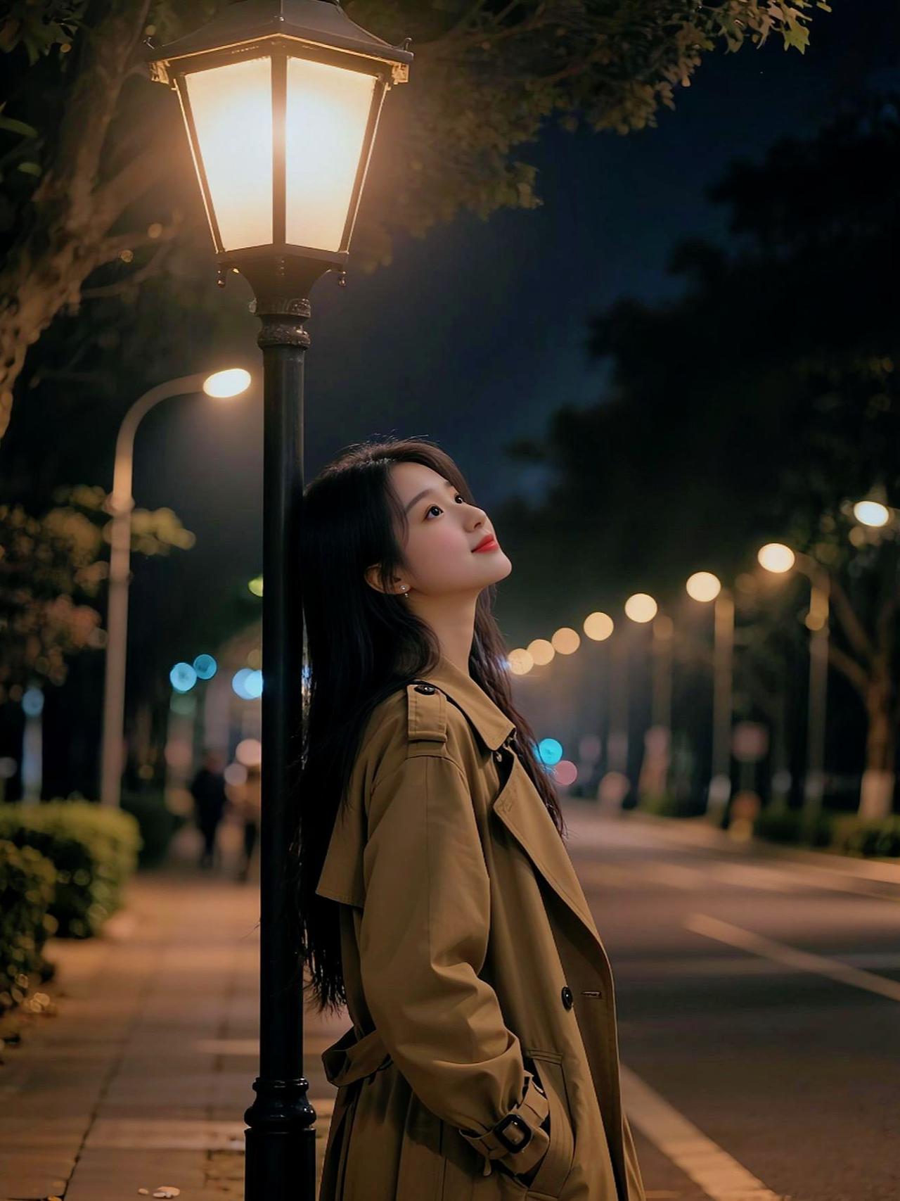 抬头路灯下留影 小姐姐 孤独的城市寂寞的夜