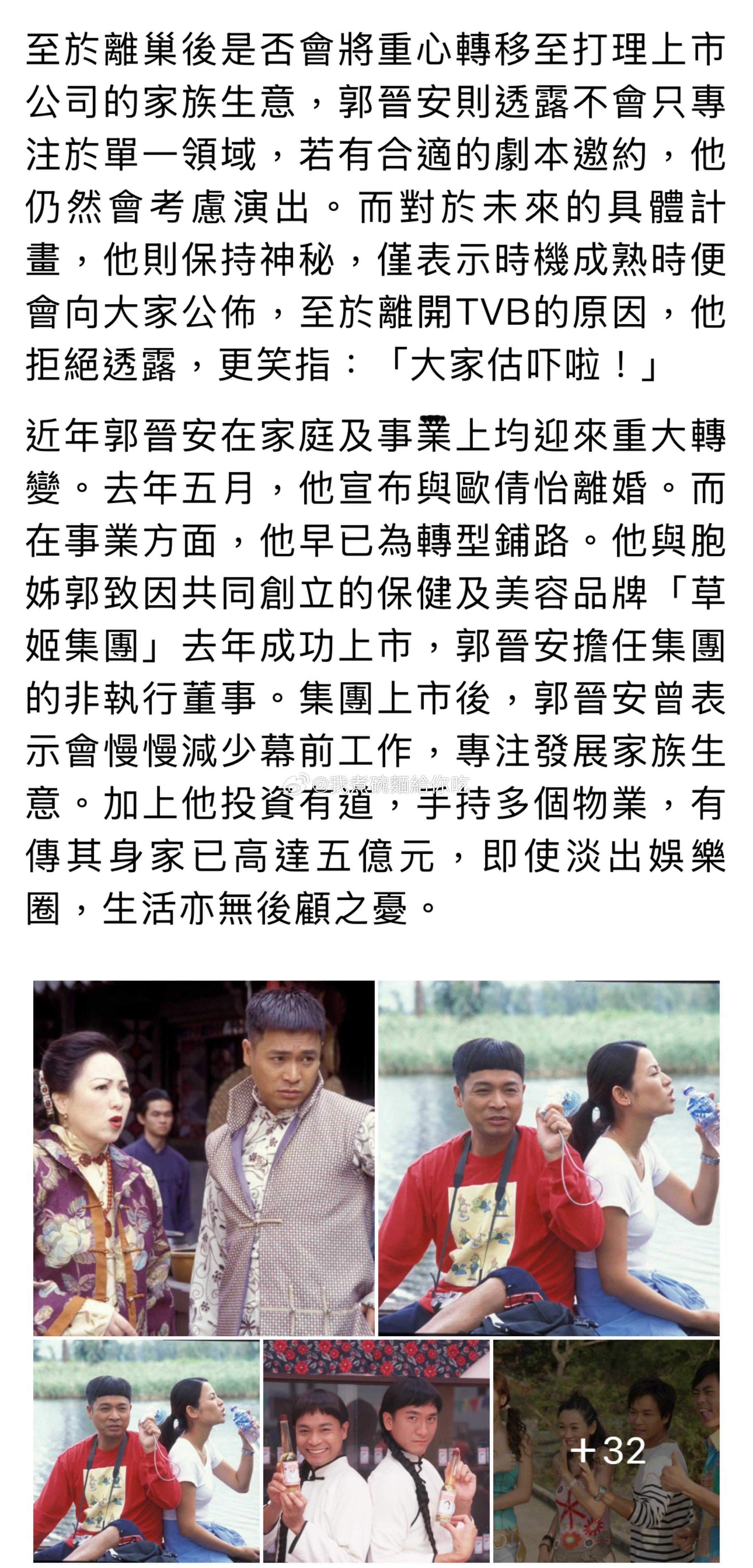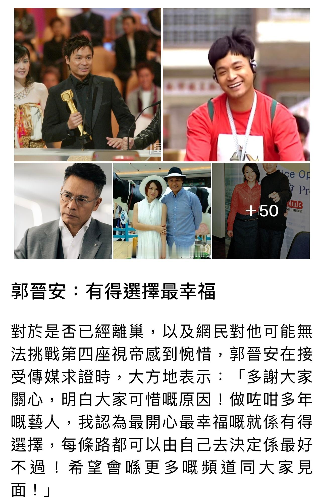 郭晋安承认离巢TVB.61岁郭晋安被发现已不在TVB官网的艺员名单之列,引发外界揣测他已与TVB结束多年的宾主关系。对于是否已经离巢,郭晋安在接受传媒求证时,他表示:「多谢大家关心,明白大家可惜的原因,做了这么多年的艺人,我认为最开心最幸福的就是有得选择,每条路都可以由自己去决定是最好不过,希望会在更多的频道跟大家见面。」至于离巢后是否会将重心转移至打理公司的生意,郭晋安则透露不会只专注于单一领域,若有合适的剧本邀约,他仍然会考虑演出。而对于未来的具体计划,他表示时机成熟时便会向大家公布。至于离开TVB的原因,他拒绝透露,更笑指:「大家猜下啦!」