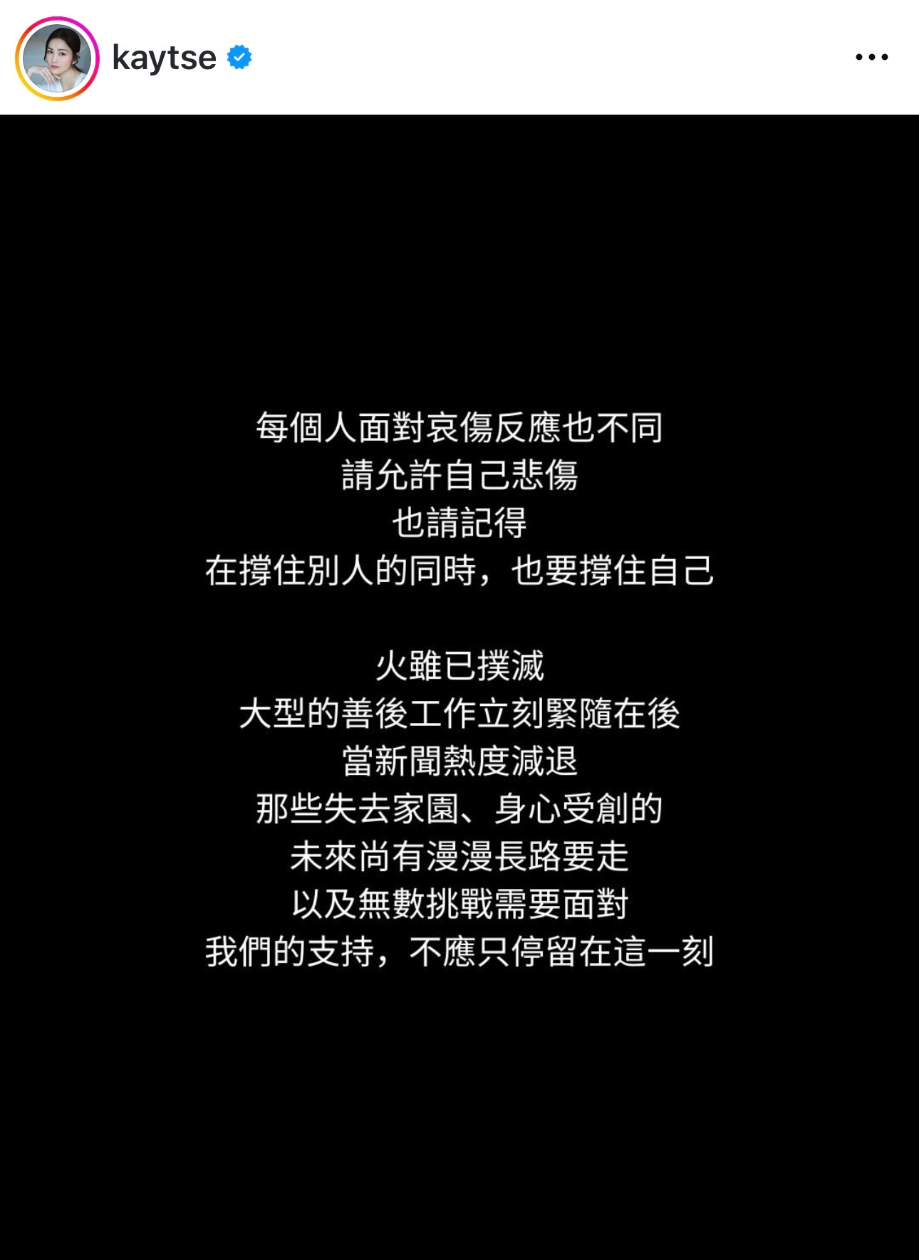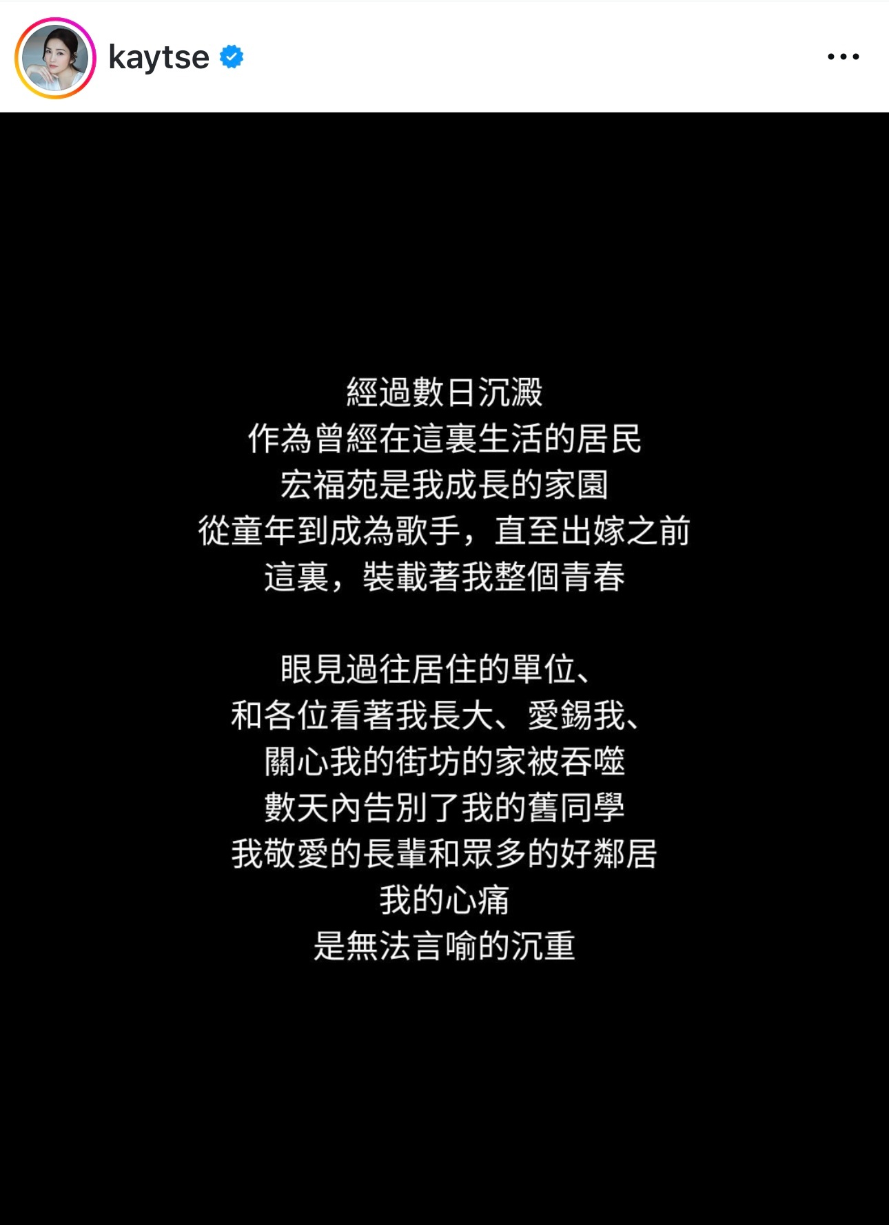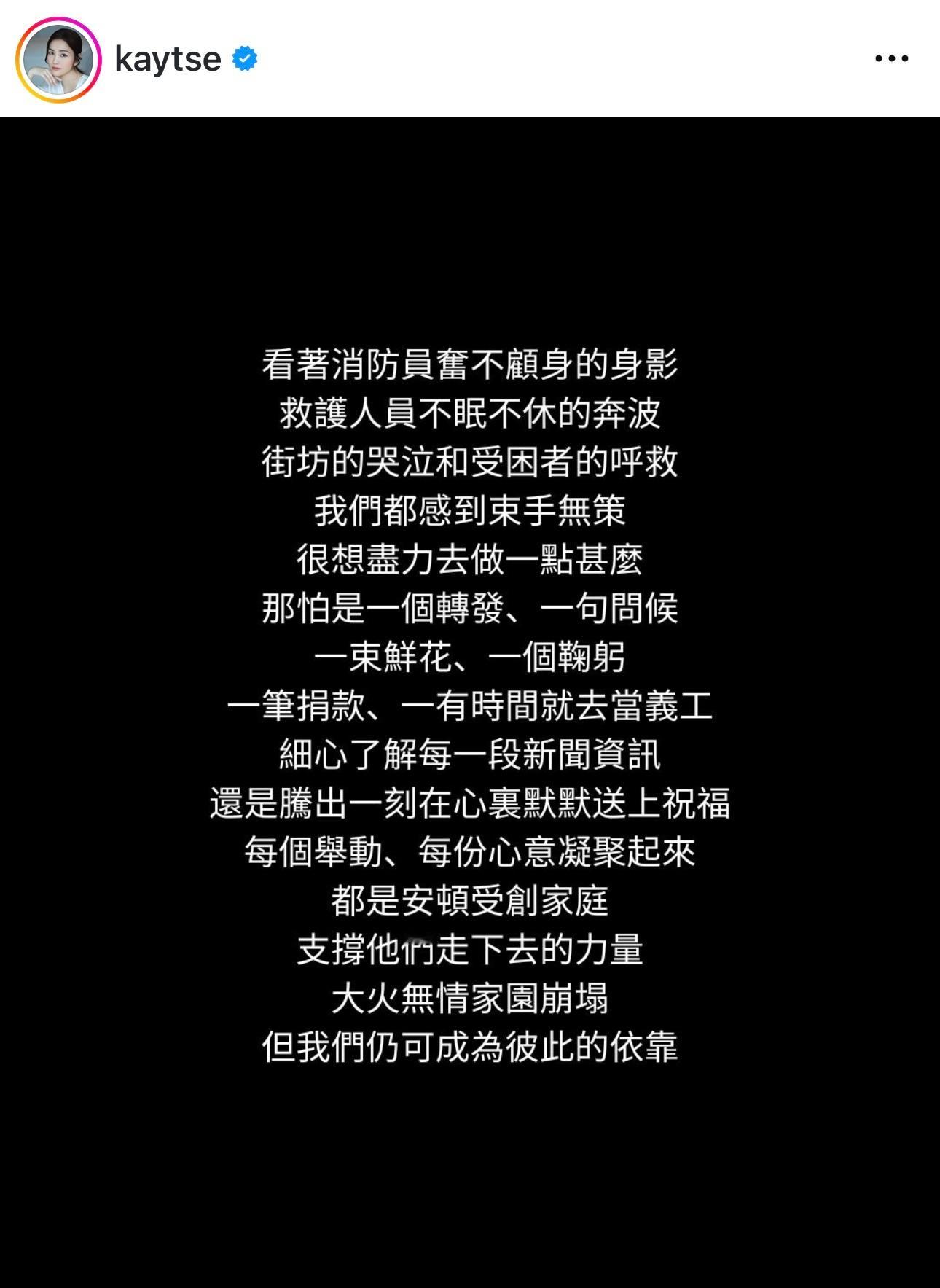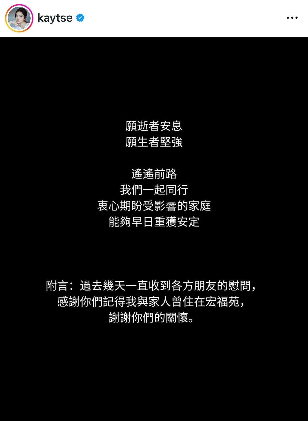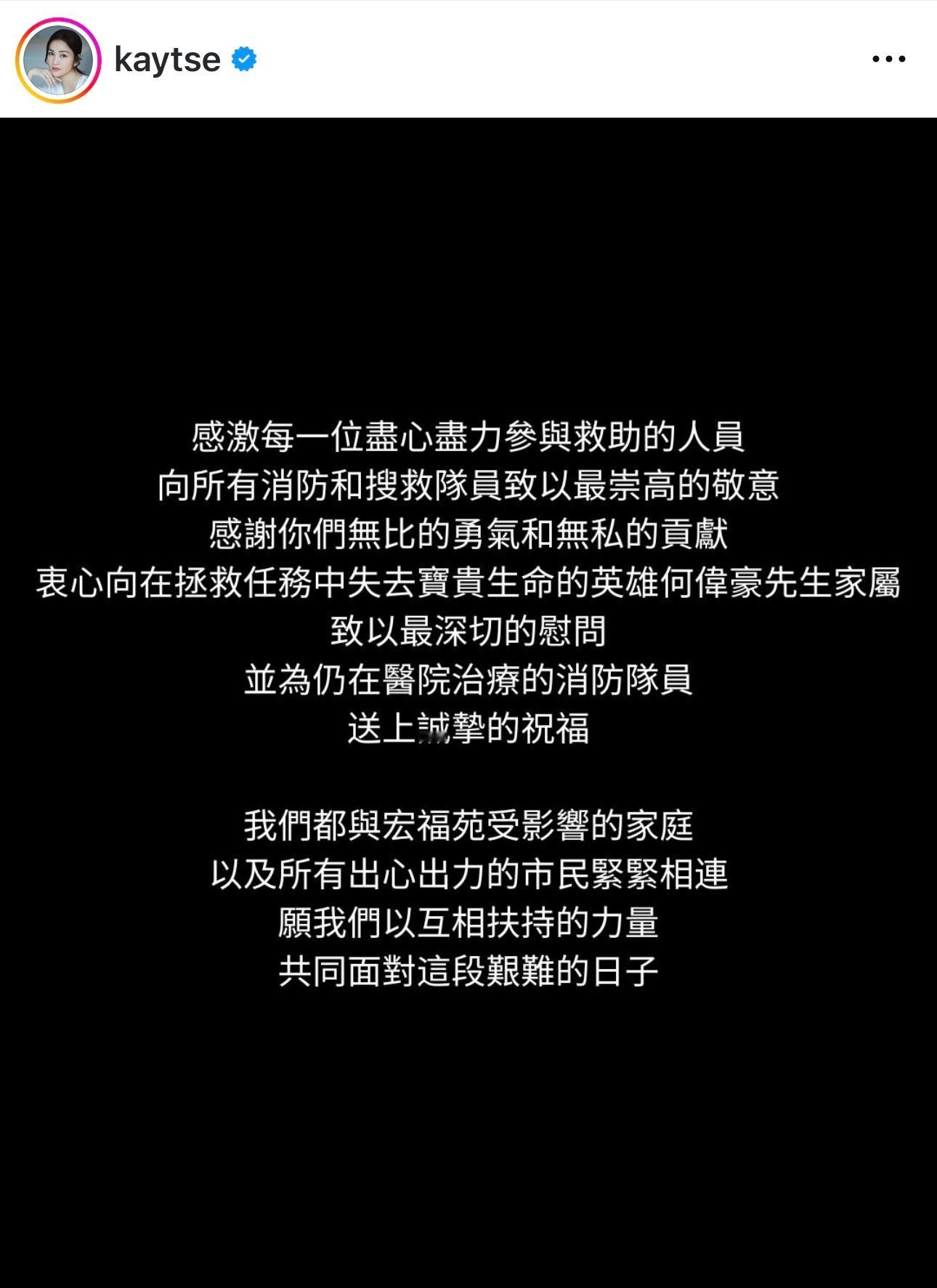 谢安琪出嫁前住宏福苑:承载整个青春 旧同学好邻居离世「无法言喻的沉重」.大埔宏福苑火灾,谢安琪表示见旧居单位和昔日爱惜她的街坊家园被火吞噬,更甚是有多位旧同学、长辈和好邻居离世,谢安琪形容自己的心痛,是「无法言喻的沉重」。谢安琪亦希望,全香港人也要允许自己悲伤:「每个人面对哀伤反应也不同,请允许自己悲伤,也请记得在撑住别人的同时,也要撑住自己」。谢安琪亦表示多谢朋友都记得她曾是宏福苑的一员:「过去几天一直收到各方朋友的慰问,感谢你们记得我与家人曾住在宏福苑,谢谢你们的关怀。」为了表达自己的心意,谢安琪已联同老公张继聪捐助100万元予今次受影响的灾民。
