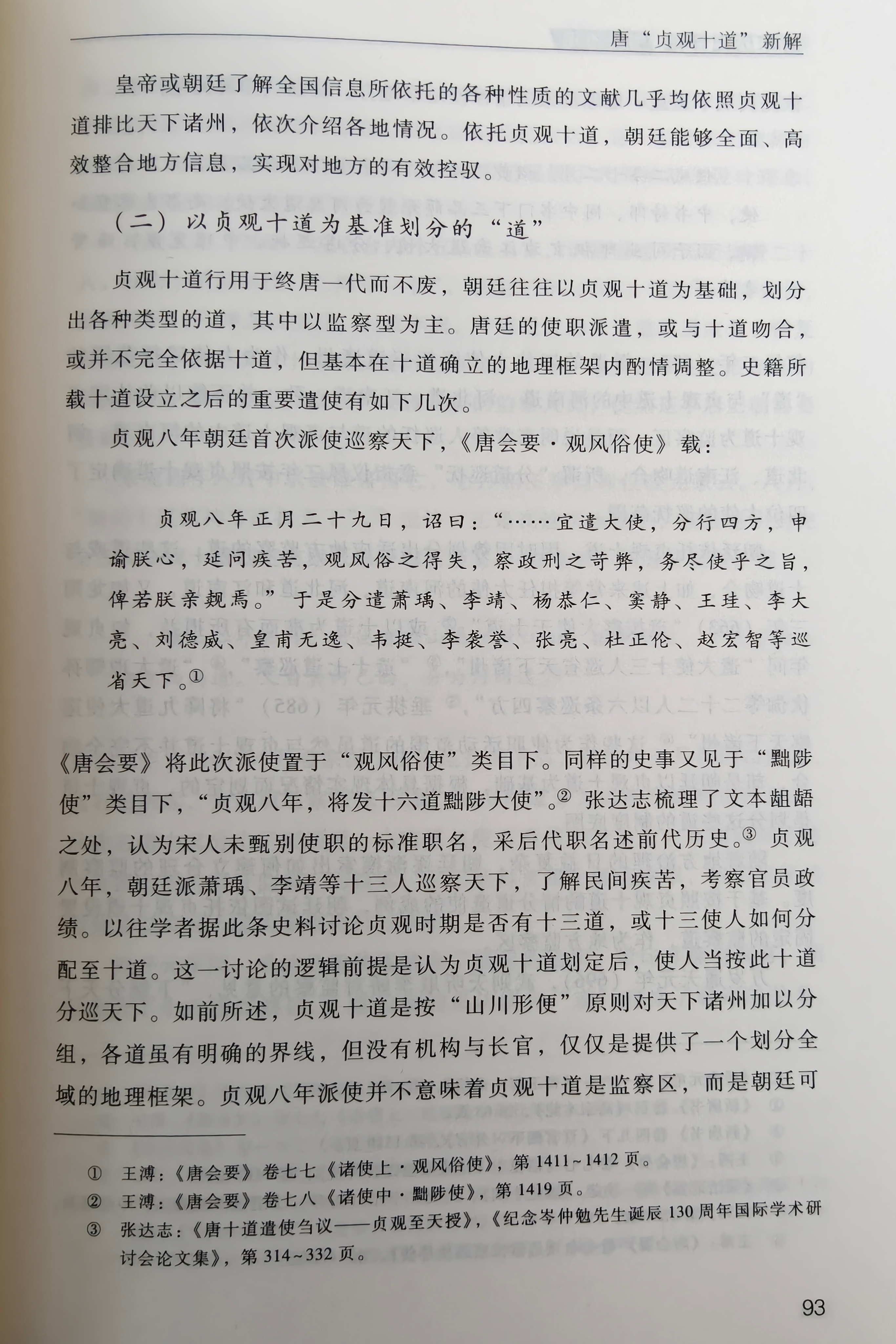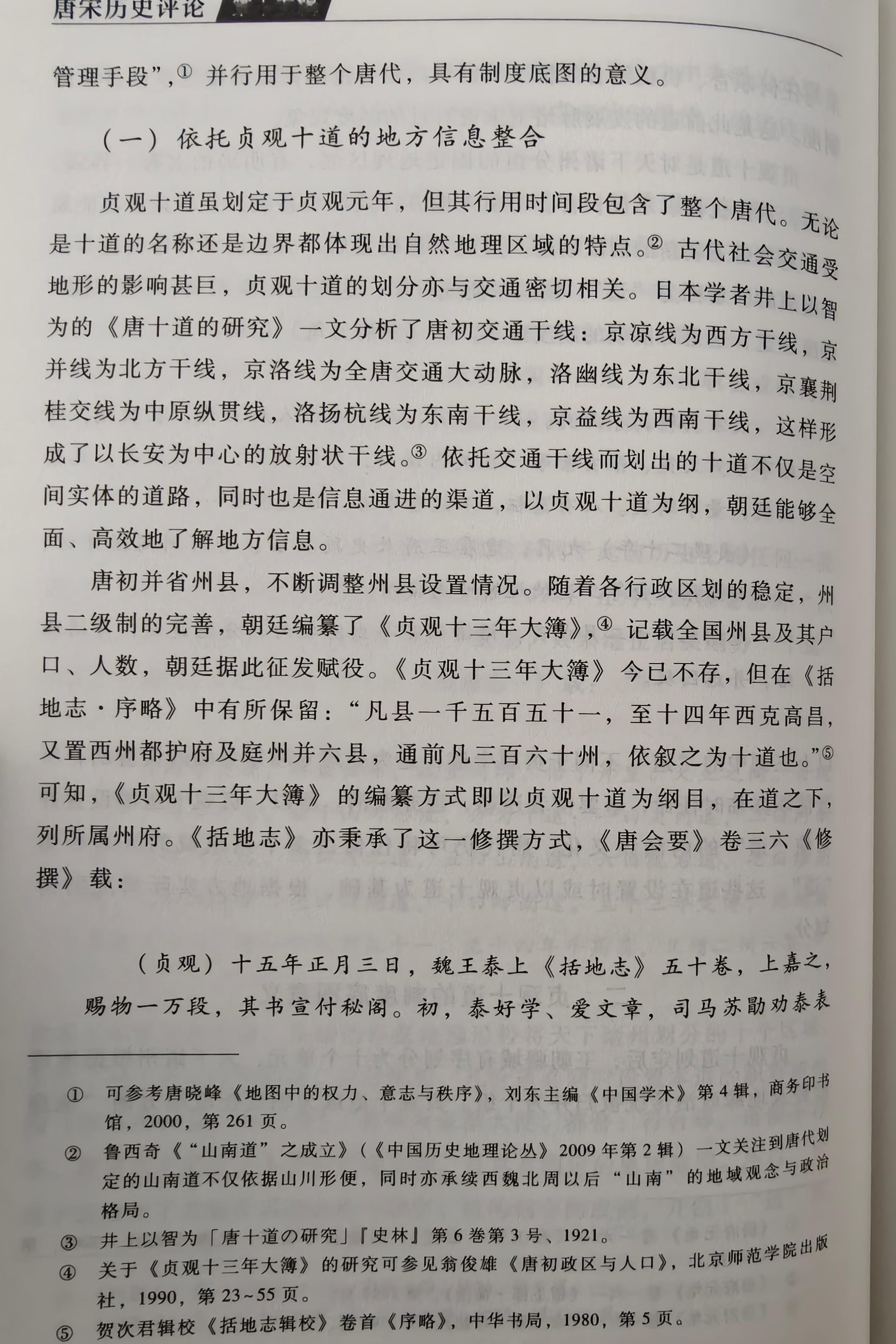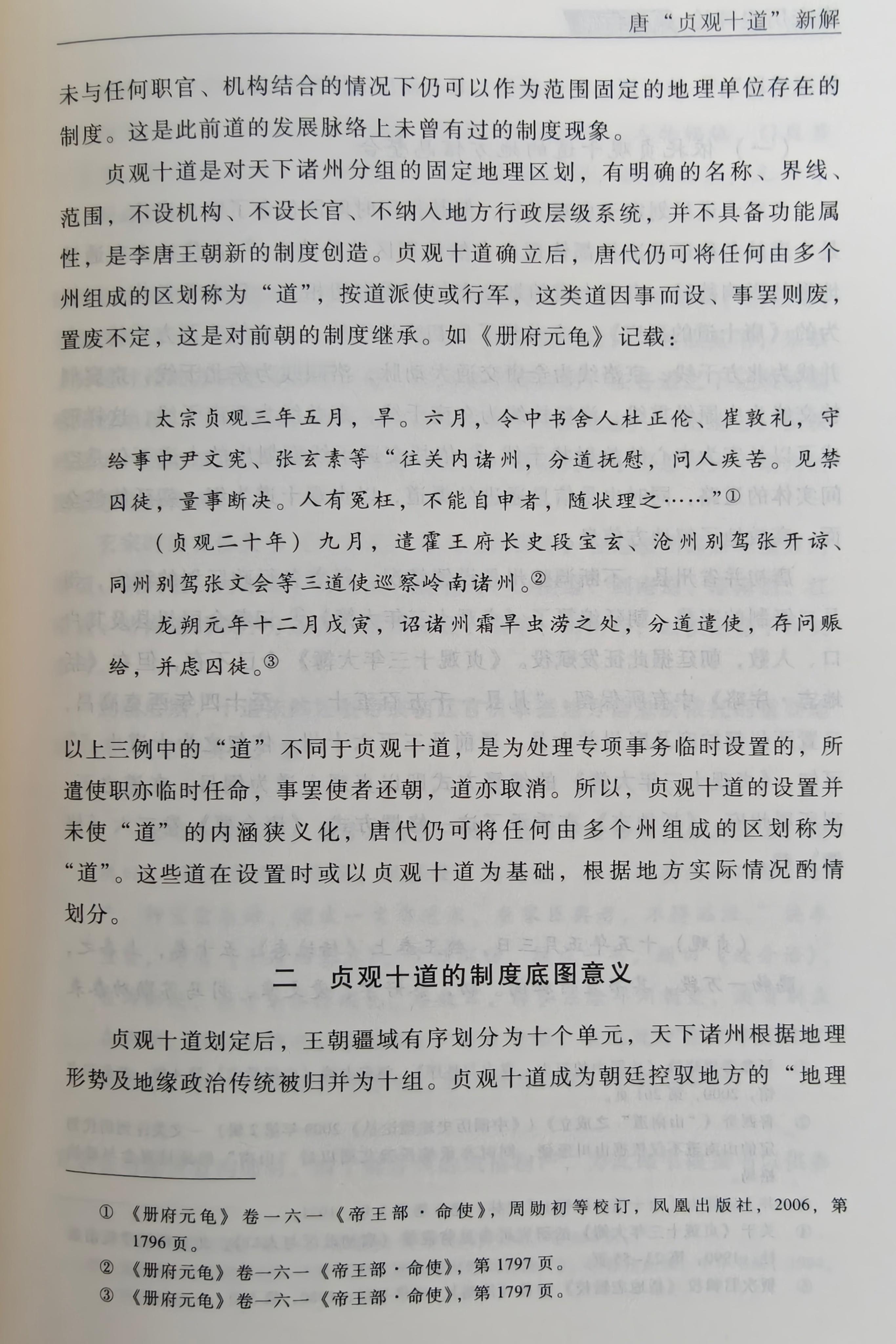 李世民 《唐“贞观十道”新解》摘要:贞观十道是唐王朝为建设大一统国家而对天下诸州分组的固定地域区划,有明确的名称、界线、范围,不设机构、不设长官、不纳入地方行政层级系统。它改变了北朝以后道必须与职官、机构结合的成例,使得“道”在未与任何职官、机构结合的情况下仍可以作为范围固定的地理单元。贞观十道具有制度底图意义,依托贞观十道,朝廷能全面、高效地整合地方信息;十道也为朝廷设立包括监察道在内的各类道提供了指引。在制度文化上,贞观十道对接《尚书·禹贡》中的“九州”,蕴含了李唐王朝构建大一统国家的理想。