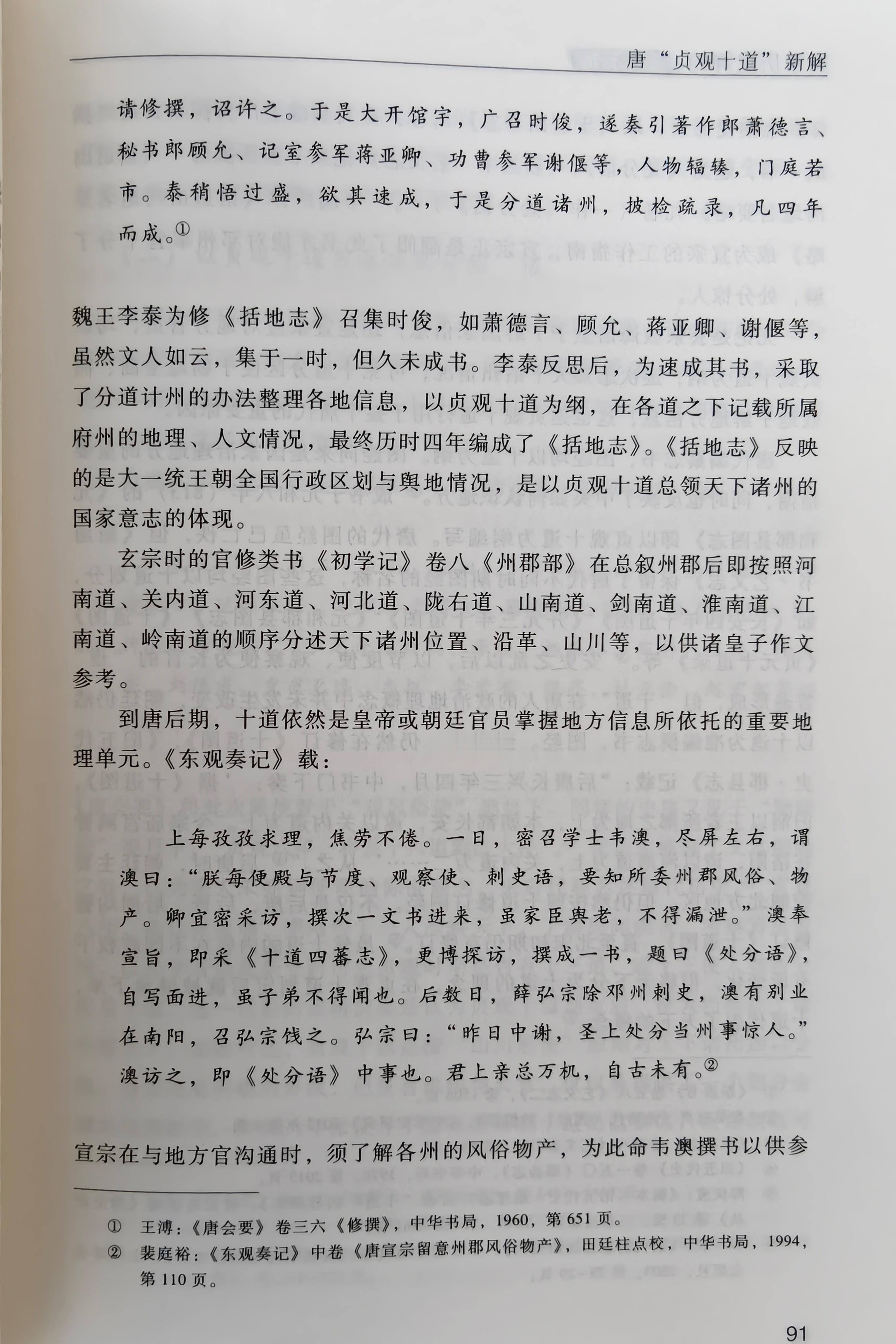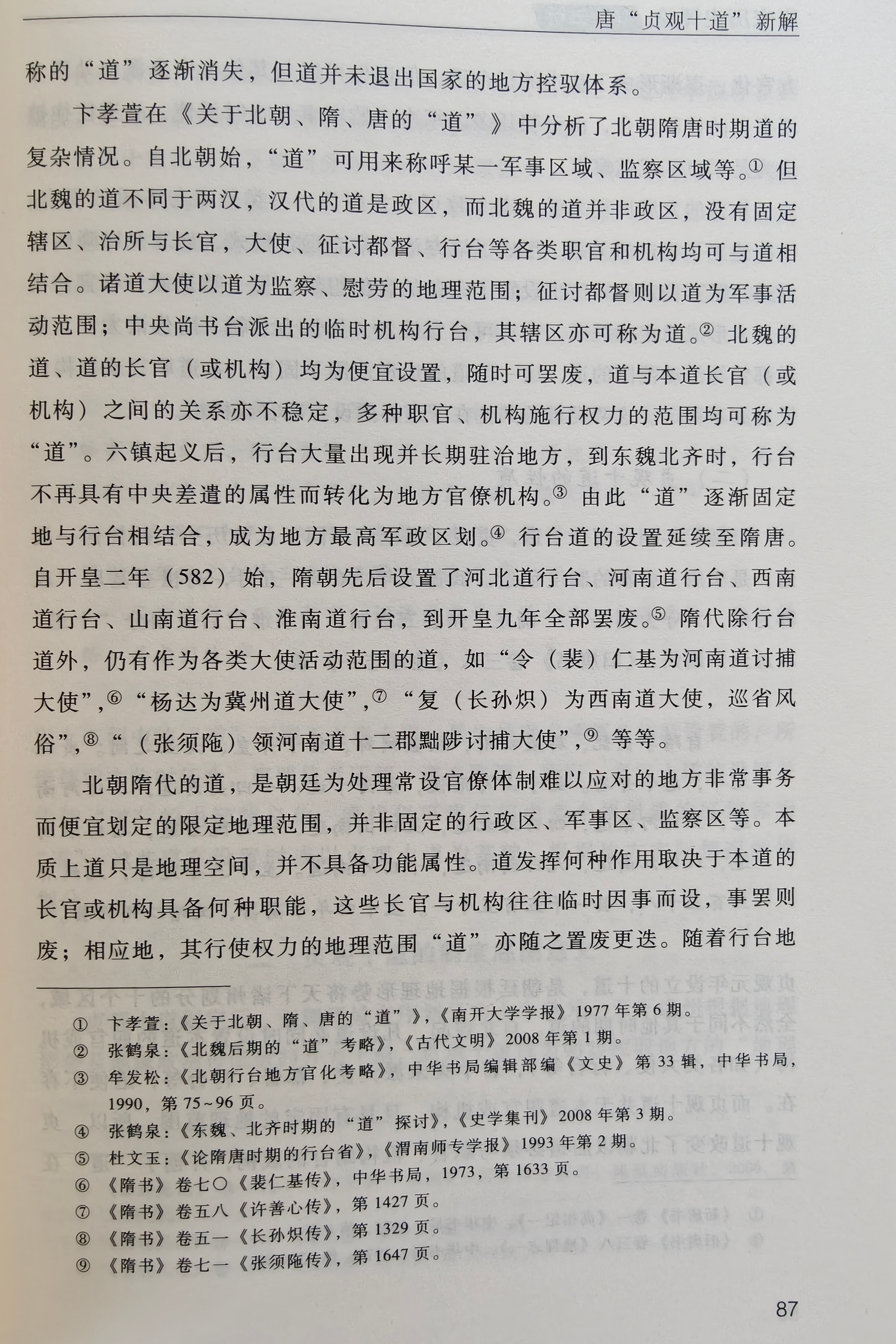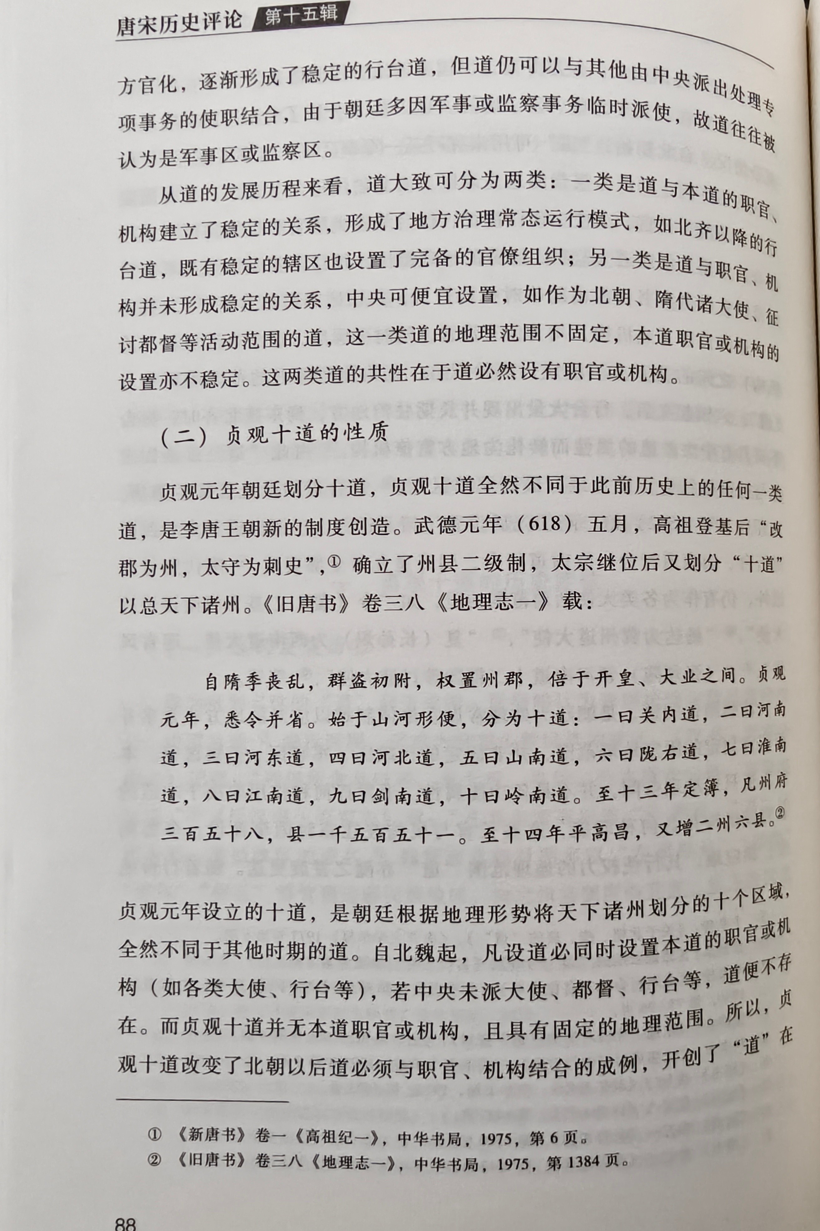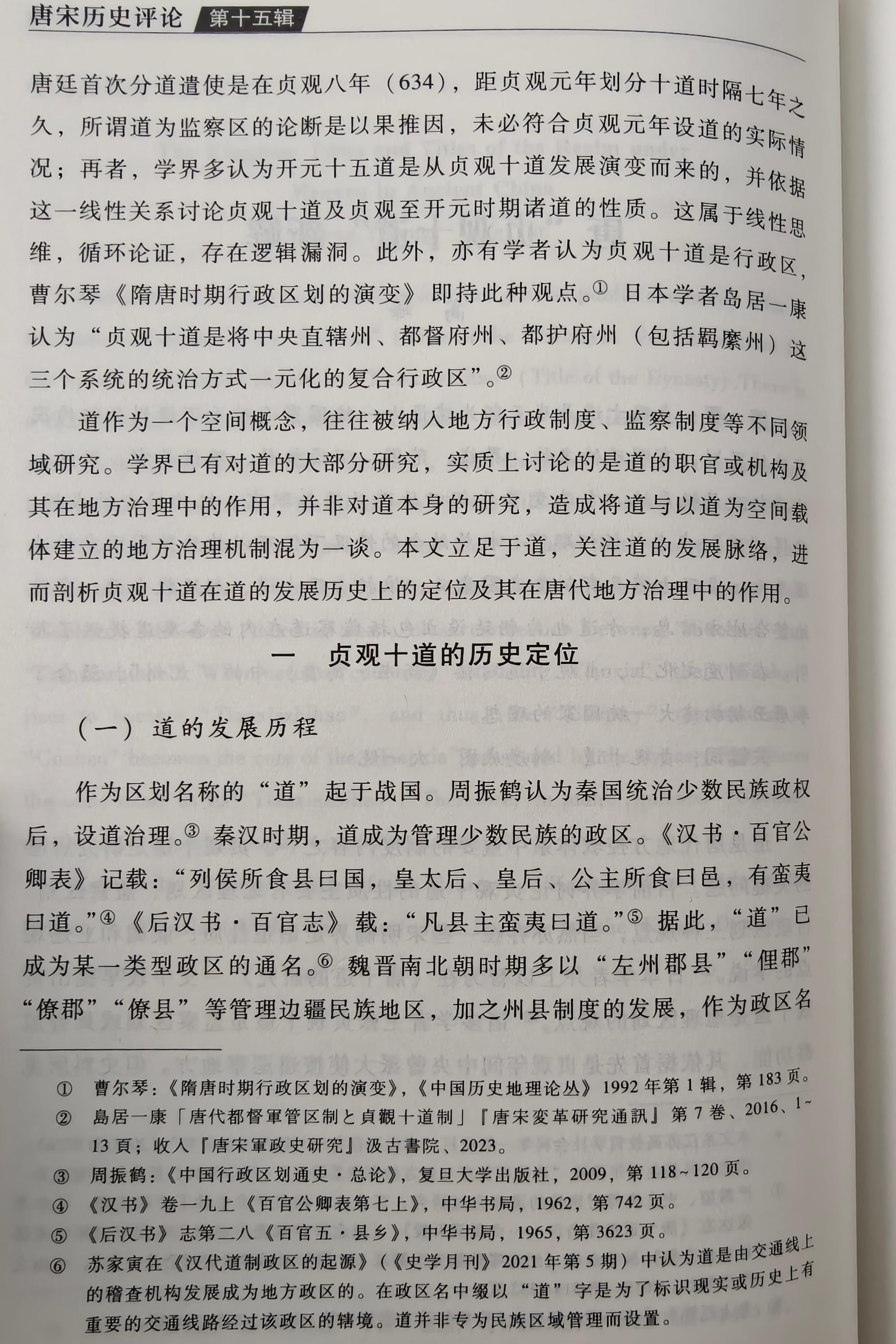 李世民 《唐“贞观十道”新解》摘要:贞观十道是唐王朝为建设大一统国家而对天下诸州分组的固定地域区划,有明确的名称、界线、范围,不设机构、不设长官、不纳入地方行政层级系统。它改变了北朝以后道必须与职官、机构结合的成例,使得“道”在未与任何职官、机构结合的情况下仍可以作为范围固定的地理单元。贞观十道具有制度底图意义,依托贞观十道,朝廷能全面、高效地整合地方信息;十道也为朝廷设立包括监察道在内的各类道提供了指引。在制度文化上,贞观十道对接《尚书·禹贡》中的“九州”,蕴含了李唐王朝构建大一统国家的理想。