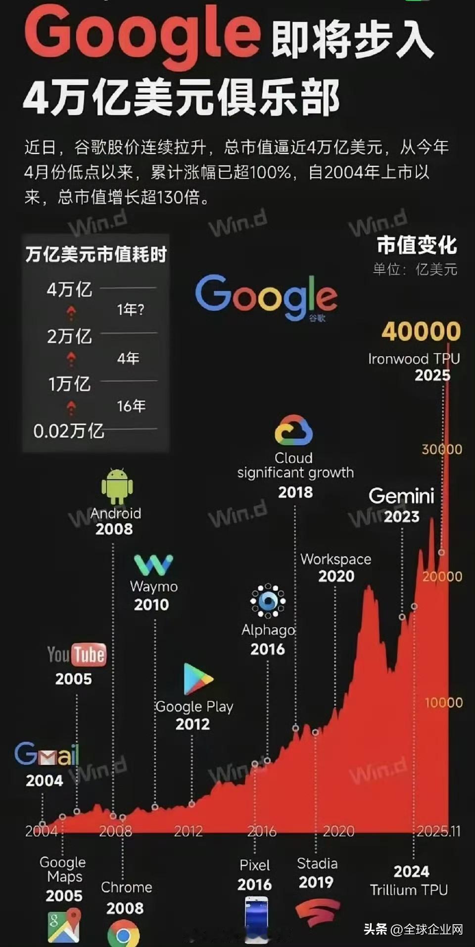 谷歌刚上市的时候只有400亿,现在几乎要突破40000亿了!用了20年时间! 这个市值,如果放在全球的话,比GDP排名第四的日本都高!从上市以来,市值增加了130倍! 谷歌靠的是什么? 战略眼光! 押宝安卓,移动支付,优步! 最开始就是做个邮箱! 看看百度,现在市值多少? 差不多都是一样的起步! 同样开始都是做的搜索! 互联网的BAT巨头。几乎要把百度踢出局了! 做了外卖,被美团收购! 做了系统,不行! 现在,你几乎想不到百度还有什么出名的也许! 搜索业务我估计也要被字节打败了! 以前动不动百度一下! 现在都是用头条搜索一下!百度都好几年不用了!