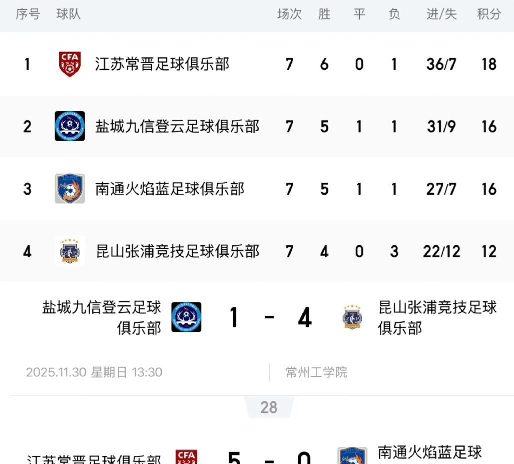 江苏常晋5:0大胜南通火焰蓝,夺得苏冠联赛冠军 苏冠联赛第七轮战罢,有望争冠的三