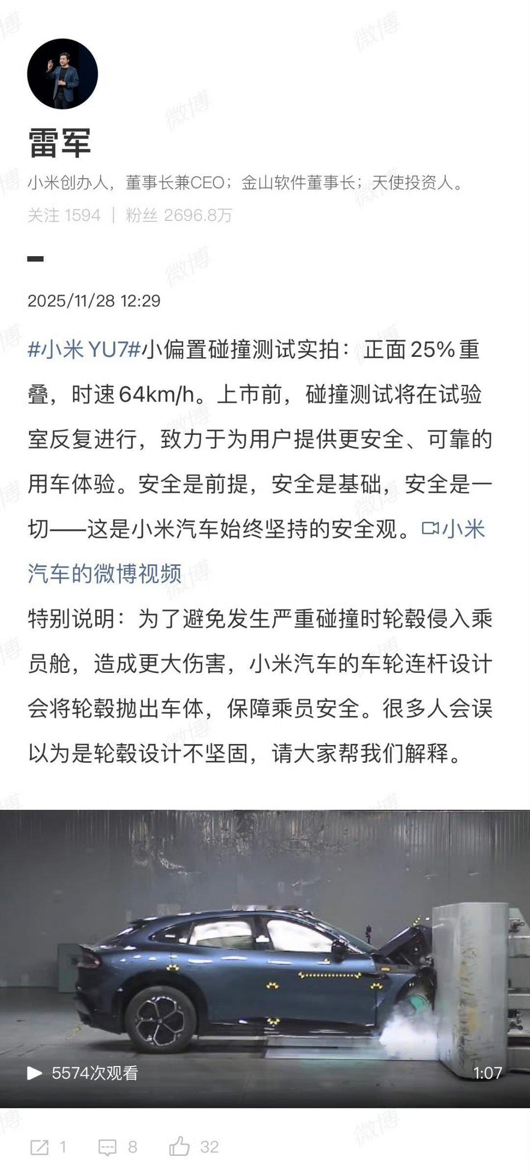 网上到处喷子带节奏黑问界汽车碰撞严重车轮连杆设计会将轮毂抛出车体,水军带节奏喷这崴脚,质量有问题,现在雷军发的说明,科普什么失胎保命的,是不是可以疯狂打黑喷子了,雷军说:小米为了避免发生严重碰撞时轮毂侵入乘员舱,造成更大伤害,小米汽车的车轮连杆设计会将轮毂抛出车体,保障乘员安全。很多人会误以为是轮毂设计不坚固,请大家帮我们解释。雷军再强调小米汽车研发理念,雷军再强调安全是前提和基础鸿蒙智行
