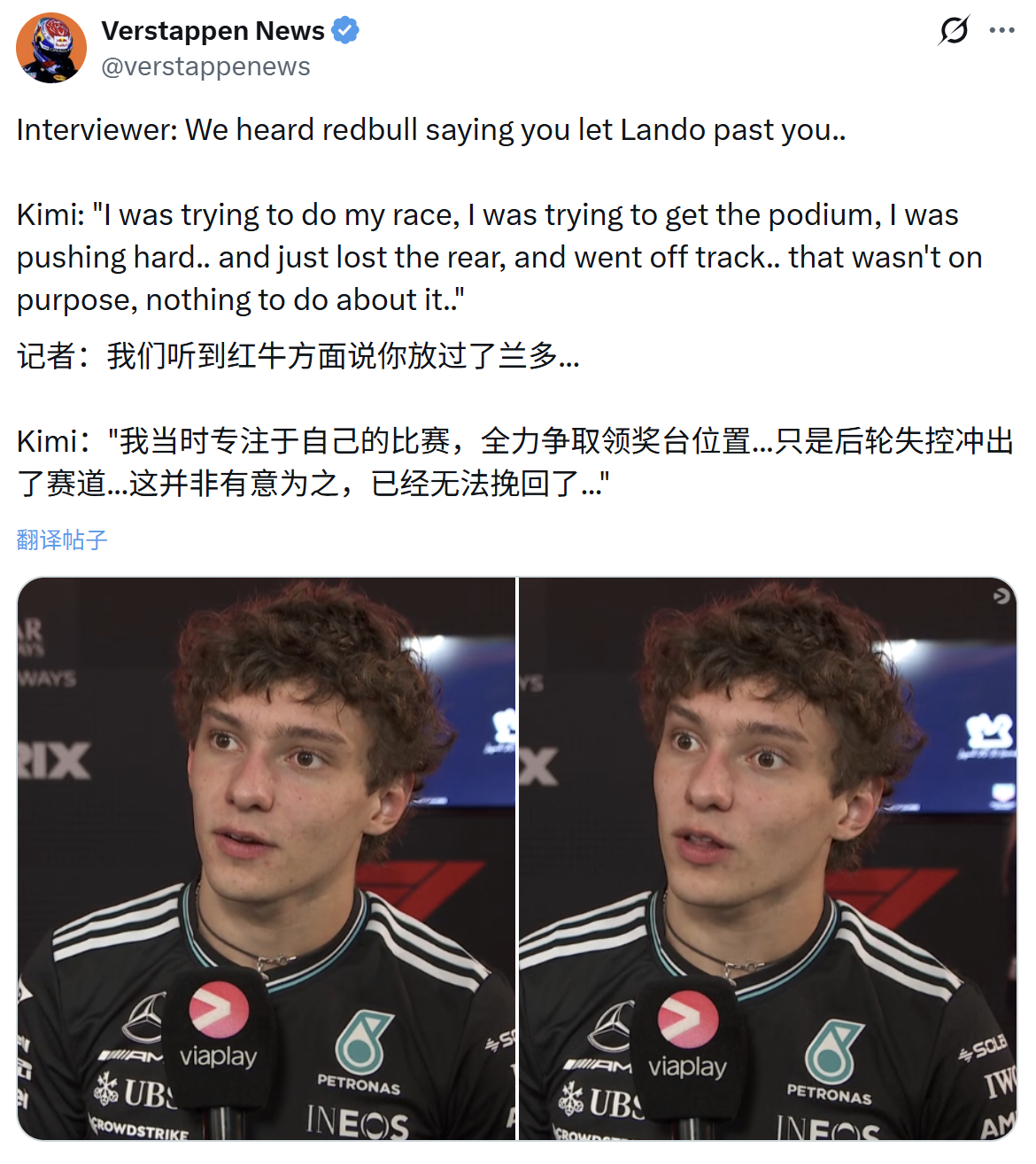 安东内利在赛后采访中谈及比赛尾声出现失误,并不是有意放过诺里斯。F12025F1卡塔尔大奖赛