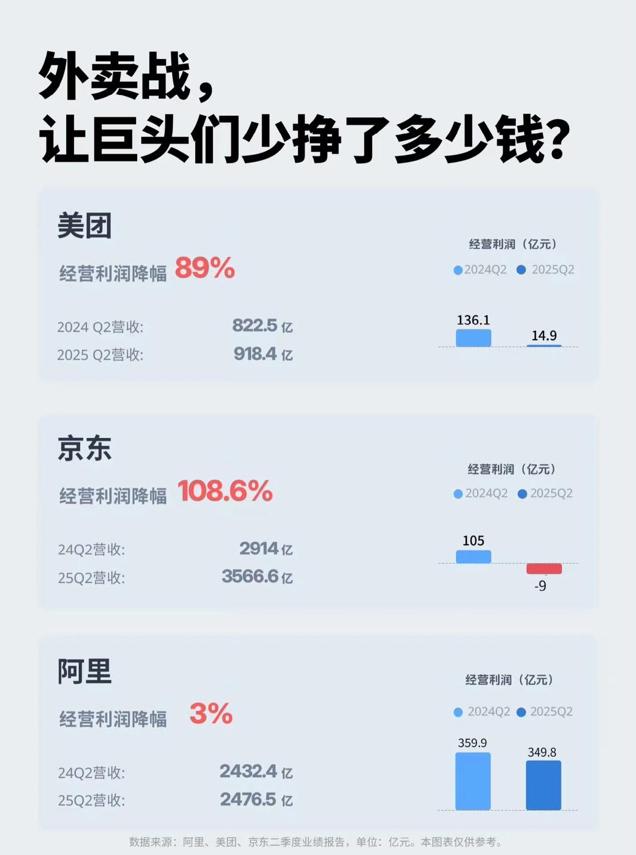 6个月烧光800亿!外卖大战落幕,没有赢家但我们看清了真相 还记得夏天的外卖有多疯狂吗?1元奶茶、0元正餐、满20减15的红包雨砸得人眼花缭乱,网友直呼“薅羊毛的春天来了”!可这场堪称互联网史上最烧钱的大战,才打了6个月就凉了——三巨头三季度财报集体“爆雷”,美团亏了160亿,京东、阿里也没逃过亏损,800亿真金白银烧完,只留下一地鸡毛。 消费者看似赚了,可后来发现奶茶小料多到卡喉、炸鸡换成了鸡胸肉,为凑满减点的食物吃不完全浪费;骑手跑12小时赚的钱还不如以前5小时;商家为了扛住低价,只能悄悄降品质。原来“低价狂欢”都是套路,平台亏不起,商家扛不住,最后还是我们吃了品质的亏。 监管出手叫停恶性内卷太及时了!其实大家要的不是0元外卖,而是花合理的钱吃放心饭。这场大战虽没赢家,却让行业回归理性。 你夏天薅到最多的外卖补贴是多少?现在点外卖还会为了满减凑单吗?评论区聊聊你的真实经历~ 外卖大战没有真正赢家 反内卷 消费理性
