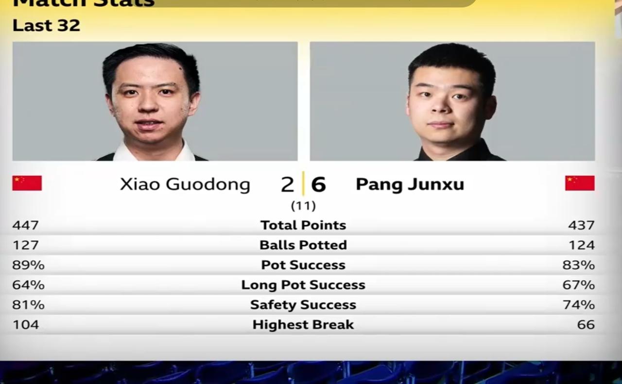 英锦赛肖国栋被淘汰 正赛的第二天迎来中国打比,由武汉公开赛卫冕冠军,种子选手肖国栋迎战资格赛杀上来的庞俊旭,最终结果是肖主播被2:6淘汰,成为英锦赛第一个被淘汰的种子选手。 其实国栋自卫冕战以来状态都不很好,进攻的准度和防守的安全球都有问题,尤其是缠斗上失分不少,技术统计表明,总得分,进球数,安全球,成功率,最高分,破百杆均略好于庞,只是长台命中率差于庞。全部都输于缠斗上。过去给人印象的稳不见了。这是国栋今后要注意的地方。 老马6:4淘汰了土豆哥吉尔伯特,晋级八分之一决赛对庞太师,希望庞要有必胜的信心,敢在准神身上抢分,不然的话就别想晋级。