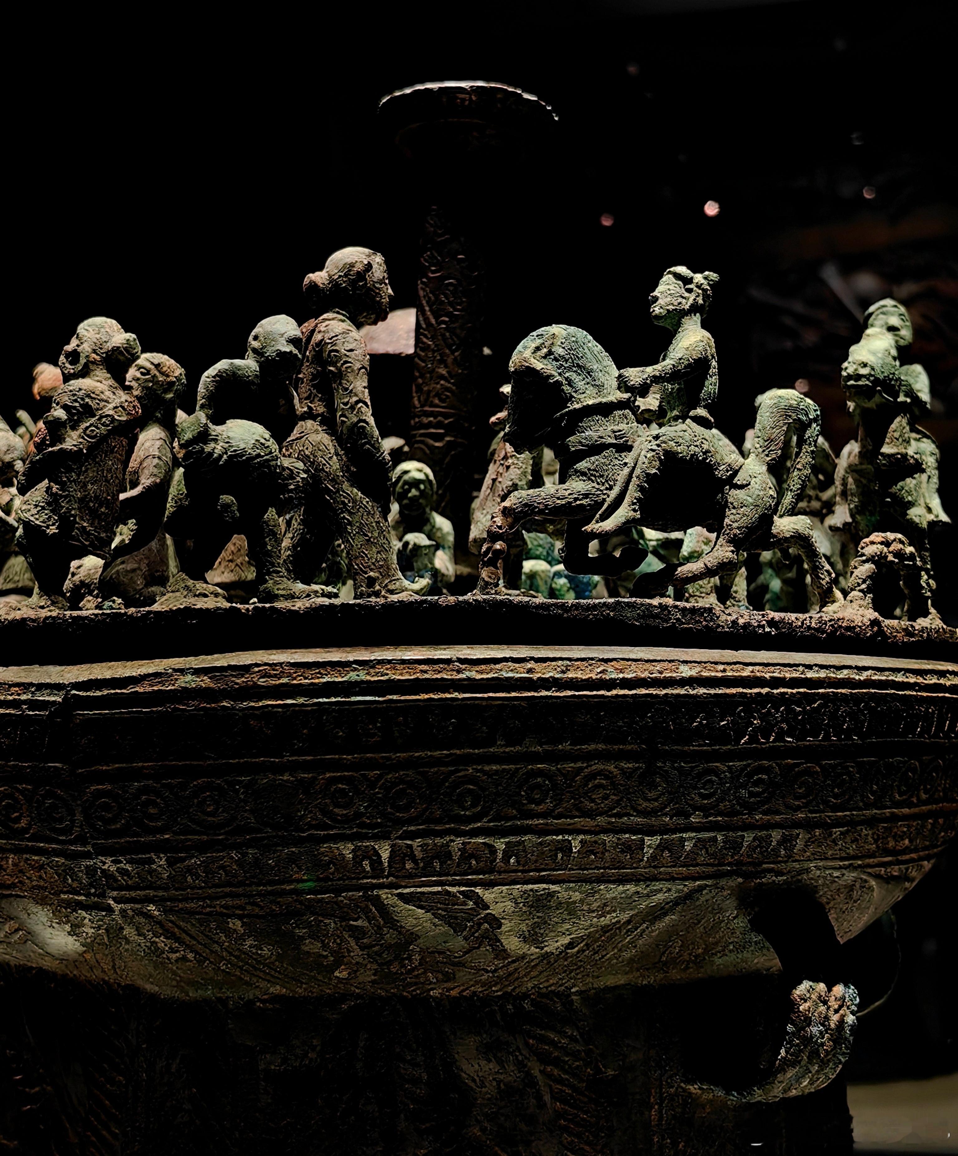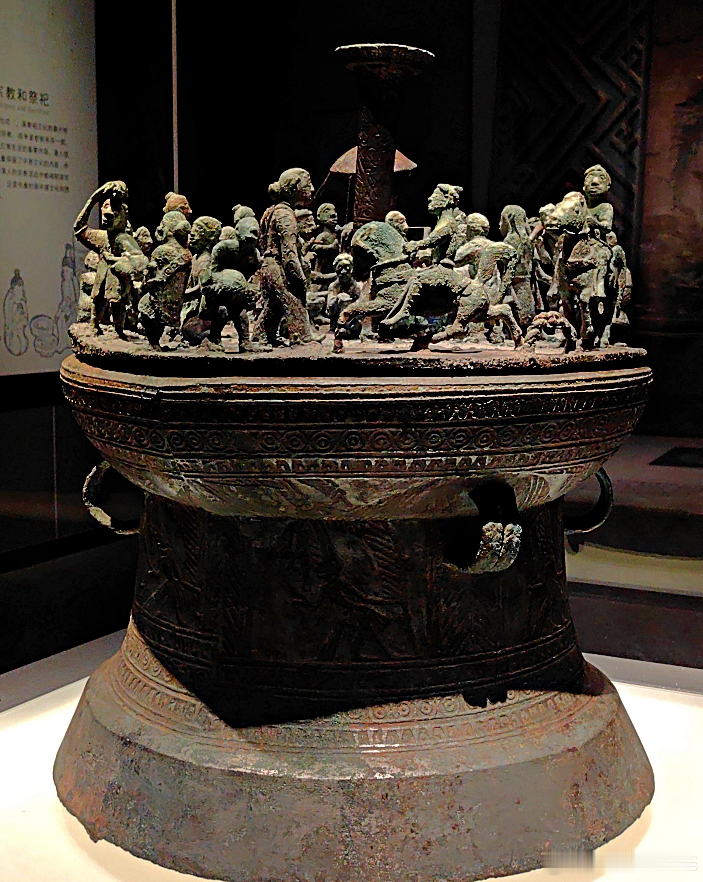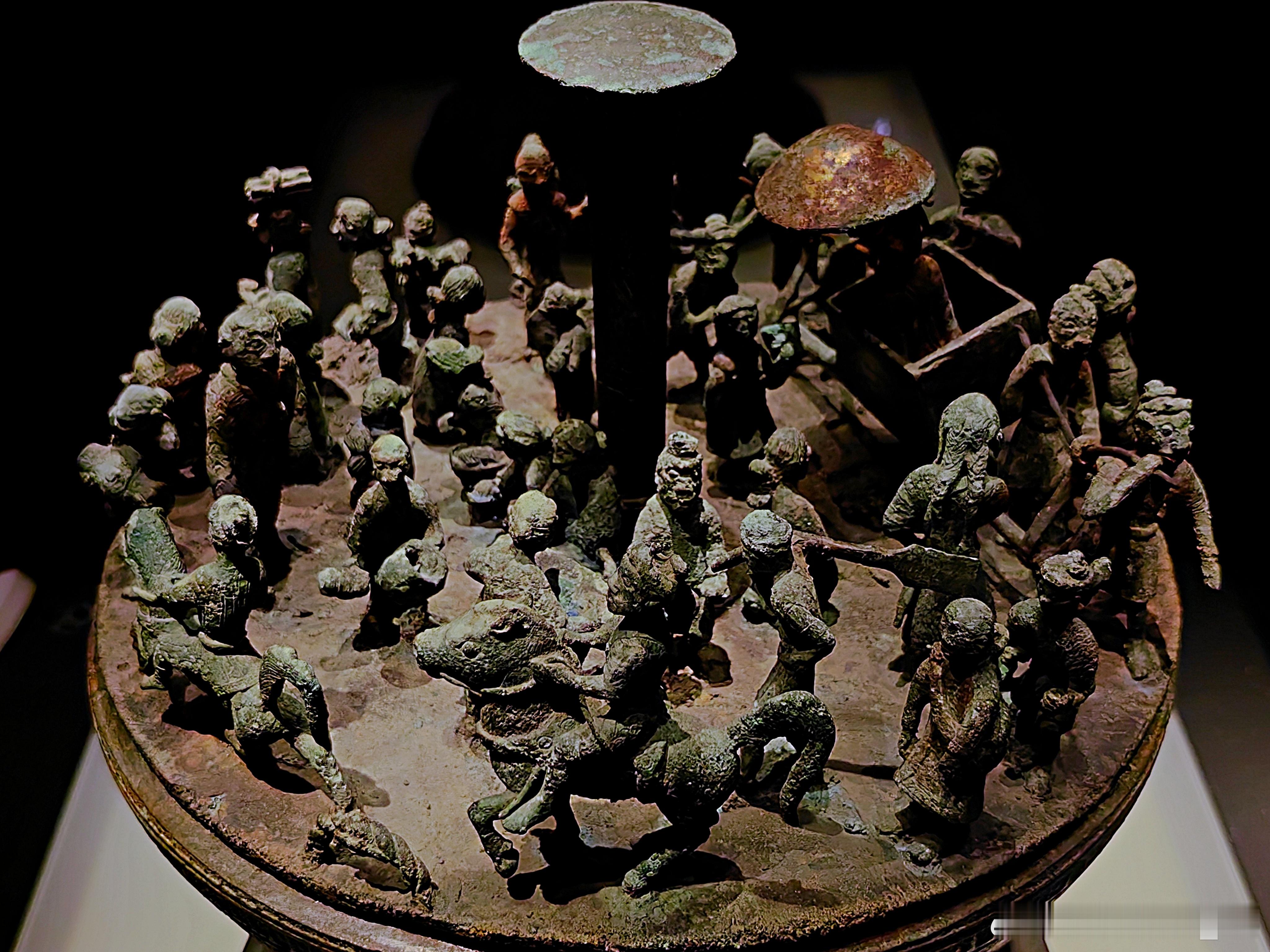 祭祀场面铜贮贝器西汉(公元前202-公元8年)云南省博物馆藏1992年出土于云南江川李家山69号墓,通高40厘米、盖径33.3厘米。器身为铜鼓形,腰间设4个绳纹耳、扁矮足,器身饰有羽人划船纹、舞蹈纹、弦纹、三角齿纹及同心圆纹等图案;器盖铸有35个人物与2匹马,核心是“鎏金妇人坐肩舆(轿子)”的场景,伴随执伞侍从、骑士开道,周围还有扛铲、顶物、交易的人物。以“祭祀+赶集”为主题,展现了古滇国贵族主持农业祭祀、同时进行集市交易的场面。2024.8.29