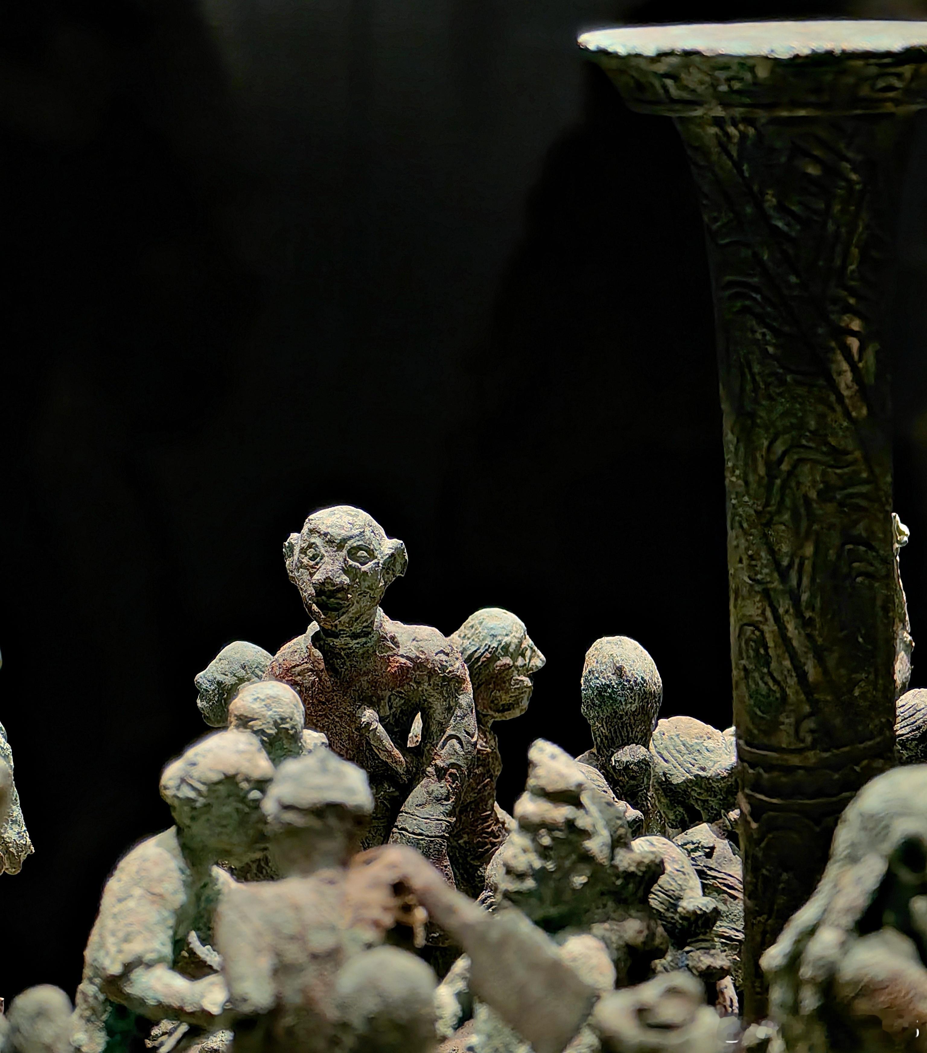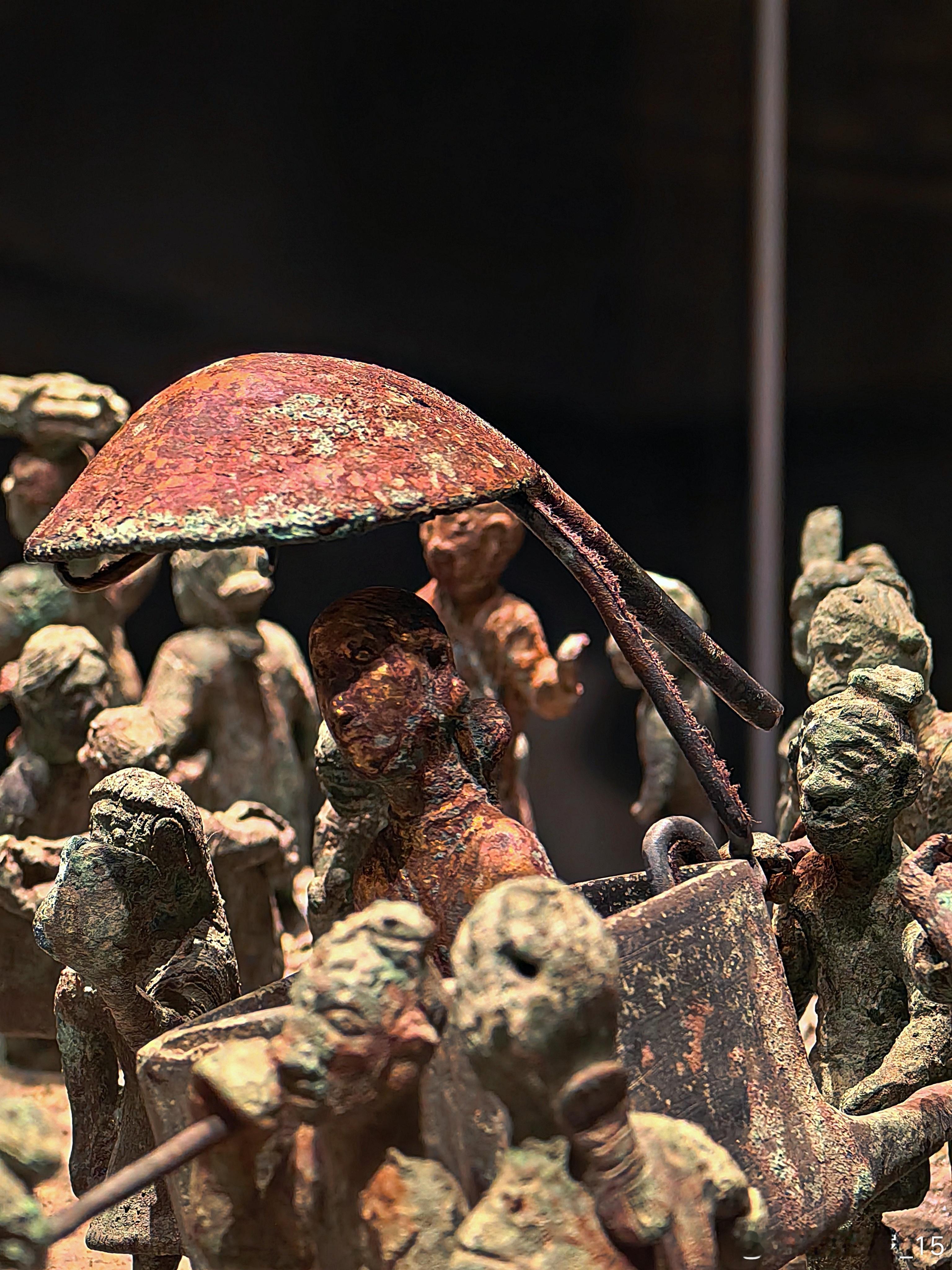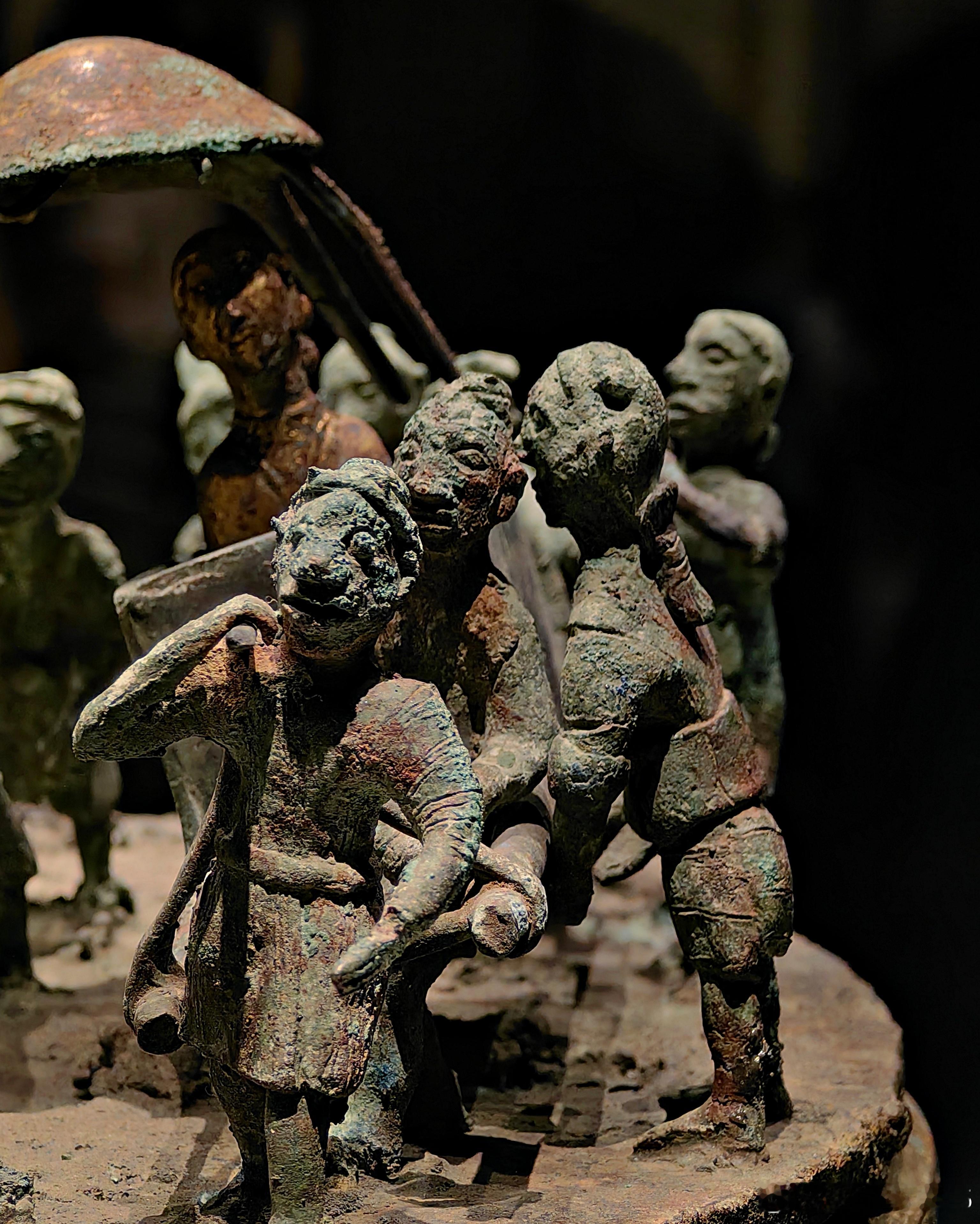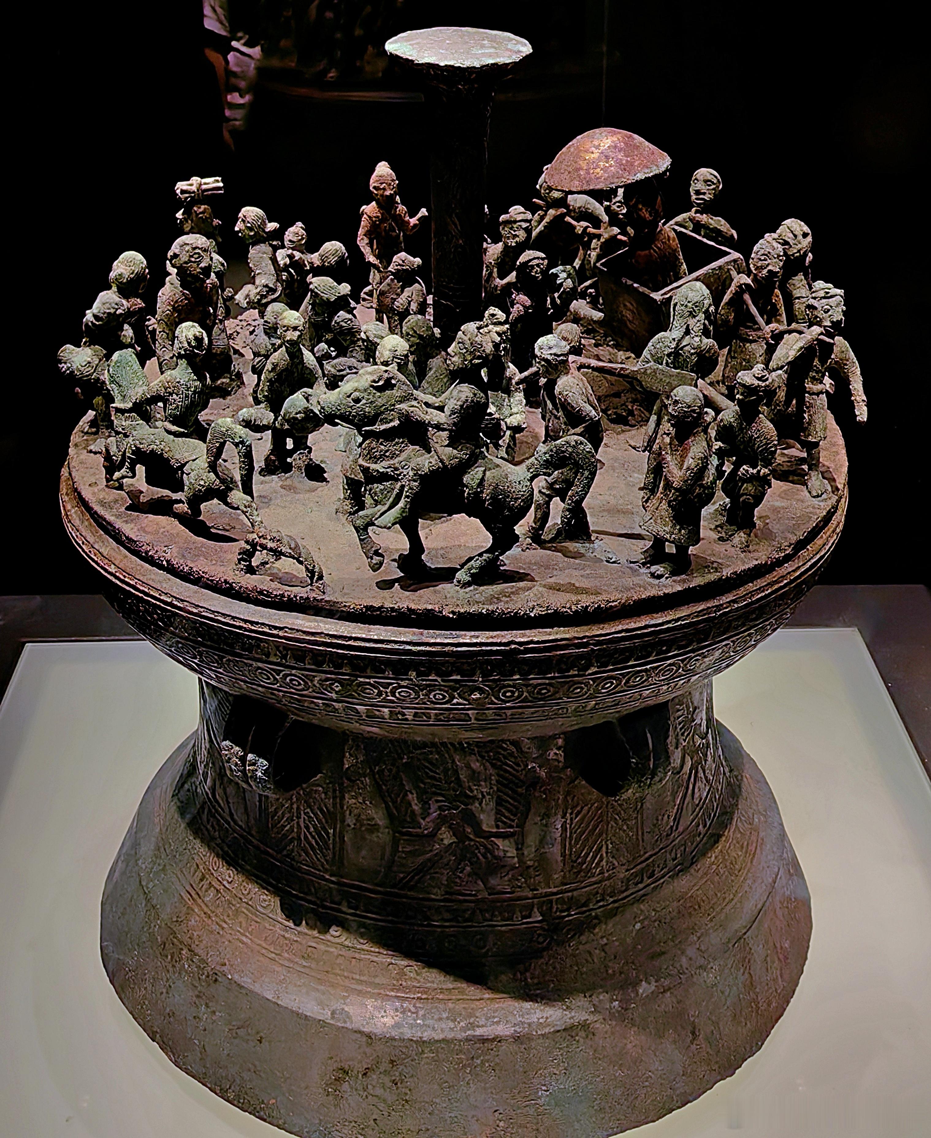 祭祀场面铜贮贝器西汉(公元前202-公元8年)云南省博物馆藏1992年出土于云南江川李家山69号墓,通高40厘米、盖径33.3厘米。器身为铜鼓形,腰间设4个绳纹耳、扁矮足,器身饰有羽人划船纹、舞蹈纹、弦纹、三角齿纹及同心圆纹等图案;器盖铸有35个人物与2匹马,核心是“鎏金妇人坐肩舆(轿子)”的场景,伴随执伞侍从、骑士开道,周围还有扛铲、顶物、交易的人物。以“祭祀+赶集”为主题,展现了古滇国贵族主持农业祭祀、同时进行集市交易的场面。2024.8.29