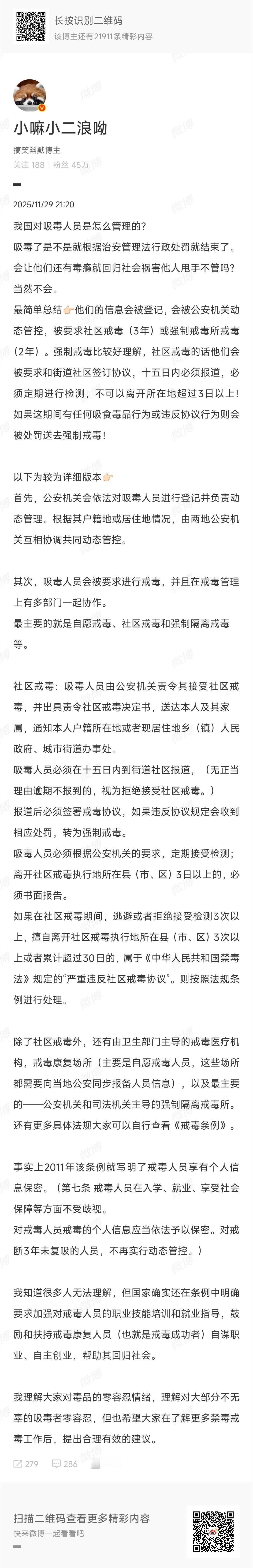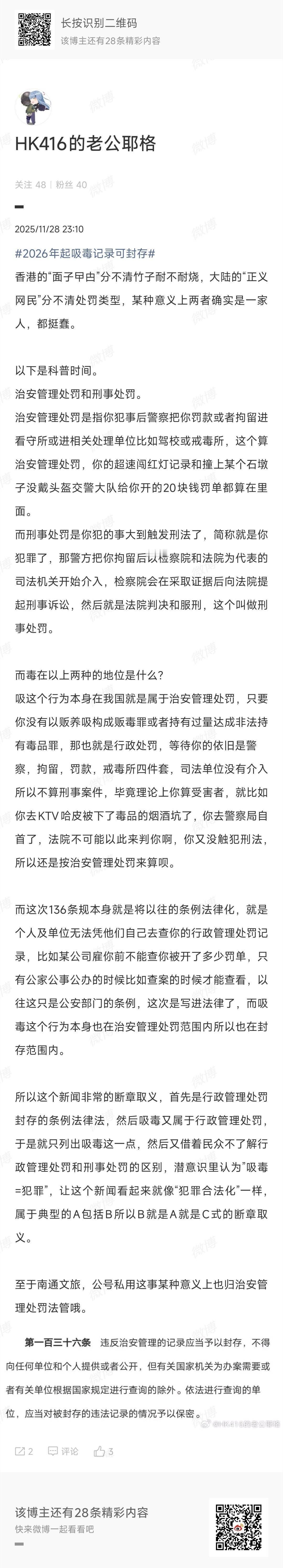 记录者 那么多人扯淡,都是在纯法律角度上“刻舟求剑”,有意思吗?涉毒,它真的非常严重,因为“成瘾”,难以彻底“戒断”,所以它不能跟嫖娼、酒驾、不系安全带、猥亵等等摆在一起来“相提并论”。个人觉得,涉毒,单列,以后就专门列入刑事管理范畴,也别让治安管理法行政处罚来掺和了!