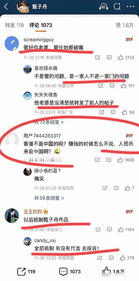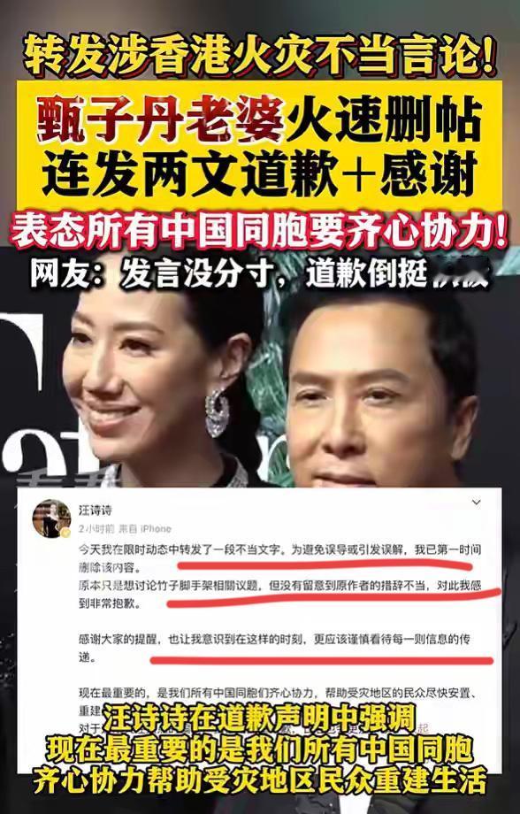香港功夫巨星甄子丹的评论区被你网友攻陷了! 就因为甄子丹的老婆在境外自媒体转发了一个帖子。 这个帖子的原文我没有搜到; 据说是把香港大浦宏福苑火灾元凶归结到大陆防火材料不合格。 被网友爆出来之后,合格婆娘迅速删帖道歉。 说是自己是转发的,无心之过。 当时只是想讨论竹子脚手架问题,没想到原文有不当文字; 说自己当时没看清,转发此文误导了大家,现在道歉。 希望大家不要关注点在她身上,而是中国同胞齐心协力,帮助受灾民众重建家园。 我的天,真是轻描淡写啊,这人立场有严重问题,本来想转移矛盾,带带节奏。 没想到被网友抓住并识破,不得已就蜻蜓点水道个歉。 网友在甄子丹评论区留言,让他管好她婆娘的破嘴,不要瞎咧咧。 更有人说,你没看清,就转发评论,评论个鸡毛啊。 这些人,有意思吗,吃饭砸锅的事,还是少做为妙!!