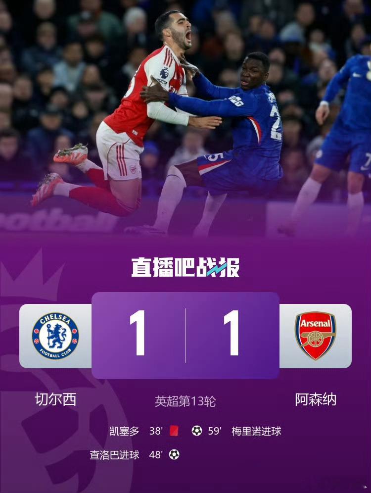 肉搏平局!切尔西1比1阿森纳 凯塞多半场红牌,查洛巴破门,梅里诺扳平;阿森纳5分优势领跑,切尔西第三 凯塞多红牌切尔西vs阿森纳
