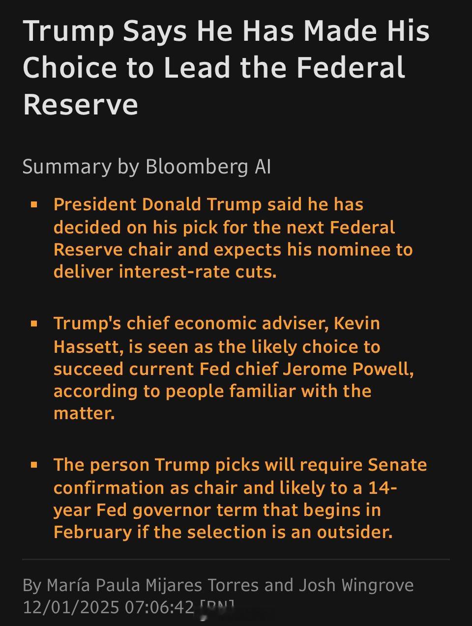 据传:美联储主席鲍威尔将于12月1日辞职。