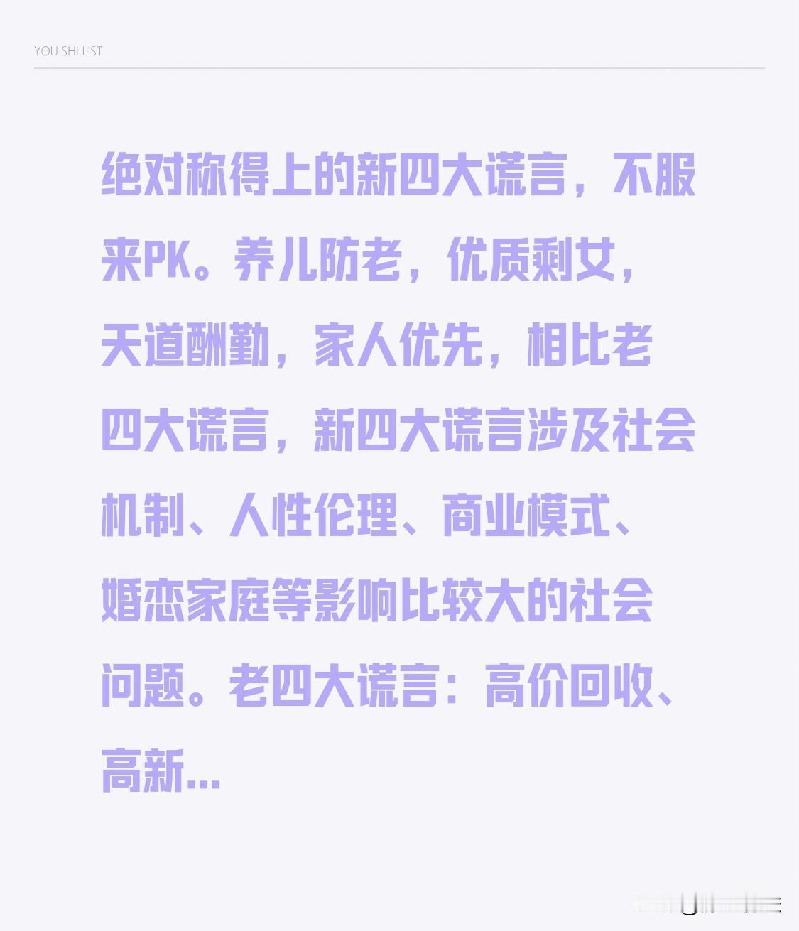 绝对称得上的新四大谎言,不服来PK。 养儿防老, 优质剩女, 天道酬勤, 家人优先, 相比老四大谎言,新四大谎言涉及社会机制、人性伦理、商业模式、婚恋家庭等影响比较大的社会问题。 老四大谎言:高价回收、高新诚聘、旺铺出租、亏本甩买。只是某行业某些商家的不良行为。 有没有网友总结更有代表性的新四大谎言!PK一下。