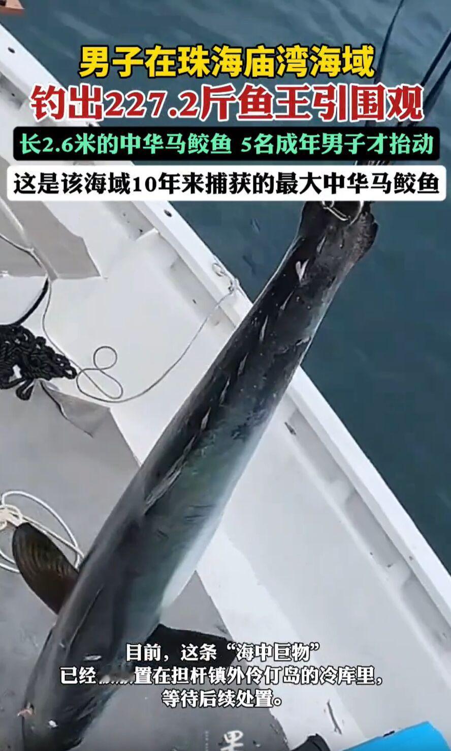 2025年11月29日,珠海万山区担杆镇庙湾海域可热闹了!一男子钓上一条长2.6米、重227.2斤的中华马鲛鱼,这可是该海域10年来捕获的最大中华马鲛鱼,得5名成年男子才能抬动。现场大批游客、渔民围观,大家手机屏幕都对准这条“海中巨物”。 万山群岛的海水“咸淡交织”,是洄游鱼的驿站,吸引不少海钓爱好者。目前,这条鱼被放在担杆镇外伶仃岛的冷库里。至于后续处置,官方和当事人都没说法。朋友圈有人建议做成标本科普,也有人有其他想法,大家都很期待它的最终归宿。