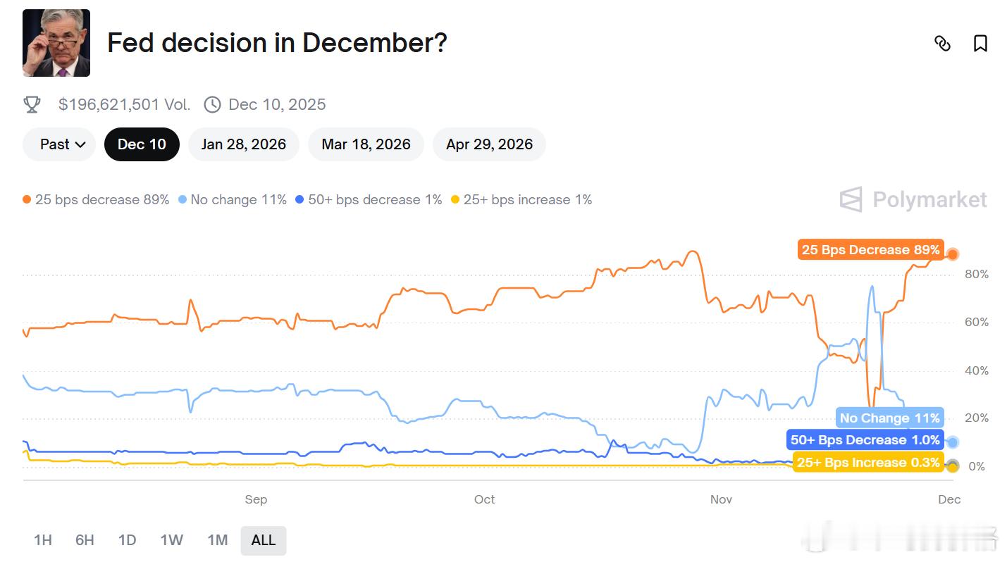 Polymarket:12月降息概率89%已经接近11月时的概率峰值(90%)