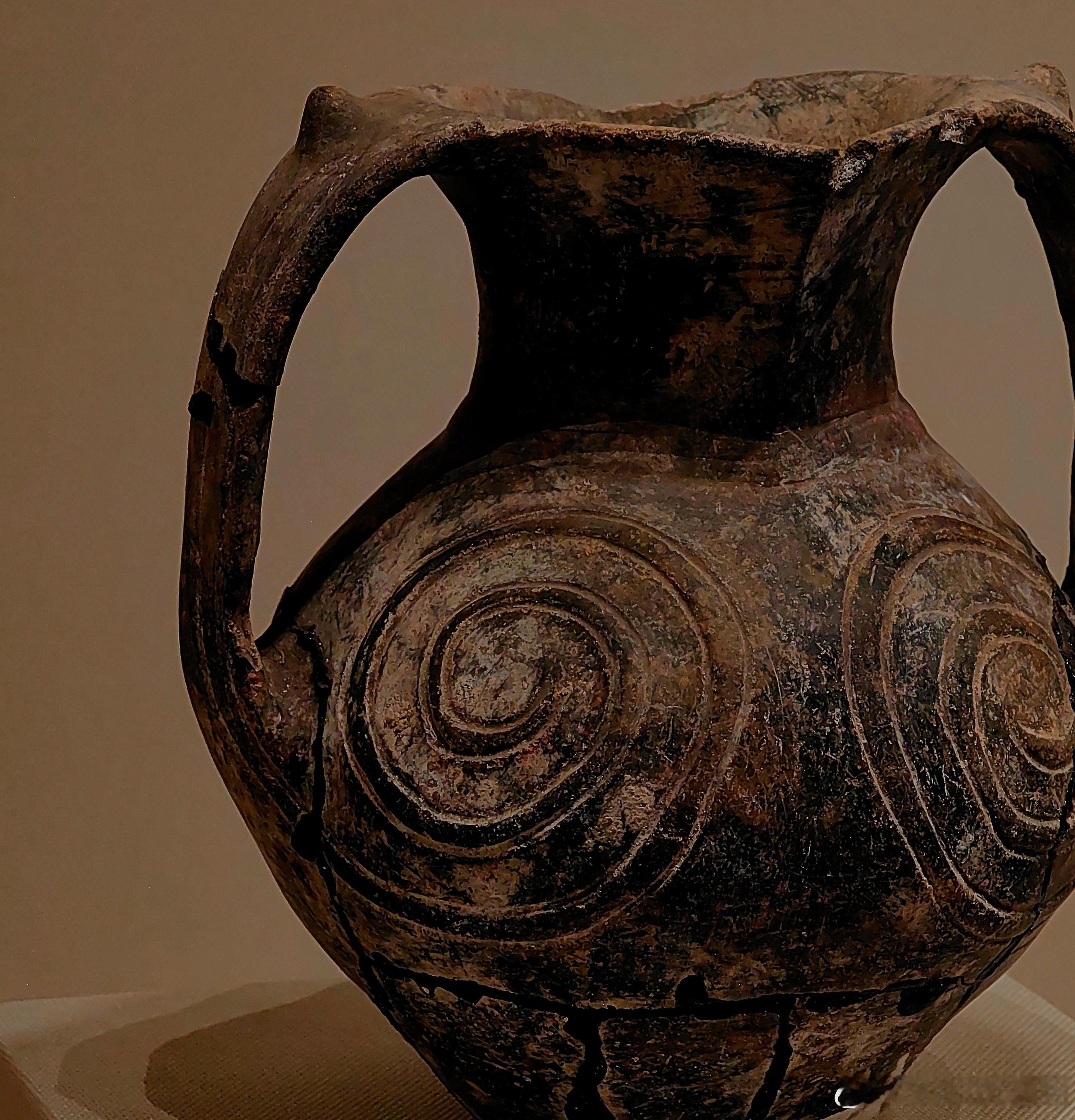 涡纹双耳陶壶战国(公元前475-前221年)云南省博物馆藏1976年德钦县纳古村石棺墓群出土采集。通高18厘米,最大径17.5厘米。残损修复。现收藏于云南省博物馆。陶罐为泥质灰陶,小口,肩至腹饰黑色同心圆纹,表面均有黑衣,打磨光滑。这种类型的双耳陶罐考古界又称为安佛拉式陶罐。2024.8.29