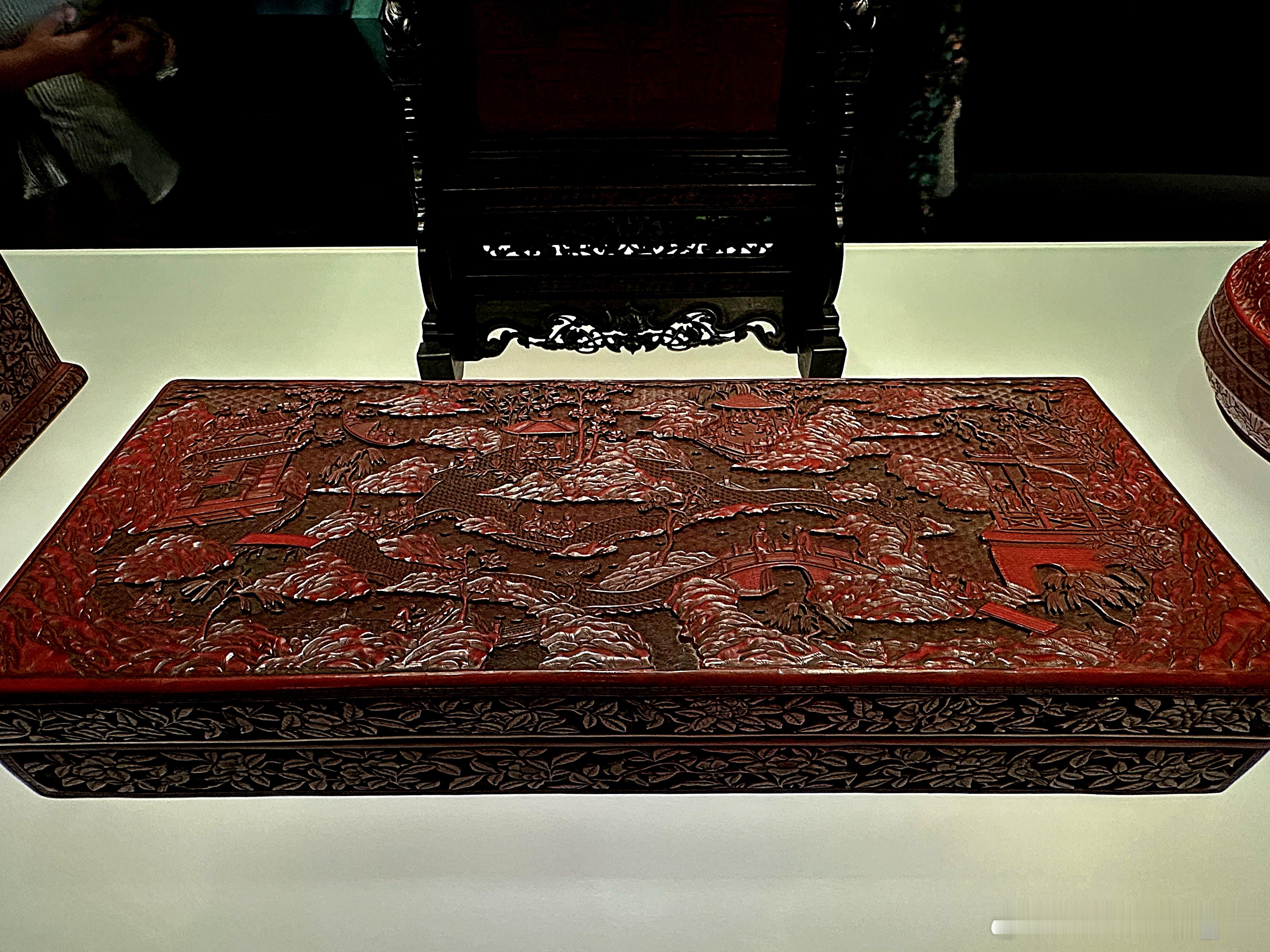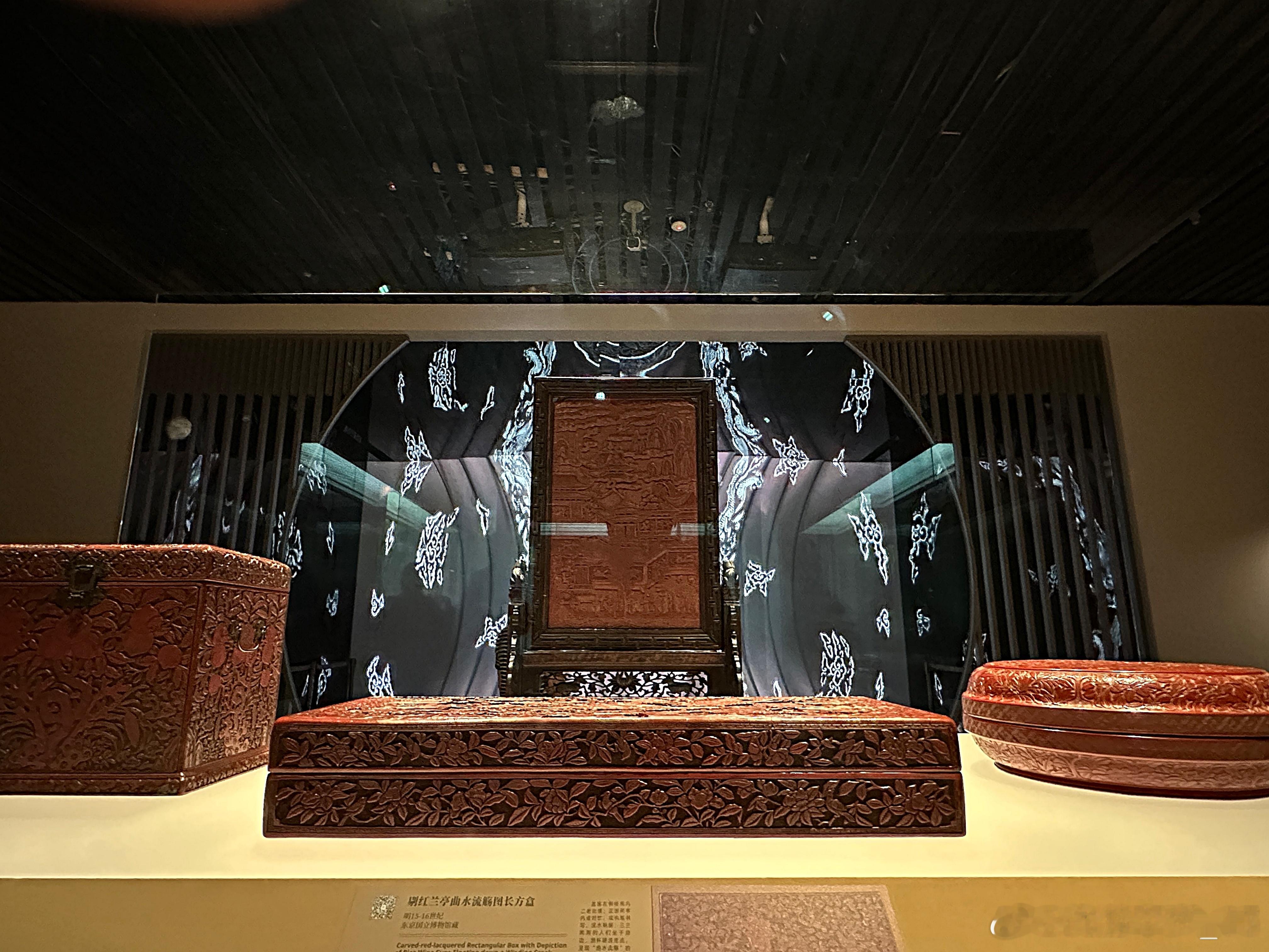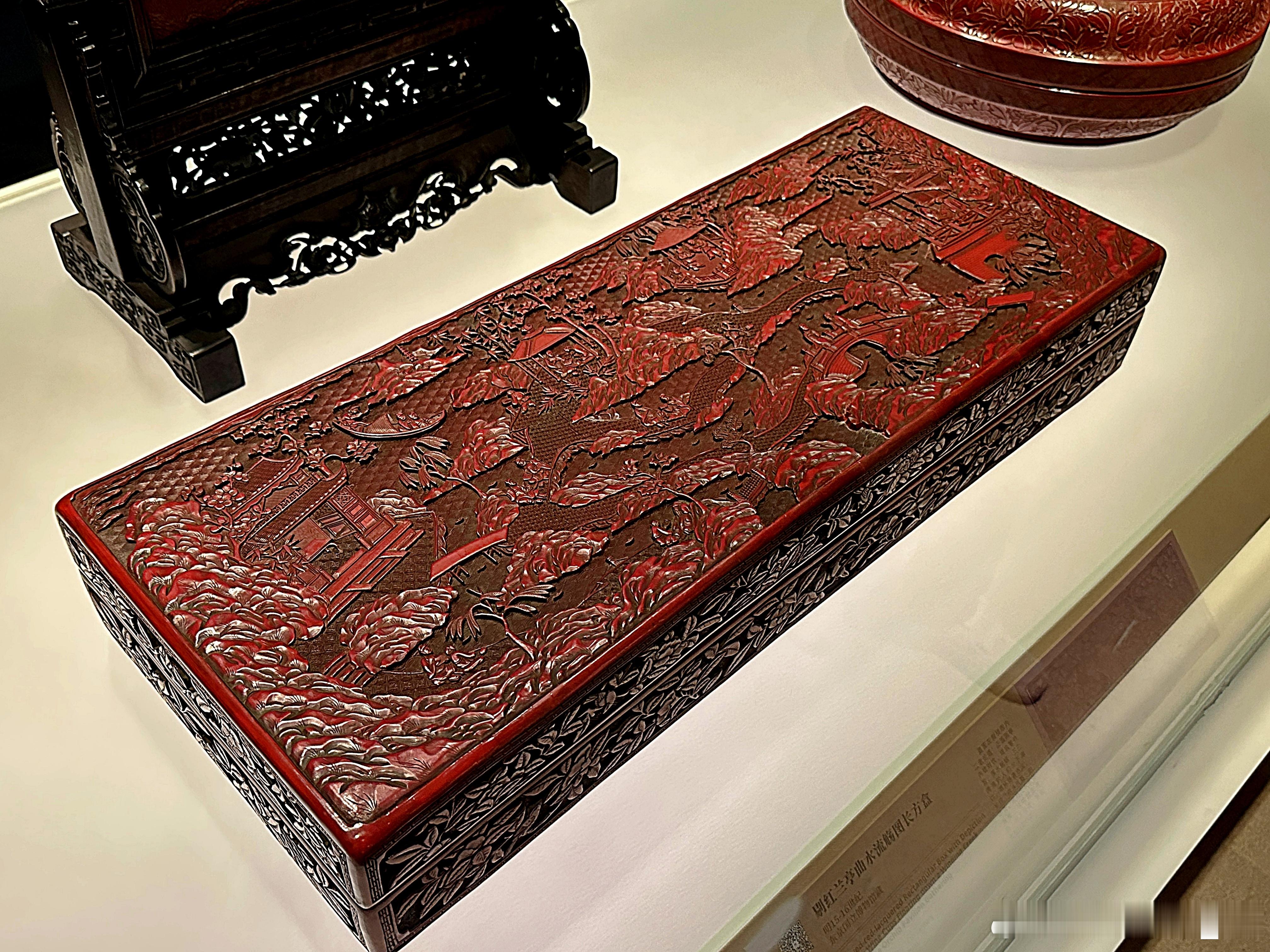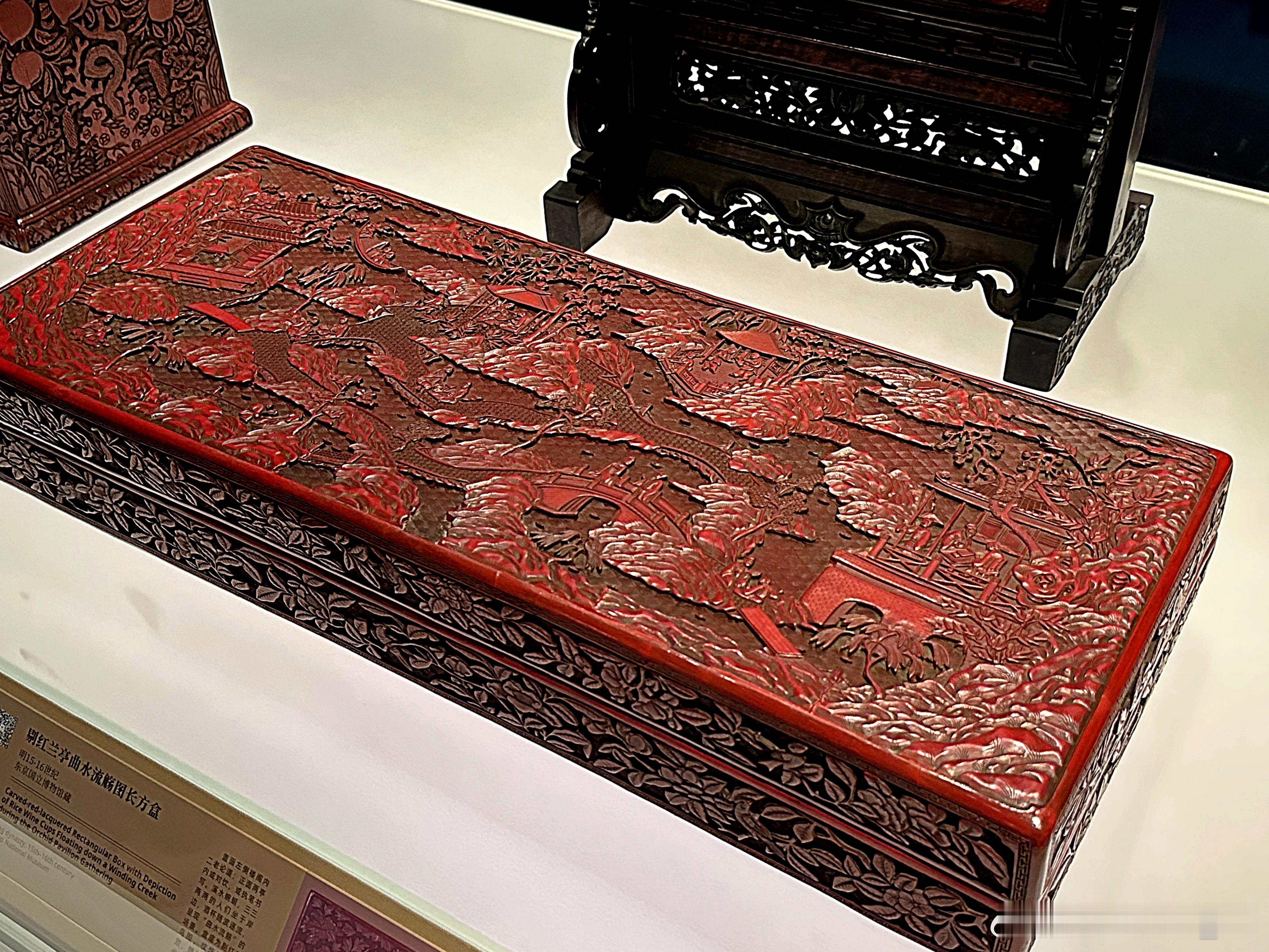 剔红兰亭曲水流觞图长方盒明15-16世纪东京国立博物馆藏木胎,长方盒。通体髹红漆,盖面雕刻崇山峻岭、楼阁及松竹梅等茂林修竹。画面中:左侧楼阁内二老谈诗论道;正面两亭内,一亭三人对饮,另一亭二人执笔书写;右侧楼阁里空无一人。溪水蜿蜒,人们坐于岸边,酒杯随波逐流,呈现“曲水流觞”场景。盒底为剔红花鸟图,盖侧及盒身饰花卉纹。纹饰疏密有致,雕工精美,是明代剔红佳作之一。曲水流觞,是中国古代上巳节(夏历三月初三)传统习俗,可追溯至西周初年。南朝梁吴均《续齐谐记》载:“昔周公卜城洛邑,因流水以泛酒”,后演变为文人墨客诗酒唱酬之雅事。书圣王羲之《兰亭集序》即记叙了东晋永和九年(353年)三月初三,其与谢安等名士于会稽兰亭雅集,临流赋诗,祓除不祥之盛况。红翠斗芳菲:宋元明漆器珍品展 展出摄于上海博物馆