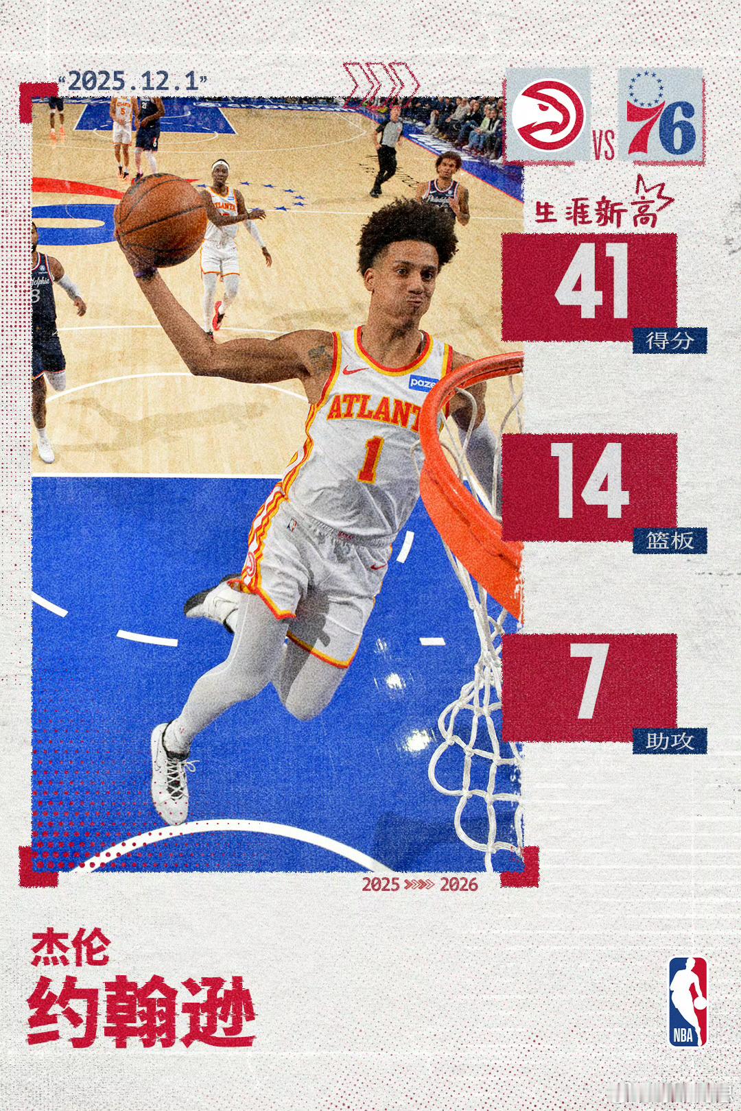 【杰伦-约翰逊狂轰生涯新高41分】真正的球队大核已在阵中!今日对阵76人的比赛中,杰伦-约翰逊双加时狂揽41分创生涯新高,带领老鹰经历鏖战力克76人取胜!老鹰双加时战胜76人NBA数据酷NBA