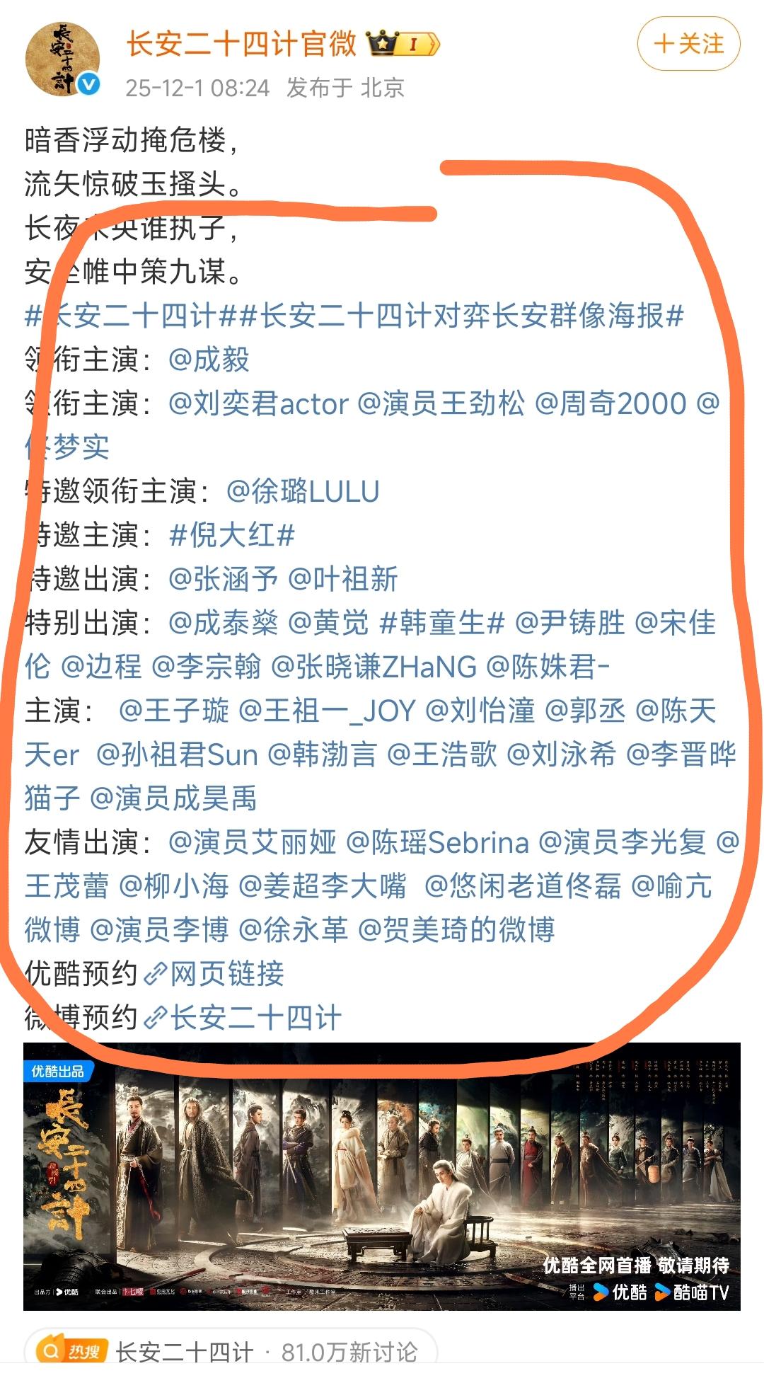 成毅新剧《长安二十四计》开播预热 这密密麻麻的主演列表,看的人有些头晕。 但该说不说,阵容还是非常强大的,光娱乐圈有名字的演员,我看了一下都有二十好几位,其中不乏一些能扛剧的大主演。 这些人集体过来给成毅做绿叶,要是这部剧还不爆的话,那成毅压力该多大呀?