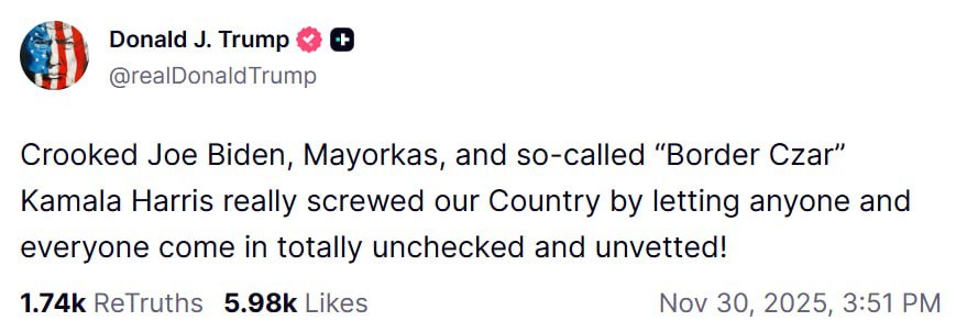 特朗普通过 Truth Social 发帖:骗子乔·拜登、梅奥卡斯,还有所谓的“边境沙皇”卡马拉·哈里斯,放任任何人未经审查和核实就入境,真是把我们国家搞得一团糟!