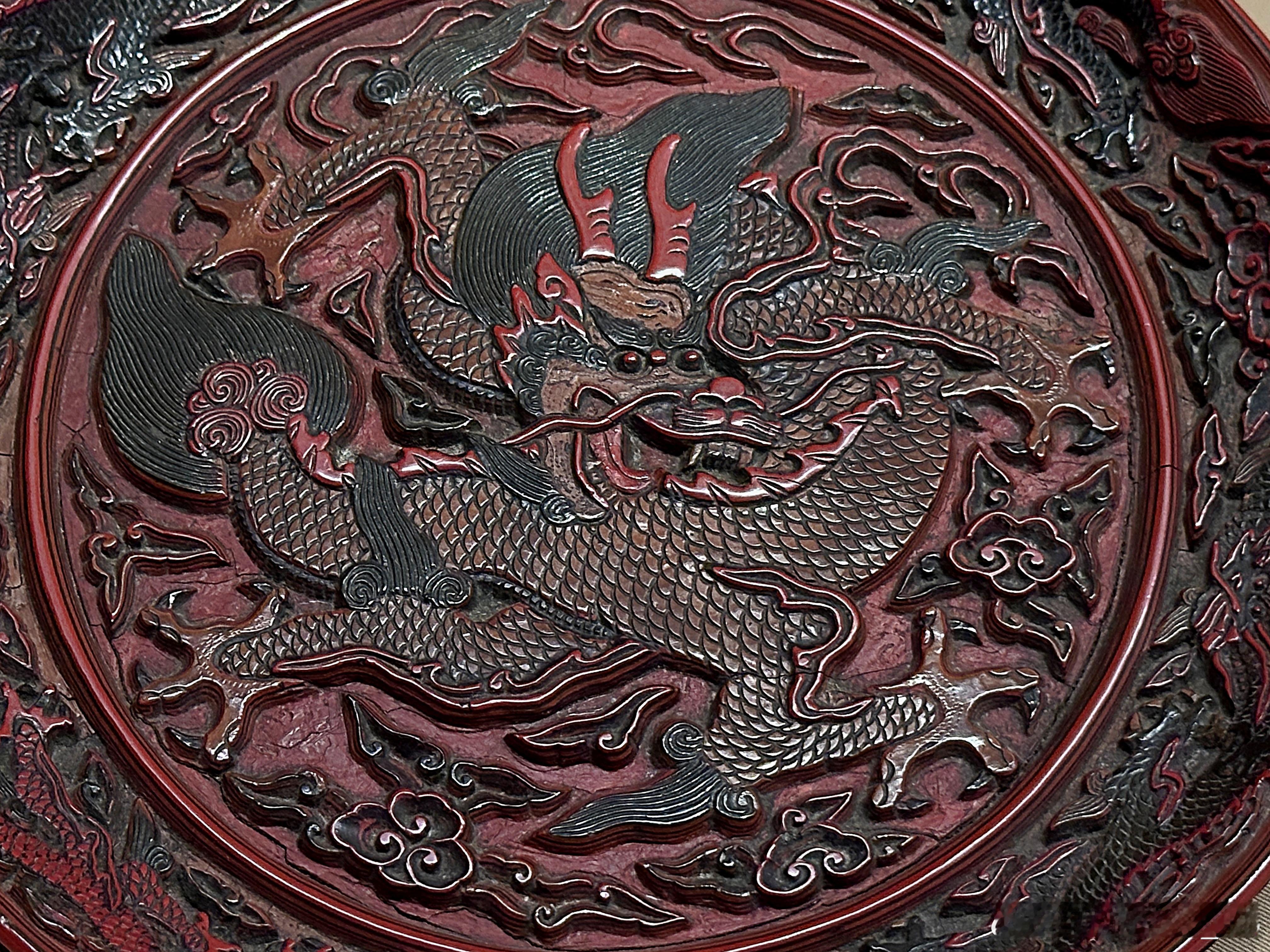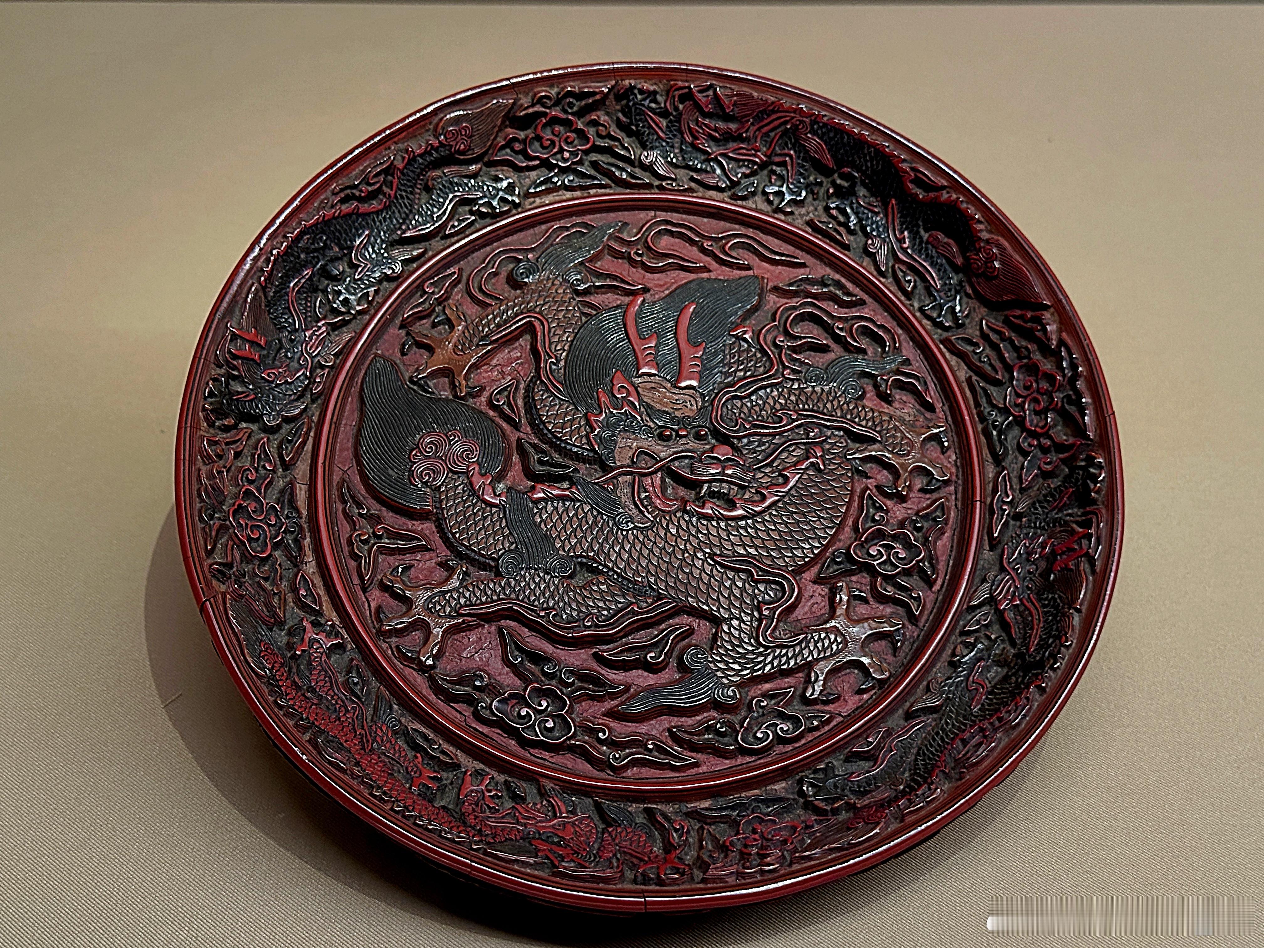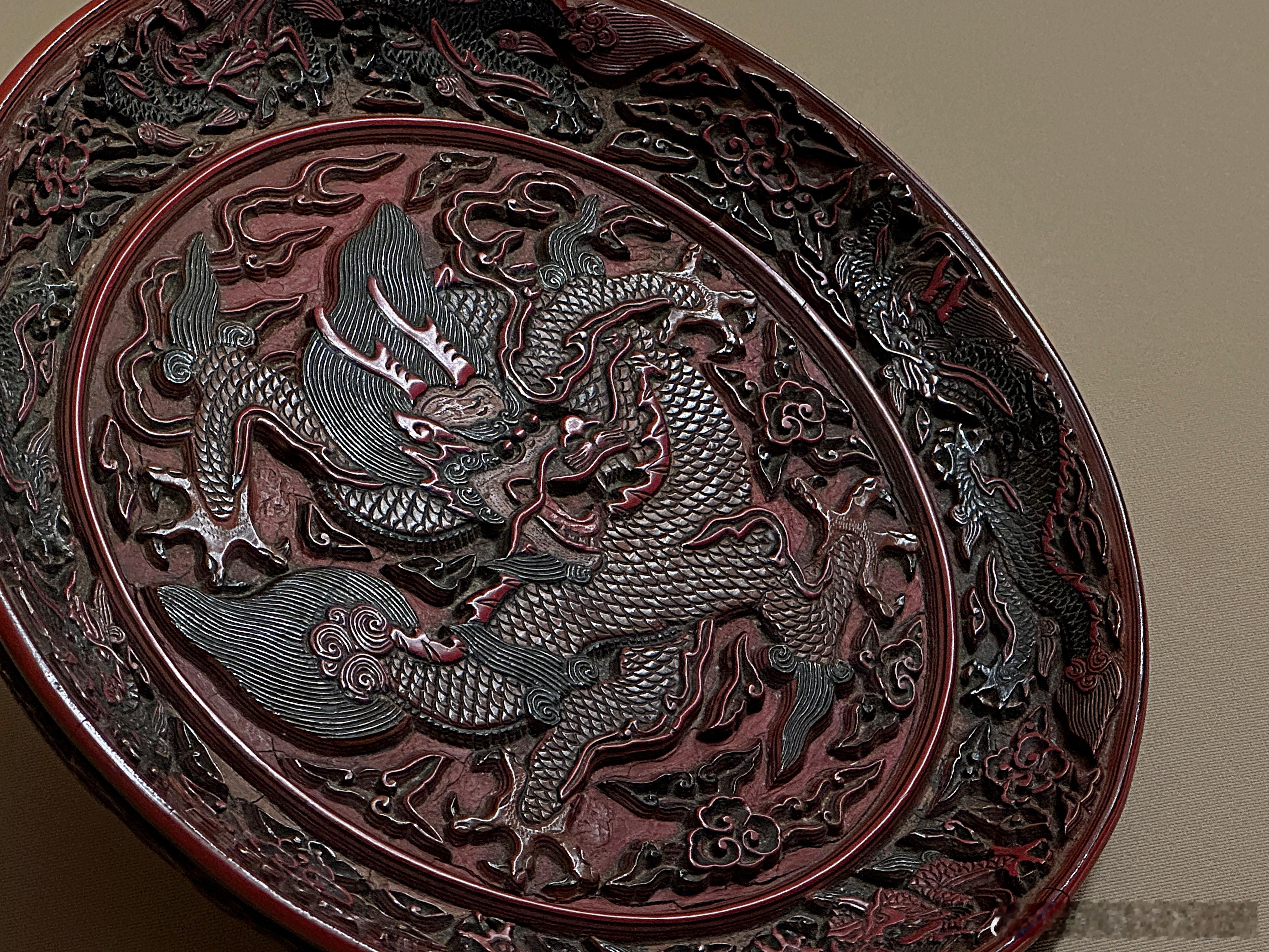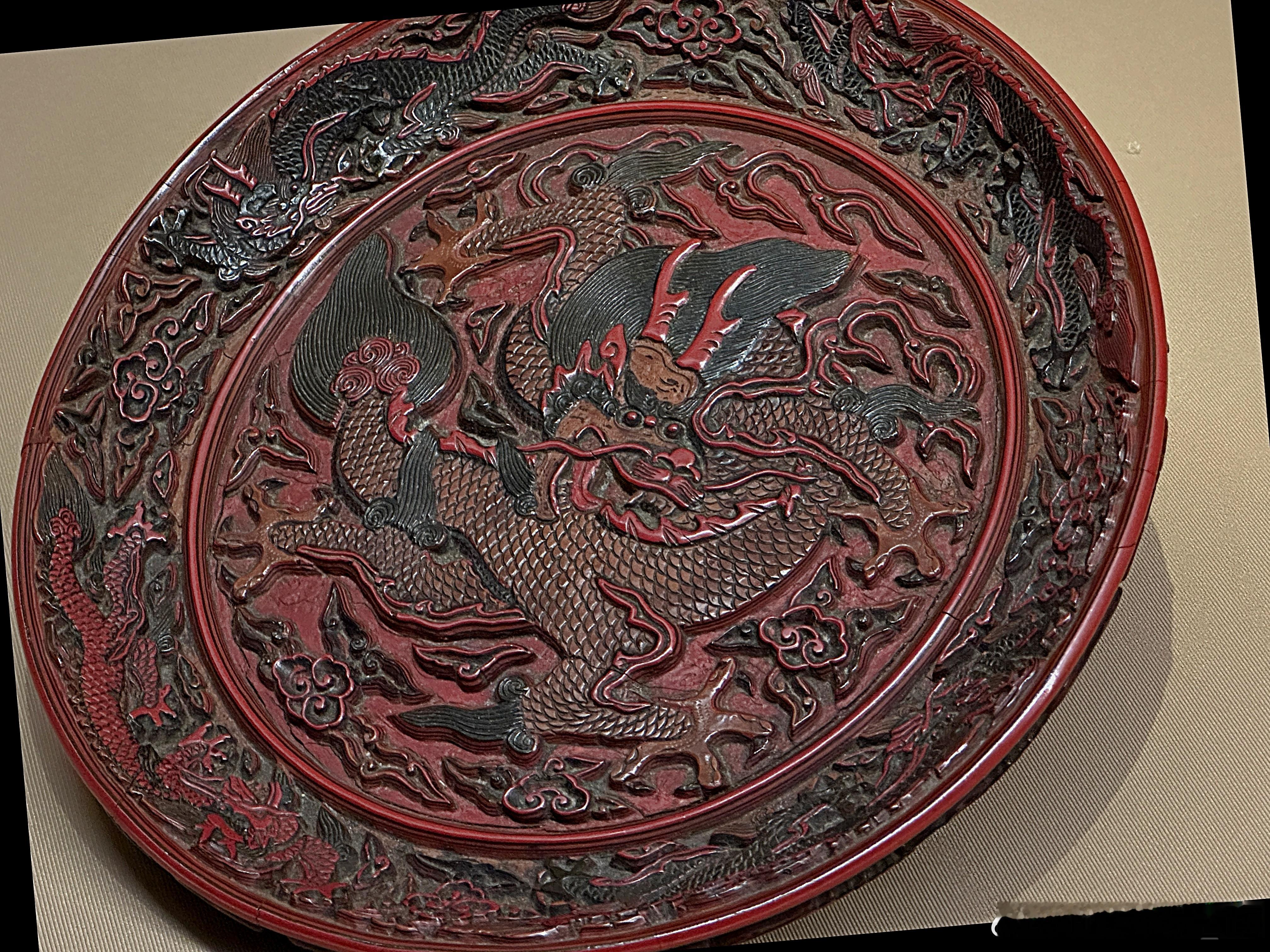 剔彩龙纹圆盘 明16世纪 东京国立博物馆藏盘面朱漆地上髹朱、黄、绿三色漆。盘心为黄身红鳍形龙,瞠目结舌,四爪遒劲,绿髯飞舞。间饰剔彩双勾如意云纹。此盘刀法熟练利落,立体感强,属于明代官作雕漆代表作。红翠斗芳菲:宋元明漆器珍品展 展出摄于上海博物馆