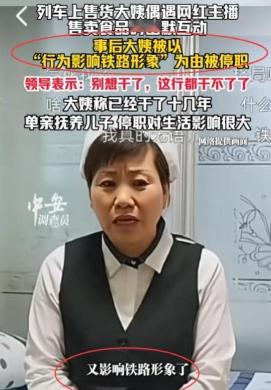 2025年,在列车上,售货大姨周某华与网红主播的一次热情互动,竟让她丢了工作。这段本该体现东北人热情好客的佳话,却因"多收1元钱和2只烧鸡"演变成一场职场风波。 周大姨是那种典型的东北妇女,爽朗、热情,在列车上卖了十二年货。 而她是个单亲妈妈,靠着这份工作把孩子拉扯大。 对她来说列车就是她的第二个家,而乘客们都是她的亲人。 那天下午,K1393次列车刚从沈阳北站开出,周大姨跟往常一样推着小车走进13号车厢。 在人群中她一眼就认出了正在直播的网红主播刘回。 "帅哥,来点咱东北特产?奶贝、西梅,都是新鲜的!" 周大姨笑脸相迎。 而刘回也被她的热情感染,一下子买了八包零食。 按照优惠,四包20元,刘回应付40元,但他直接扫了41元,多给了1块钱。 然而就是这多余的1元钱,成了后来一系列风波的导火索。 更让周大姨感动的是,刘回还从行李里掏出两只真空包装的烧鸡硬塞给她。 "大姨,您这么热情,这点心意一定收下!" 周大姨推辞不过,最后收下了礼物,还给了刘回一个感激的拥抱。 而这一幕被直播间里的网友们看到,纷纷点赞:"这大姨太可爱了""这才是真正的东北热情"。 然而,他们都没注意到,列车长远远地看着这一切,眉头紧锁。 就在第二天上班时,周大姨被叫到办公室。 领导冷着脸说:"你被停职了。" "为啥啊?"这突如其来的一幕直接给周大姨懵了。 "为啥?你心里没数吗?"领导把手机往桌上一扔,上面正是她和刘回互动的视频,"私自多收钱物,还拥抱乘客,像什么样子!你这行为严重影响铁路形象!" 听到这儿的周大姨试图解释:"那钱是乘客自愿多给的,烧鸡是人家送的礼物..." "别说了!"领导打断她,"你在佳木斯这行别想干了,我让你在整个铁路系统都呆不下去!" 最后无奈的周大姨哭着回到家。 十二年勤勤恳恳的工作,就因为一次热情的互动,说没就没了? 委屈之下,她在网上开了直播,讲述自己的遭遇。 更让她害怕的是,公司很快打来电话威胁:"再直播乱说,就让警察找你谈话!" 之后事件在网上持续发酵,不同说法开始出现。 铁路部门赶紧澄清:周大姨是外包公司员工,停职是外包公司单方面决定,与铁路无关。 他们只是按规矩要求退还多收的钱物,从未要求解雇她。 但周大姨记得清清楚楚,领导训话时明明说的是"影响铁路形象"。 这让她陷入困惑:到底谁在说谎? 事实上,列车售货员这个群体一直处于尴尬的灰色地带。 他们穿着铁路制服,在列车上工作,接受列车长管理,但劳动合同却签在外包公司。 而且一出事,就成了"没人要的孩子"。 网友们的观点也分成两派。 一派认为:"服务行业就该有温度,大姨没错"。 另一派则认为:"无规矩不成方圆,铁轨上的服务更要讲规矩。" 随着事件越闹越大,媒体开始介入报道。 更有人挖出周大姨的家庭情况:单亲妈妈,孩子还在上学,全家就靠她卖货的收入生活。 舆论一边倒地支持周大姨。 也有网友直言:"如果热情服务都要被处罚,那以后谁还敢对乘客笑脸相迎?" 而在强大舆论压力下,外包公司很快改口,宣布恢复周大姨的工作。 就连铁路部门也发布通报,承诺会"规范商品售卖工作,营造温馨出行环境"。 表面看,周大姨赢了。 但其实她心里明白,就算回去工作,有些东西已经不一样了。 而她再也不敢像以前那样,毫无顾忌地和乘客说笑互动了。 像周大姨这样的外包员工,干着最一线的话,却拿着最少的保障。 而且一旦出事,最先被推出去"顶锅"。 这铁路部门想要标准化服务,这没错。 但人家东北人的热情是骨子里的,很难用条条框框束缚住。 而过度标准化会不会让服务失去温度? 再说了作为一个服务行业她热情有错吗? 难道非要像机器人一样冷冰冰她业绩就会好起来? 还是说冷漠无情就会让乘客感觉到舒服? 而这最重要的是管理思维的落后。 在这个网络时代,周大姨的真诚互动本该是铁路上最好的宣传素材。 眼瞅着到冬天了,这哈尔滨的旅游旺季就要来了,这破天的流量说不要就不要,霸气啊。 管理者却视之为"影响形象",这本身就很说明问题。 真正的服务形象,不是管出来的,是做出来的。 旅客脸上的笑容,才是最好的形象广告。 周大姨回到了她熟悉的列车,推着小车继续卖货。 她还是那个爱笑的东北大姨,只是眼睛里多了几分谨慎。 但当她看到带孩子的旅客,还是会偷偷多塞一包零食。 见到老人买水,还是会主动帮忙拧瓶盖。 有些东西,是规则束缚不住的,比如东北人骨子里的热心肠。 这场风波过去了,但它留给我们的思考还在继续。 在这个越来越规范化的世界里,我们该如何为人性的温度保留空间? 主要信源:(列车售货员与网红互动,因多收1元和2只烧鸡被停职,官方通报:已恢复其列车售货工作——九派新闻)