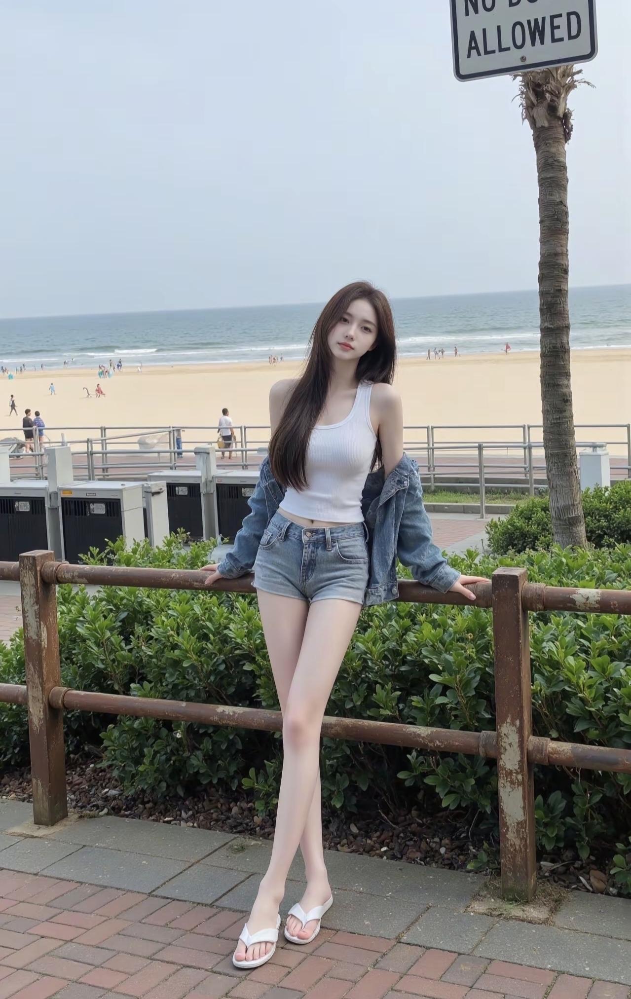 海风把松弛感吹到了岸边,白背心裹着夏末的余温,牛仔布料沾了点沙滩的潮气。栏杆外是浪声,身后是人群,今天的风刚好,连时间都慢了半拍。
