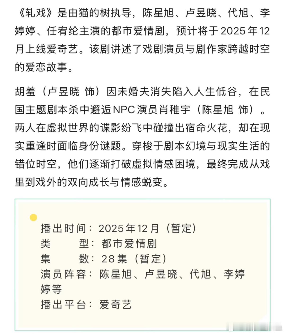 电视剧轧戏 开启播前招商猫的树执导,陈星旭、卢昱晓主演的都市爱情剧《 轧戏》预计将于2025年12月上线爱奇艺