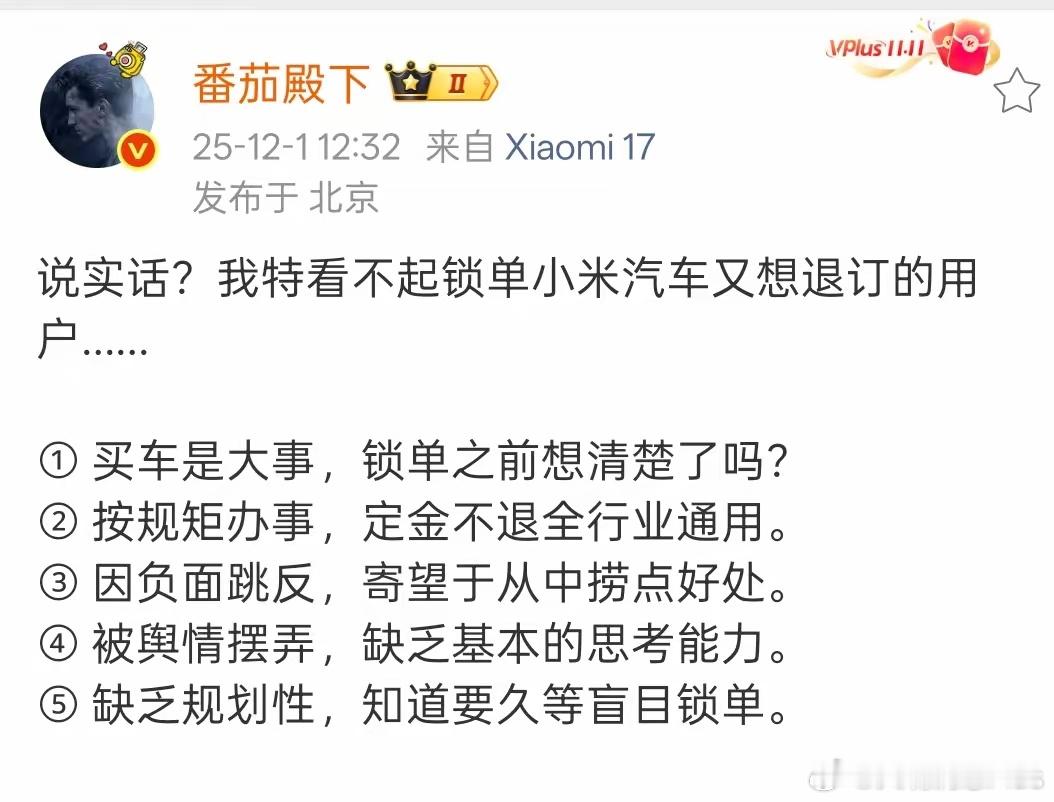 “番茄殿下”:我很看不起锁单小米汽车又想退订的用户