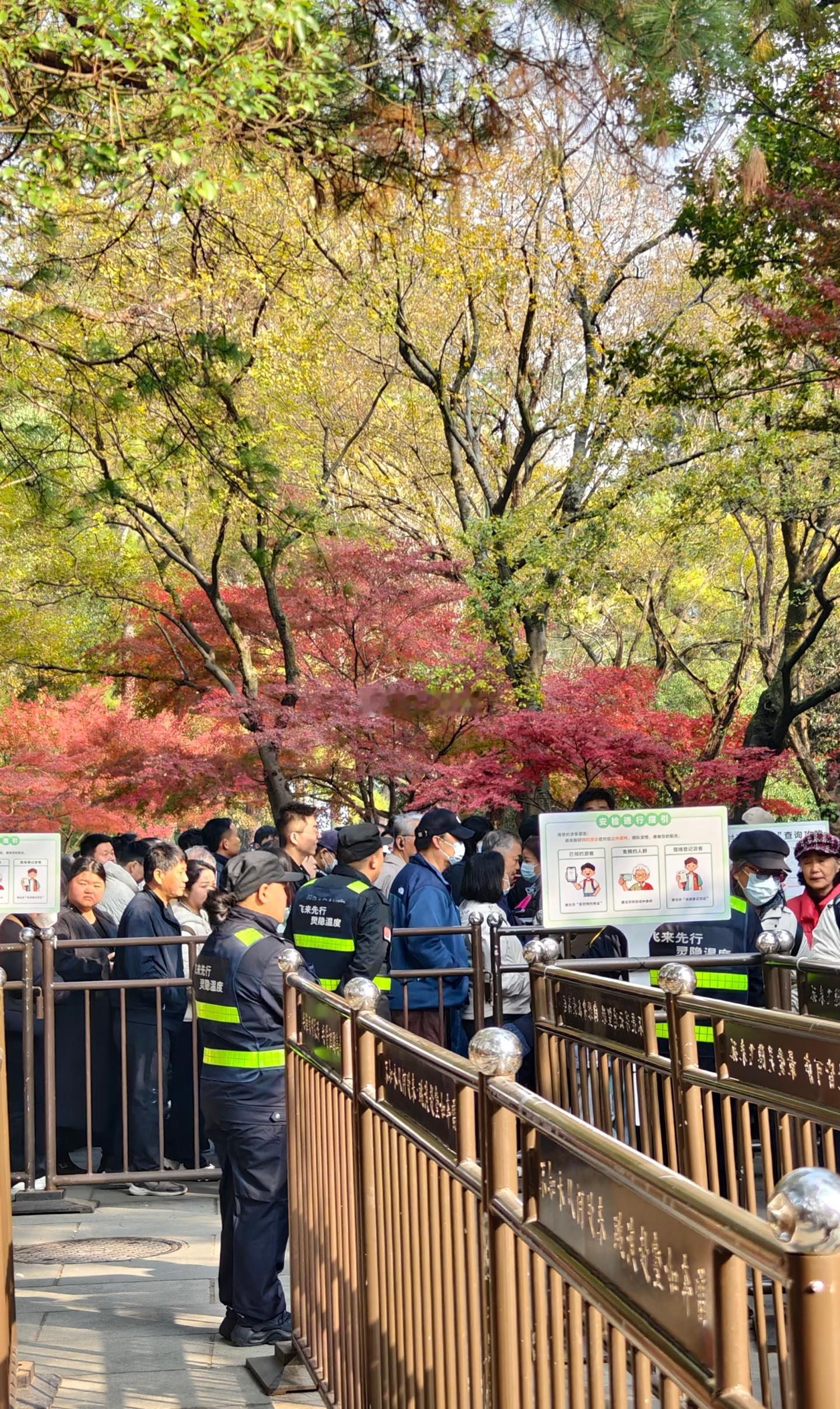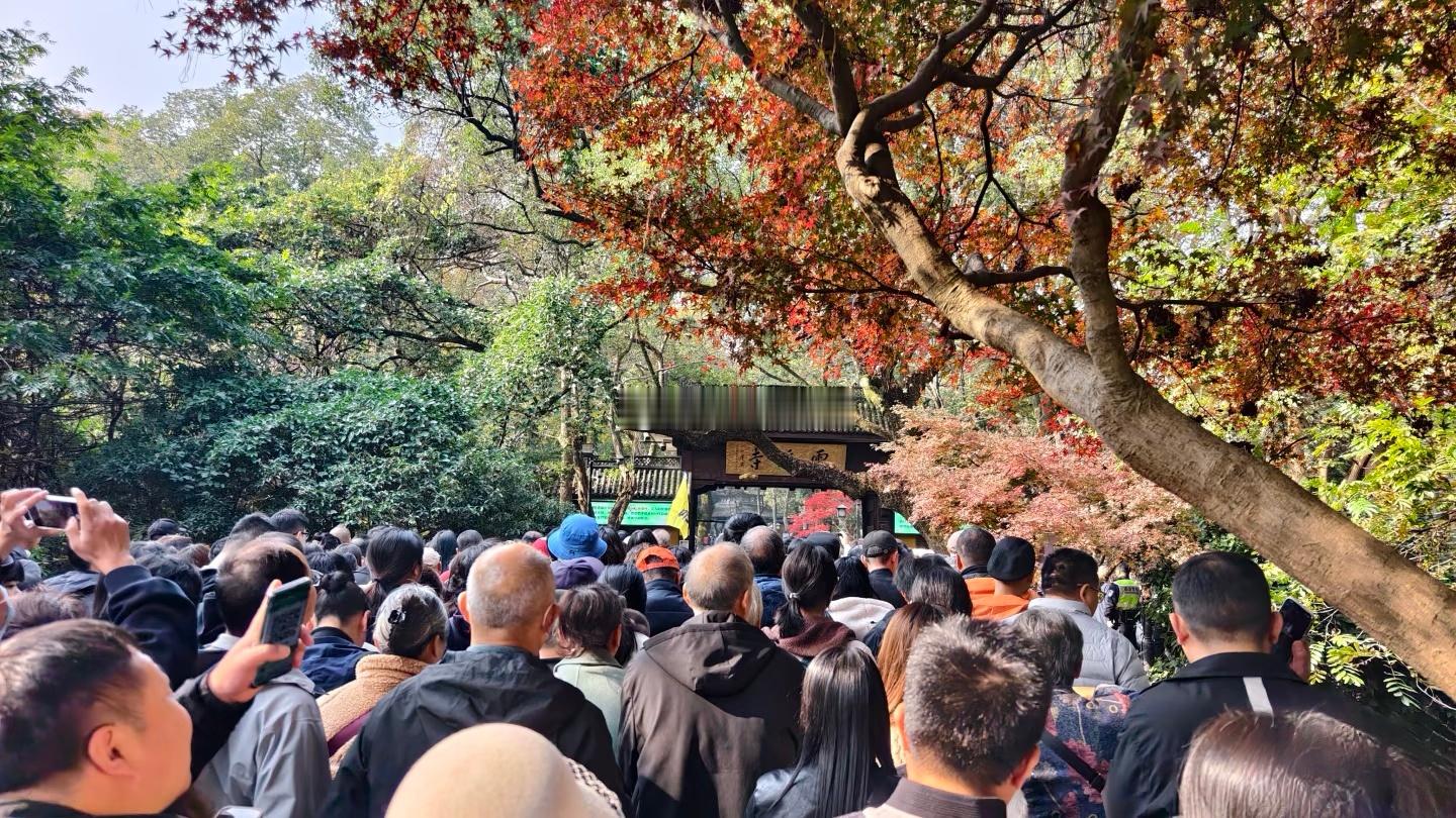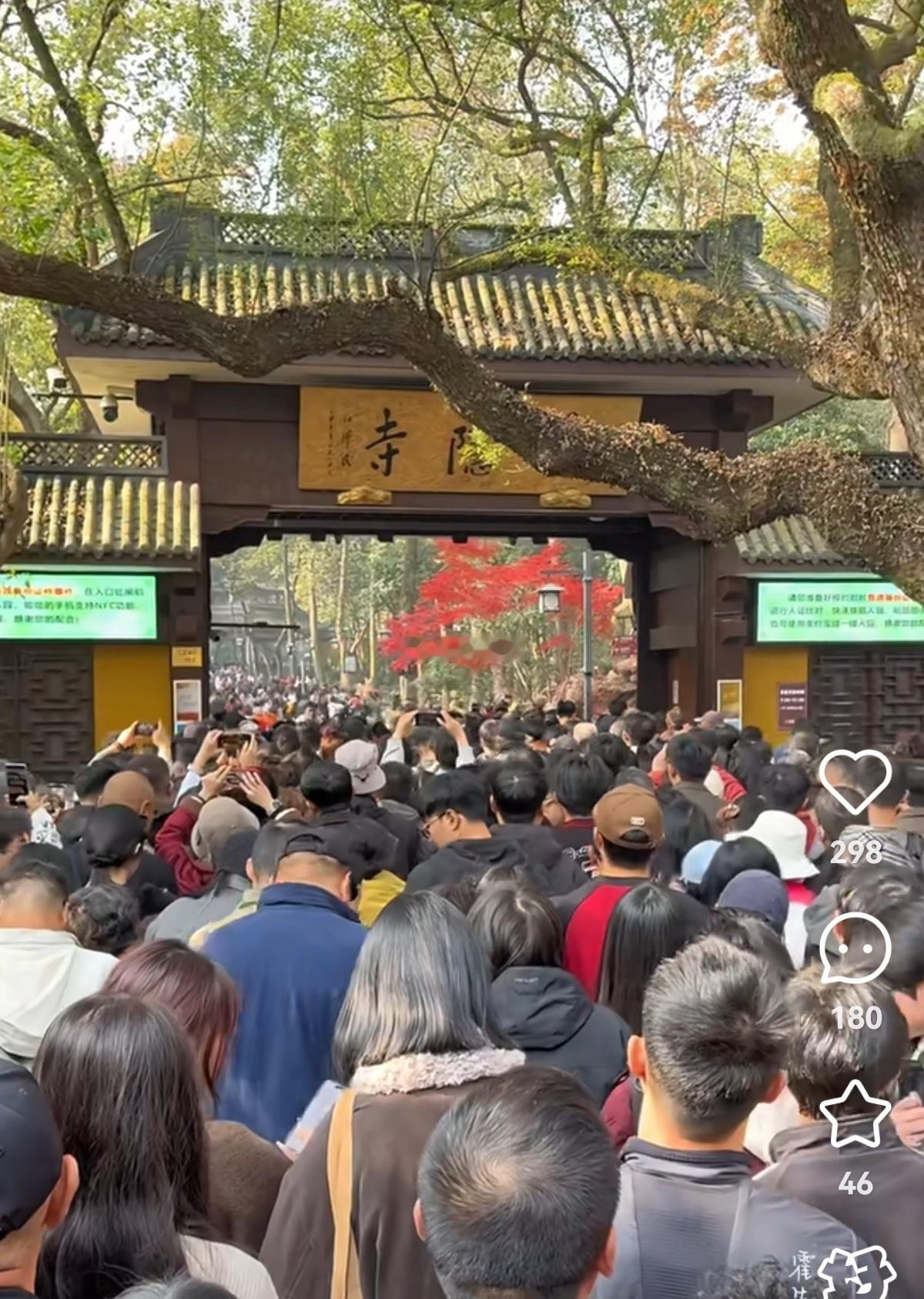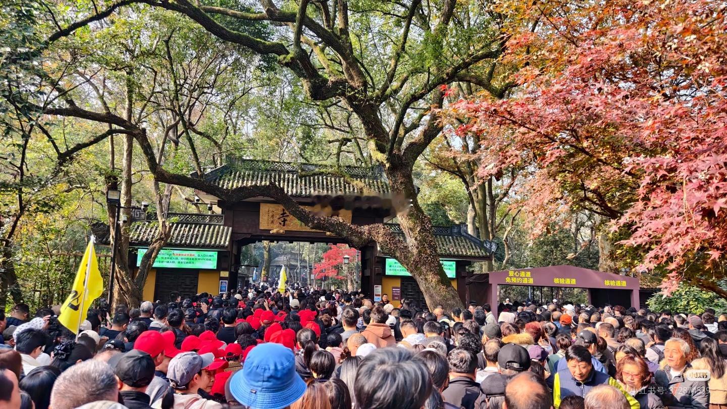 今天是杭州灵隐寺免门票的第1天。虽然是工作日,但是人流量堪比黄金周、小长假。今日门票已预约满,下午去的游客改期吧。