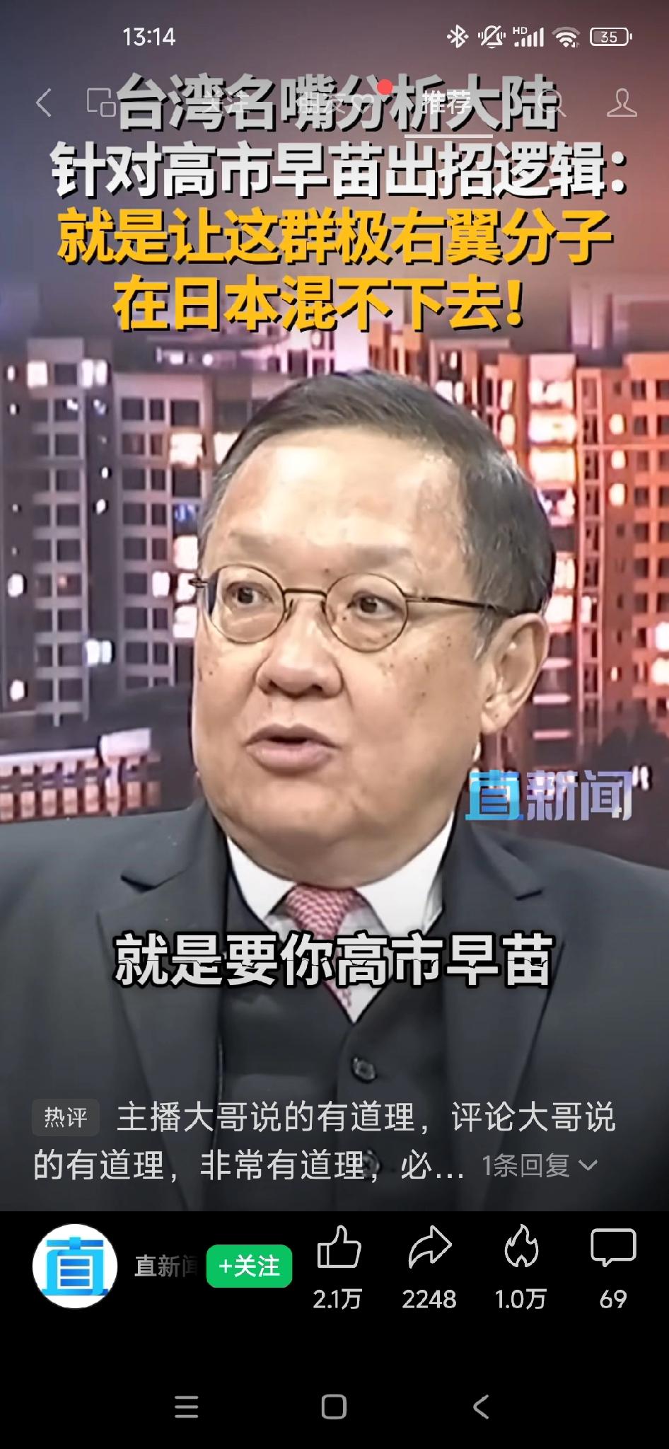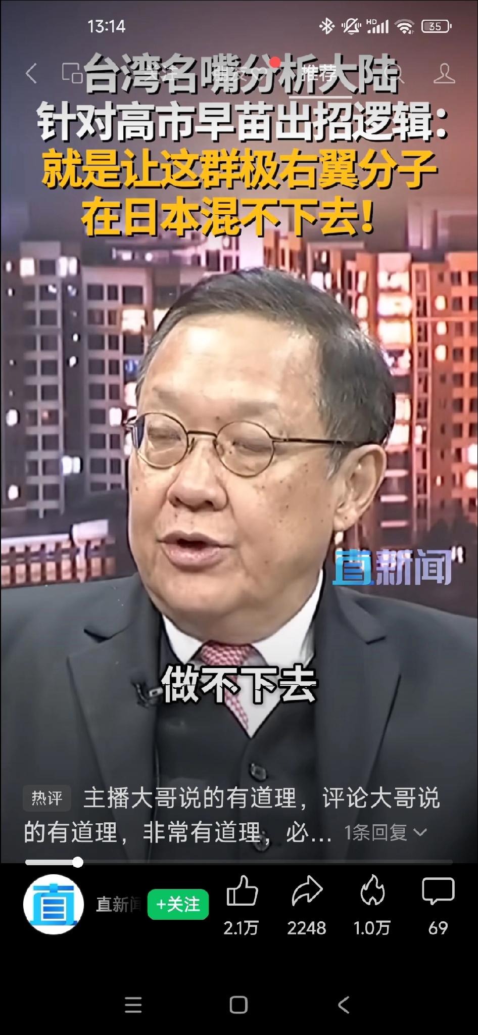 “台湾名嘴介文汲分析大陆针对高市早苗出招逻辑” 介文汲说:大陆今天的所有作为就是要你高市早苗做不下去。 你的极右翼分子在第一次掌权后,在日本社会的支持基础把它打烂。 大陆现在是一招一招出的。但每出招一次都会喊话一次。 施压的过程是逐步的,不会一步完成。像套索一样,越抽越紧。 你会看到随着高市早苗的反抗或者不愿意认错,大陆会继续施压。 目标是高市早苗及极右翼政权的垮台!