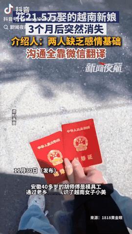 浙江杭州,一40岁男子花21.5万娶了一位20岁的越南新娘,婚后他发现妻子一直在偷吃避孕药,妻子解释是调节月经,但是没想到他们结婚才3个月,妻子突然跑了,把他的联系方式都拉黑了,男子去找介绍人,对方却说都是他的责任。无奈之下,男子报了警,他怀疑自己被“诈婚”了! 信息来源:新闻夜航 胡师傅是模具厂的师傅,月收入一万多,独身多年,就托安徽老乡胡某介绍,说有个越南姑娘小美,人年轻漂亮。 他一见面就满意,爽快地掏出16万现金给中介,另给胡某妻子丽丽5.5万,凑够21.5万。 两人领了证,搬进单间公寓,每月房租两千多。 白天他上班赚钱,她在家做饭、贴钻石画,日子看似和和美美。 婚后不久,胡师傅发现小美总是偷偷吃白色药片,他问,她说:“调节月经嘛。”他也没深想。 可到了11月17日那天,下班推门进屋,桌上饭菜都长毛了,小美人却不见了。 调看小区监控,只见她自己上了辆小轿车,往江西方向跑。 手机关机、微信拉黑,护照在手,语言还不通,怎么可能自己就跑? 他赶紧报警,杭州和安徽两边都挂了案。 细看微信记录,小美早在9月就有埋怨:聊天记录里她说“我很烦,你别碰我”,还吐槽他打呼噜睡不着,答应买的冬衣也没见着。 介绍人那边却说,两人是闪婚,本就没感情基础,总要先磨合,再说咋办都行。 丽丽甚至觉得“都是胡师傅自己逼她累着的”,扯得像又累又心烦。 网友们一看这事儿,也纷纷劝:“跨国婚姻本来就风险大,钱一到人就不见了”、“这介绍人肯定有猫腻,一伙儿骗彩礼”。 法律界有人提醒,国外新娘嫁进来,介绍人如何谋利都要管,该收钱得收证,该备案得备案;一旦婚姻只是幌子,骗走彩礼就跑,可能构成诈骗。 现在的胡师傅,急盼真相:要么小美回来好好说个清楚,要么把钱追回来。 通过这事给大家提个醒:不要冲动闪婚,结婚之前要多点了解对方的家庭条件,以及人品各方面,有没有确定彼此合适,是不要给大量的彩礼钱,省得人财两空。 最后,希望他借助法律武器要回一些彩礼钱,减少一些财产损失。