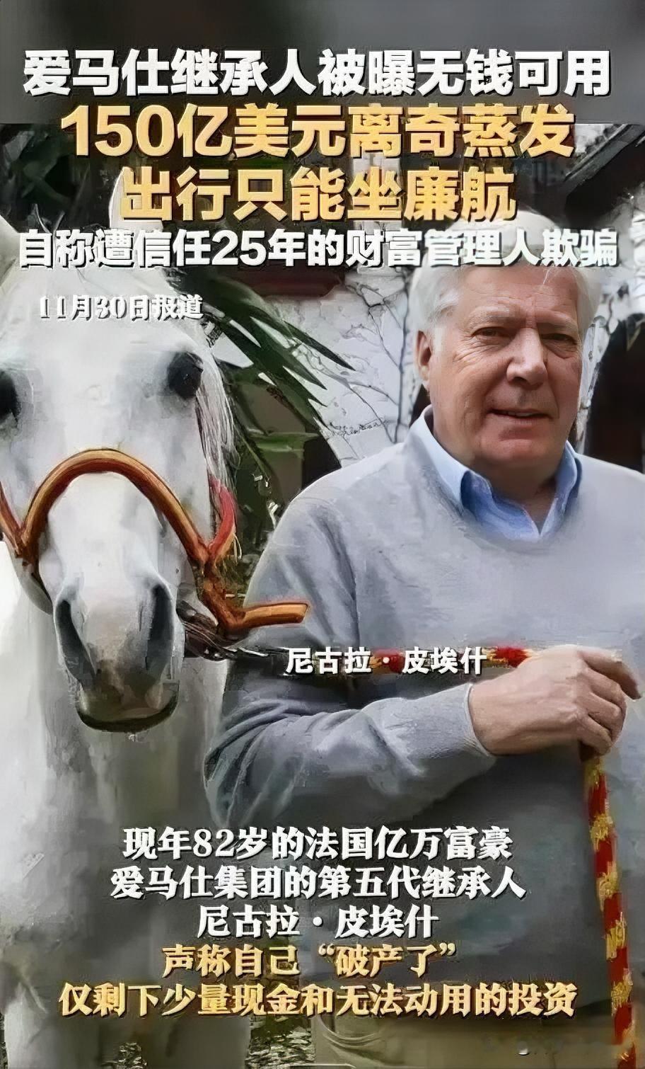 爱马仕继承人150亿美元财富“蒸发”成谜 爱马仕第五代继承人尼古拉·皮埃什,曾以5.7%股份成最大个人股东,身家一度达156亿美元。然而,他指控信任25年的财富管理人弗雷蒙德侵占资产,致其150亿美元财富“蒸发”。弗雷蒙德在接受法国司法问询后不久“自杀”。尽管司法部门仍在调查,爱马仕集团也在追查,但这桩豪门悬案,或因关键人物离世成永远谜团。