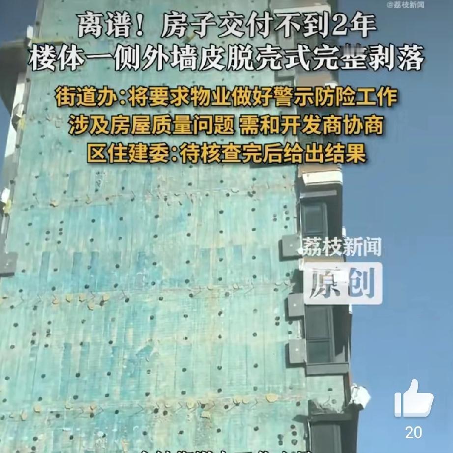 交房不足两年外墙全脱落!“安居梦”变“头顶险” 交房不到两年,崭新楼体竟成“斑驳危房”?近日,天津东丽区仁信路28号花语尚东·花恒雅园1期的业主们,被眼前的景象惊出一身冷汗:一栋住宅楼的一侧外墙皮大面积整体脱落,裸露的墙体斑驳不堪,不仅影响美观,更像悬在头顶的“利剑”,让业主们忧心忡忡。 据悉,该小区1期交房时间尚不足两年,远远未到正常建筑外墙的老化周期。业主们表示,当初花重金购置新房,盼的是安心居住,如今外墙突然大面积脱落,让人对房屋整体质量产生严重质疑——毕竟外墙脱落绝非小事,可能涉及材料不合格、施工工艺不达标等深层问题,甚至存在后续墙体渗水、结构安全等隐患。更让业主们无奈的是,问题发生后,大家多次沟通却遭遇“踢皮球”。 当地街道办回应称,会要求物业做好统计、报修和防险工作,但核心的质量问题仍需与开发商协商;住建委则表示需等待核查结果。这样的回应让业主们难以释怀:房屋质量关乎生命安全,岂能简单推诿?根据相关规定,外墙防渗漏等关键部位的法定最低质保期为5年,如今问题爆发在质保期内,开发商理应主动担责。 住房是民生之本,业主们的“安居梦”容不得质量打折。希望相关部门能加快核查进度,查明脱落原因,督促责任方彻底整改,给业主一个明确且有保障的答复。也期待这类“短命外墙”现象能被重视,从源头守住建筑质量关,让每一位购房者都能住得安心、住得放心。你身边遇到过类似的房屋质量问题吗?欢迎留言分享。