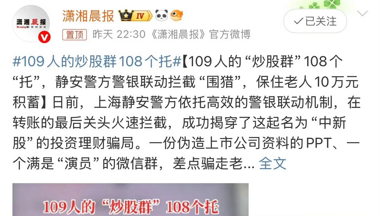 家人们谁懂啊!现在骗子为了骗钱也太卷了,109人的炒股群里居然108个都是托,就盯着老人的养老钱下手!上海一位阿姨差点就把10万积蓄投进去,还好警银联动跑得快,转账最后一秒给拦住了! 你以为是“资深导师”带你飞、群友晒单赚大钱?其实全是剧本!一份伪造的上市公司PPT,一群轮流演戏的“演员”,天天喊着“中新股稳赚不赔”“内幕消息只给自家人”,把老人哄得团团转。说白了,这就是换汤不换药的投资理财骗局,专抓长辈想“轻松赚钱”的心理。 记住了!正规理财哪有“零风险高回报”?那些让你私下转账、下载陌生APP、说“内幕消息”的,全是诈骗!2025年骗子还爱用AI、区块链包装骗局,但套路核心没变——用小利勾你,用演戏骗你。 为机智的民警和银行工作人员点个赞!也赶紧转发给爸妈长辈,别让骗子有机可乘~ 你家老人遇到过类似的“投资群”吗?评论区聊聊你见过的奇葩骗局,一起给长辈避坑!全民反诈 守护养老钱