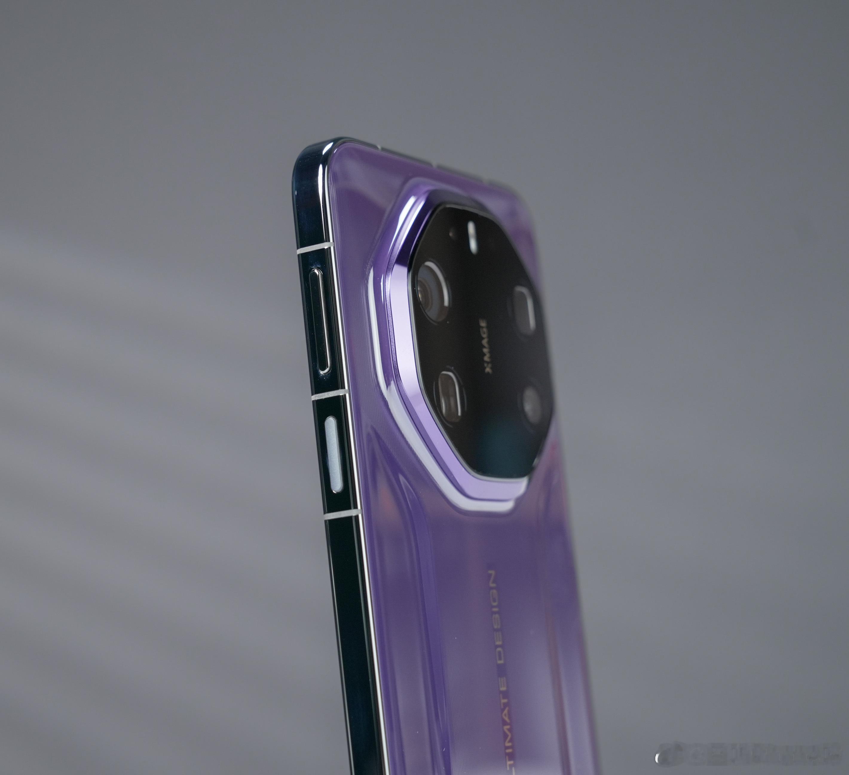 Mate 80 RS首次了使用非陶瓷的机身,没记错的话,此前用过陶瓷机身的品牌有小米、一加以及华为,而今年主流机型中一款也没有。陶瓷的优势是质感好耐磨,缺点也明显,重量大、成本高、良品率低。80 RS正面是第三代玄武玻璃,背面是第二代玄武玻璃,中框是钛金属,质感和抗摔都有了,并且观感也几乎和陶瓷相同。不过玻璃工艺虽然有进步,但很容易粘指纹,强迫症有点难受。而且和陶瓷的手感还是有差别,属于是在美观与实用性上做了个平衡。辨识度这一块,依然是八边形的Deco加机身中间稍稍凸起的造型,这台紫色看上去还真有点紫气东来的感觉,这个外观10分满分,你给几分?