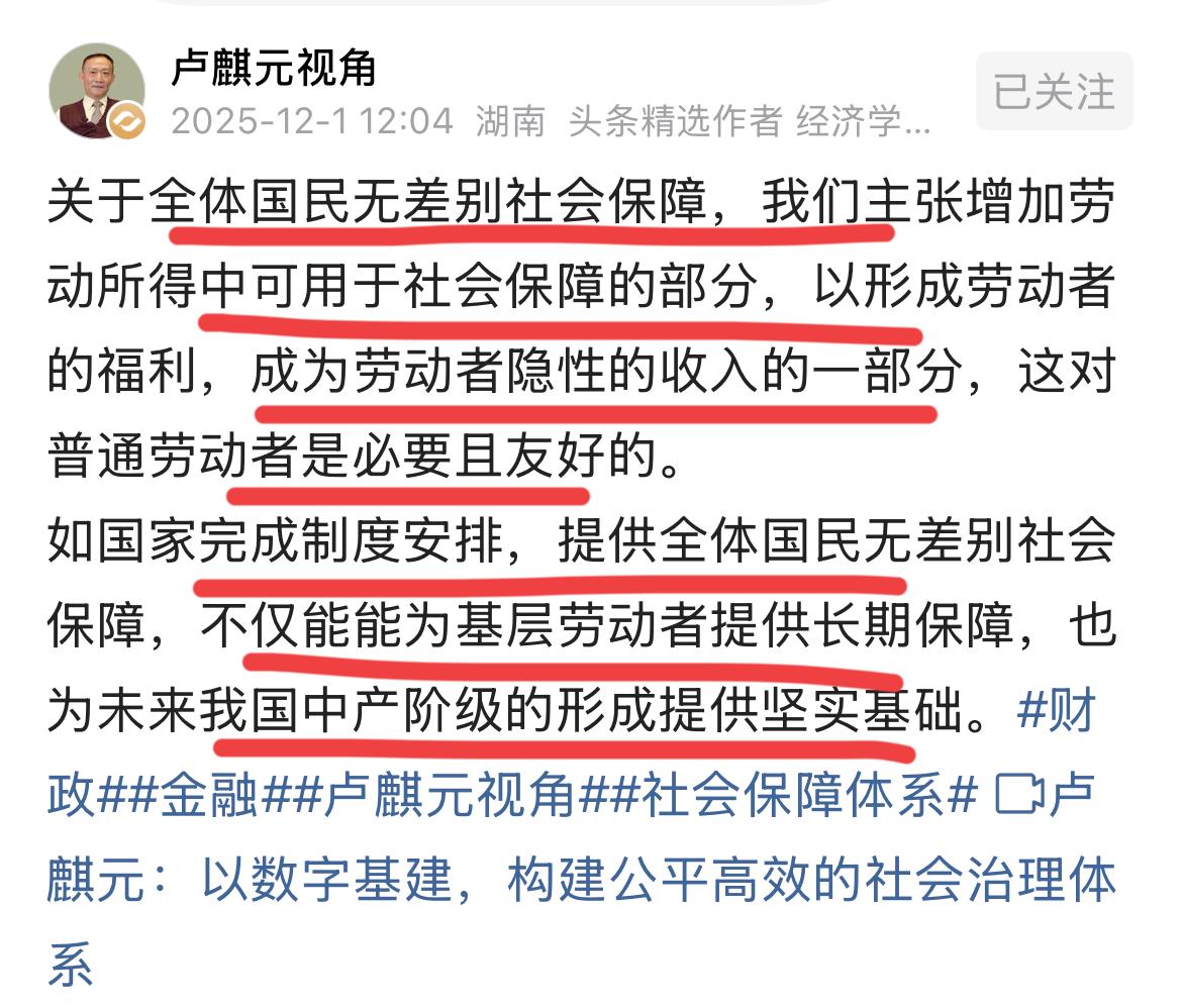 经济学家卢麒元再提无差别社保!! 卢总认为,劳动者所得,应该增加用于社会保障额部分。 这就等于增加了劳动者的福利,这也是劳动者的隐性收入。 对于广大的百姓而言,这确实是非常必要的。 卢总说,如果得以实施,不但对普通老百姓是极大的利好; 对未来也非常重要,这就有利于形成我国庞大的中产阶层。 卢教授近年来提出了诸多超级大建议。 如直接税立法,打击走资,建立国储委对资金进行全球监管。 卢教授认为,走·资是造成我们经济疲软最重要的原因。 至少21万亿跑路了,太吓人了,21万亿,到底什么概念了? 如果这21万亿不跑路,资本积累率不会这么低,经济也不会如此不振; 据卢总估算,21万亿不跑出去,我们就可以实现全民免费医疗。 对于卢总的这些建议,为何没有被采用呢? 网友都很疑惑,我也百思不得其解。 你支持卢总的建议么,有何看法呢?