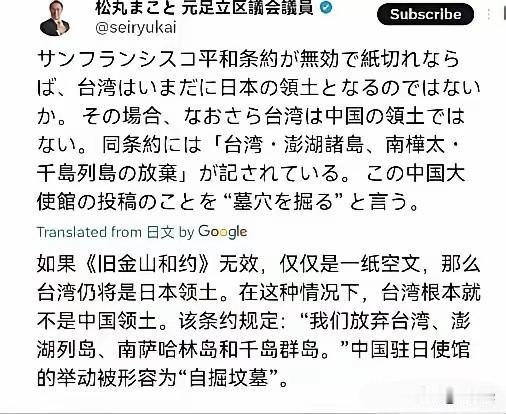荒唐谬论! 小日子前议员妄言台湾归属, 纯属自欺欺人! 12月1日, 小日子前议员松丸诚抛出离谱言论,竟称若《旧金山和约》无效, 台湾就该是日本“领土”, 还污蔑中国大使馆发文是“自掘坟墓”! 这番话纯属颠倒黑白、混淆是非! 《旧金山和约》本就是冷战产物,未经中国同意, 对中国无任何法律约束力。 台湾自古就是中国领土, 这是国际社会公认的历史事实, 更是不容篡改的铁律。 小日子前议员无视历史、肆意妄言,本质上是妄图复活军国主义野心,干涉中国内政! 这种荒唐谬论, 只会沦为国际社会的笑柄, 也注定经不起历史和法理的检验!
