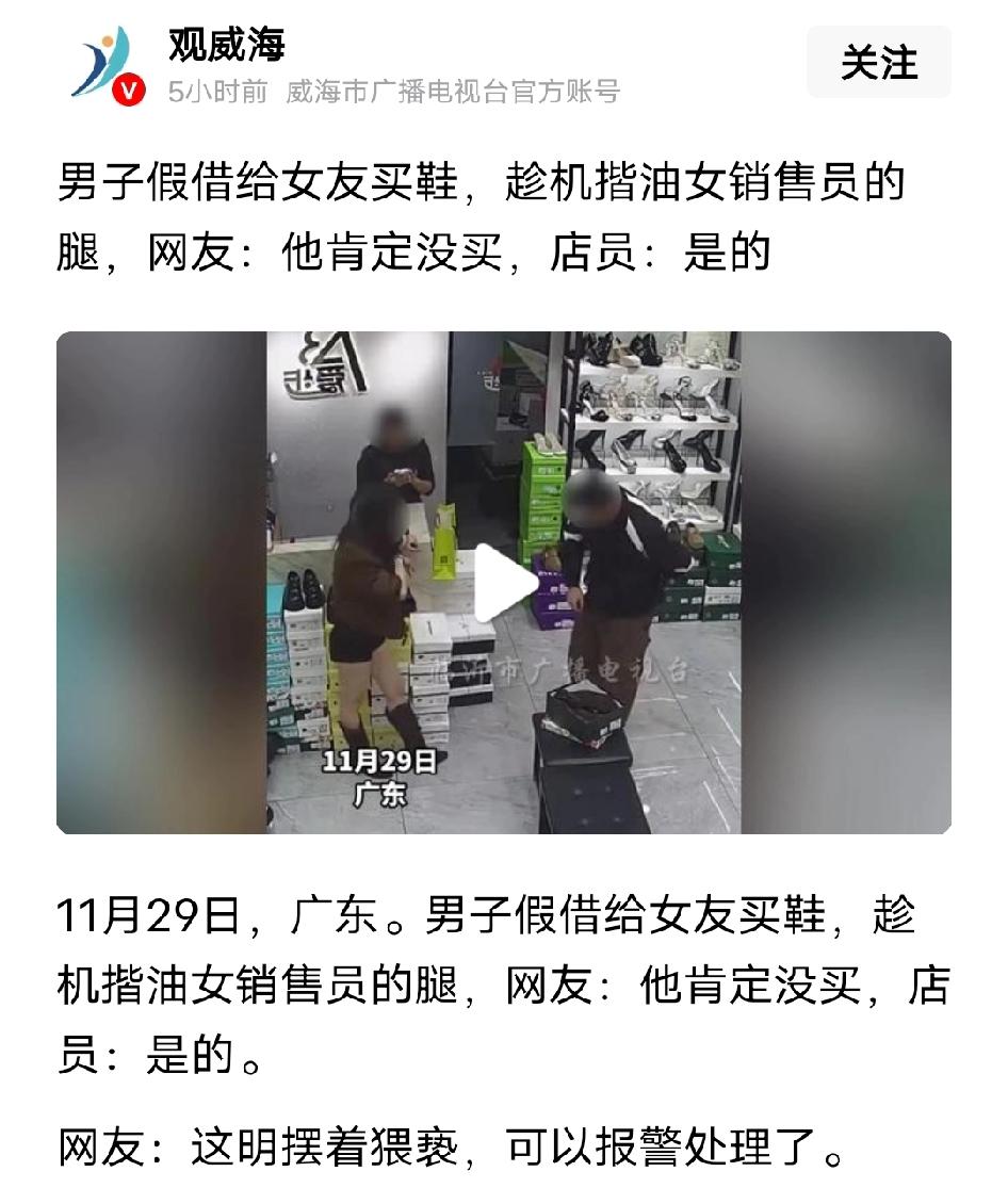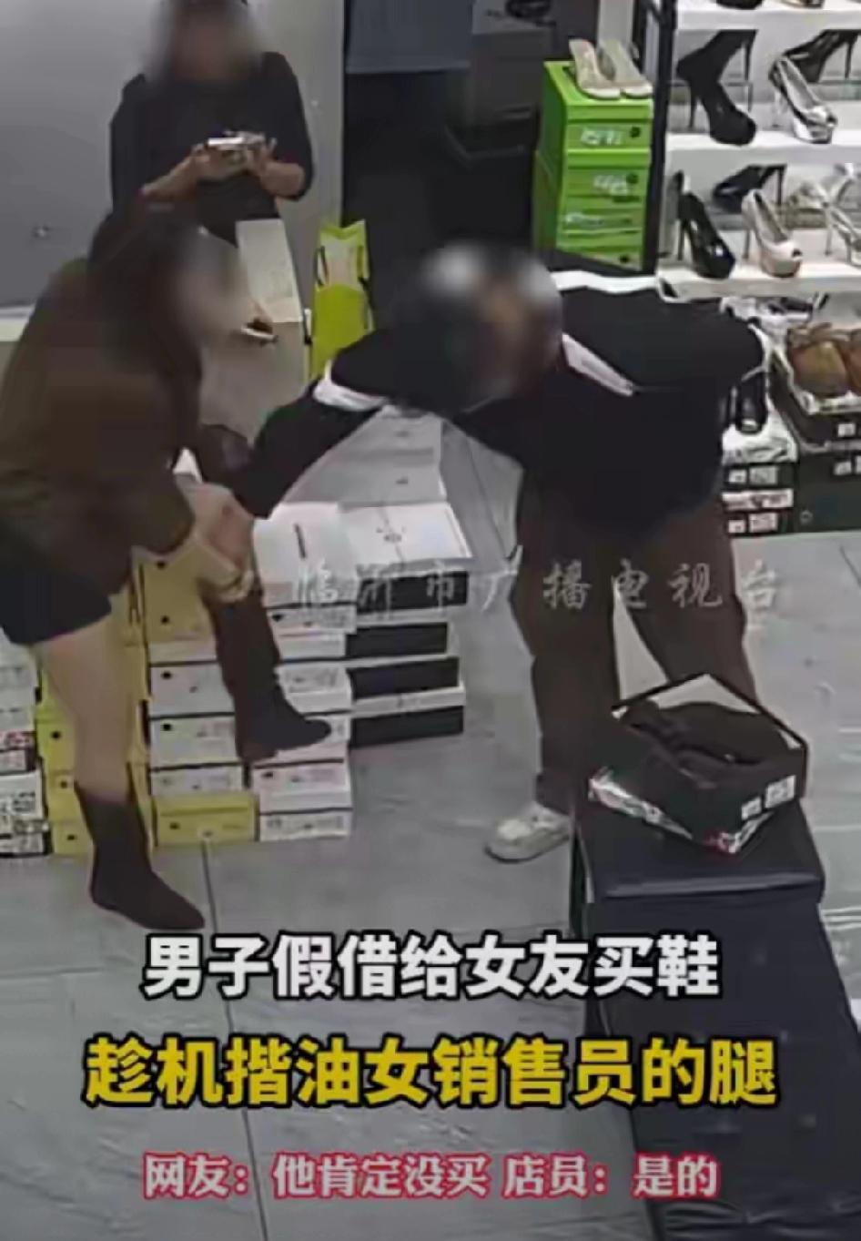 广东,一名男子假借给女朋友买鞋,趁机摸女销售员的腿 。网友:明摆着是猥亵,可以报警处理 。 不得不说,这个男子也太大胆了吧,光天化日之下居然做出这么龌龊的事情 。 对此你有什么看法 ? (信息来源:观威海)