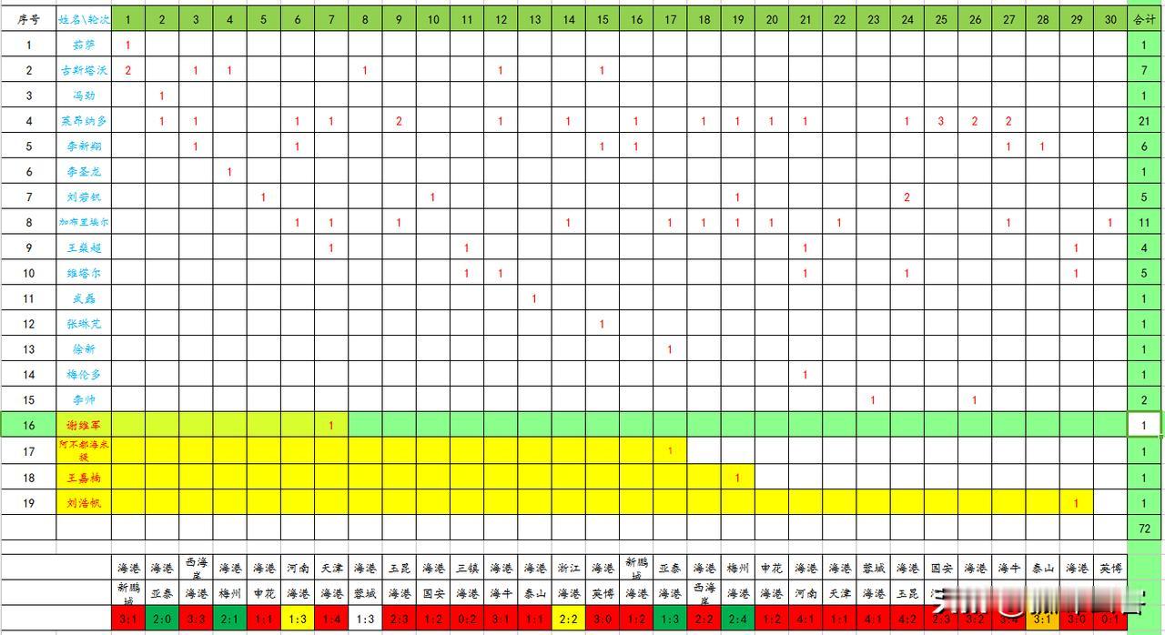 2025赛季上海海港进球队员分布情况—— 1、莱昂纳多(21球) 2、加布里埃尔(11球) 3、古斯塔沃(7球) 4、李新翔(6球) 5、刘若钒(5球) 6、维塔尔(5球) 7、王燊超(4球) 8、李帅(2球) 9、茹萨(1球) 10、冯劲(1球) 11、李圣龙(1球) 12、武磊(1球) 13、张琳芃(1球) 14、徐新(1球) 15、梅伦多(1球) 16、谢维军(1球)乌龙 17、阿不都海米提(1球)乌龙 18、王嘉楠(1球)乌龙 19、刘浩帆(1球)乌龙 本赛季上海海港打进72球,是中超进球最多的球队,而且还是唯一一支每轮都有进球的球队,虽然他们在上半赛季发挥一般,但凭借在下半赛季的发力,最终超越国安、蓉城和申花登上中超之巅。 在进球方面莱昂纳多打进21球荣膺队内射手王,本土新星李新翔打进6球为队内本土进球最多的球员,同时在30轮联赛中他们还收获了4粒乌龙球为中超之最,由此可见他们的锋线威胁在中超是独一档的存在![作揖][作揖][作揖]