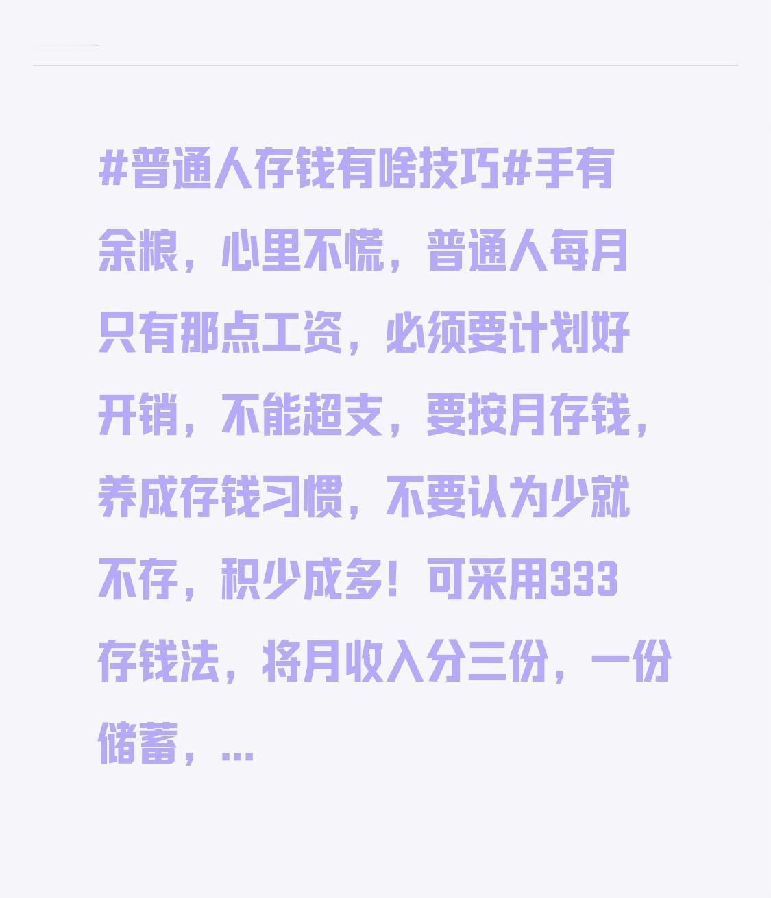 普通人存钱有啥技巧手有余粮,心里不慌,普通人每月只有那点工资,必须要计划好开销,不能超支,要按月存钱,养成存钱习惯,不要认为少就不存,积少成多!可采用333存钱法,将月收入分三份,一份储蓄,一份投资,一份日常开销,避免月光!