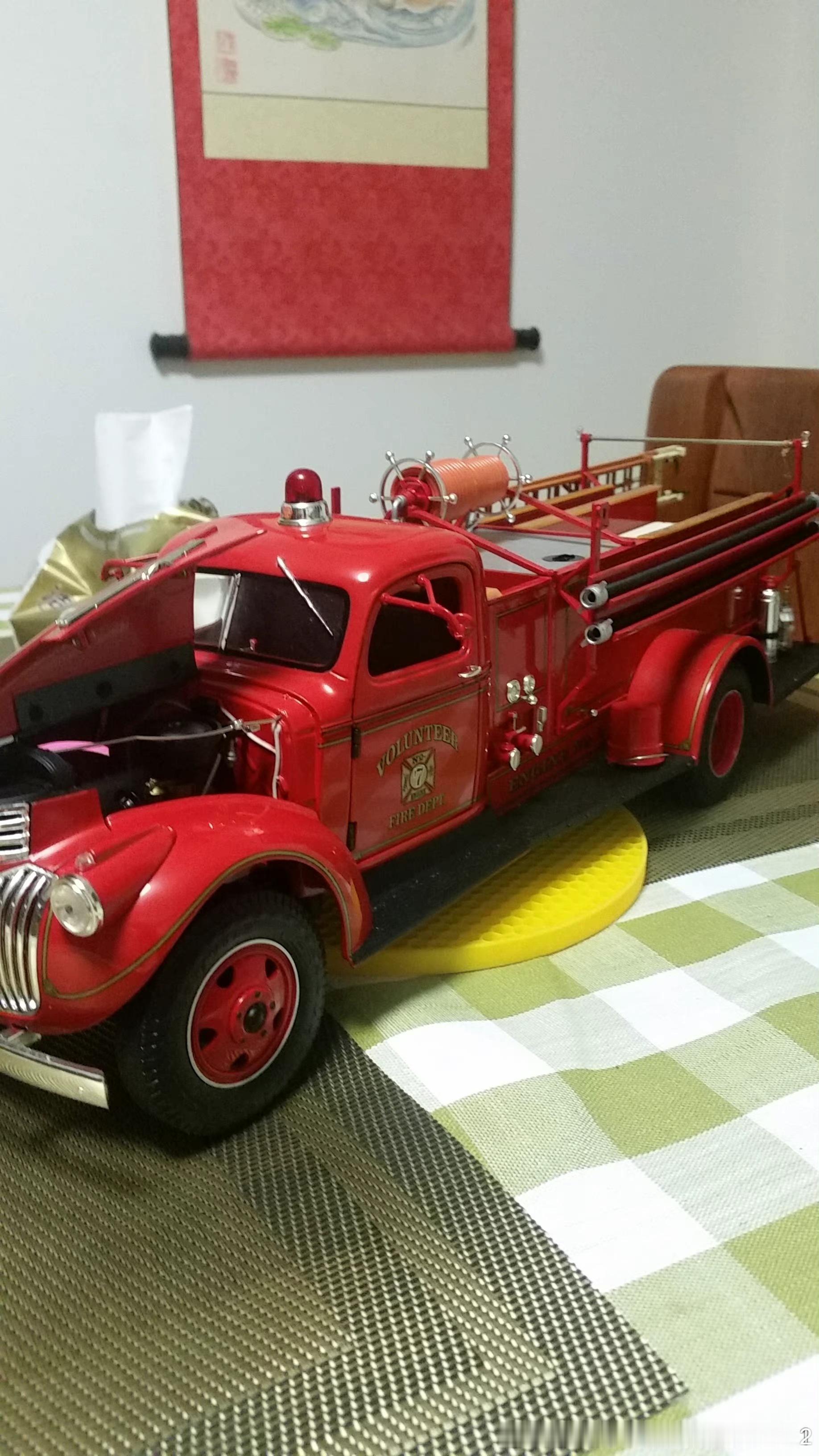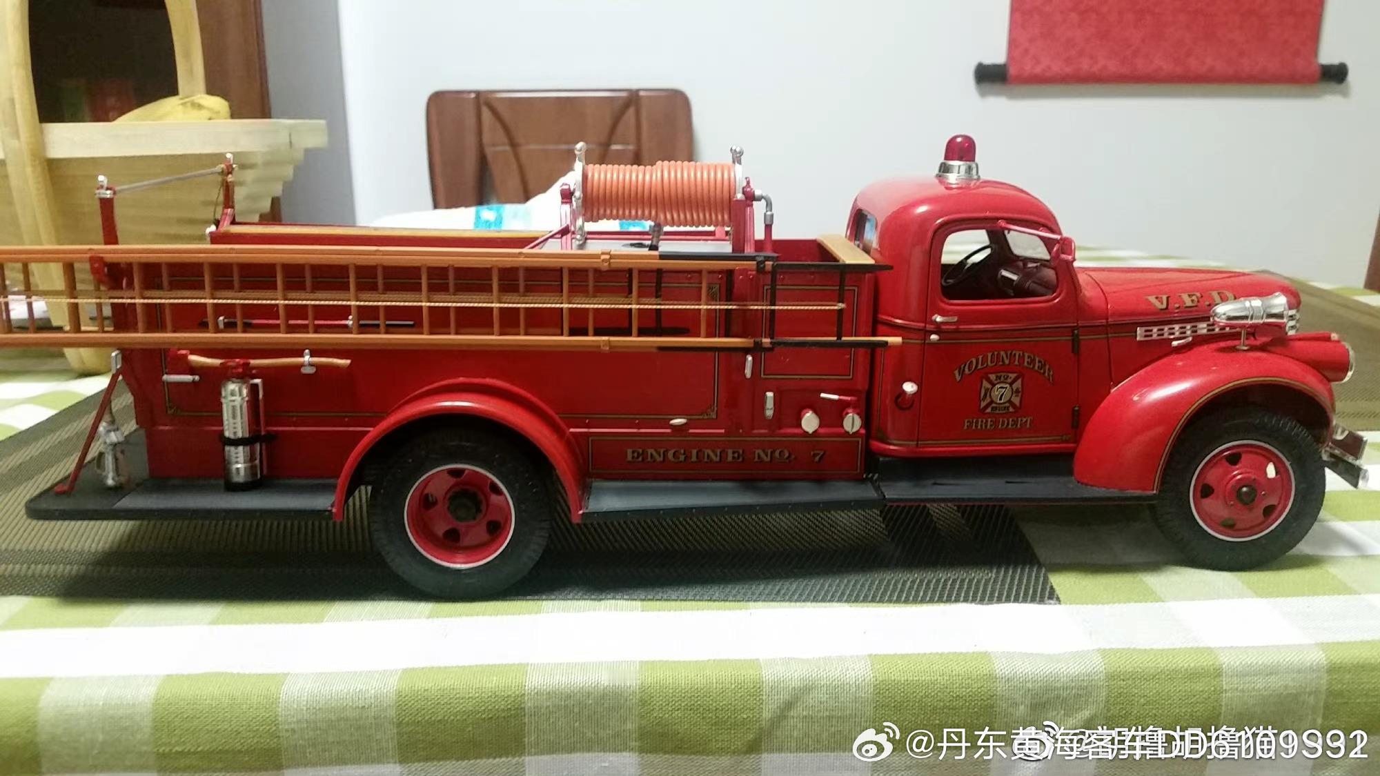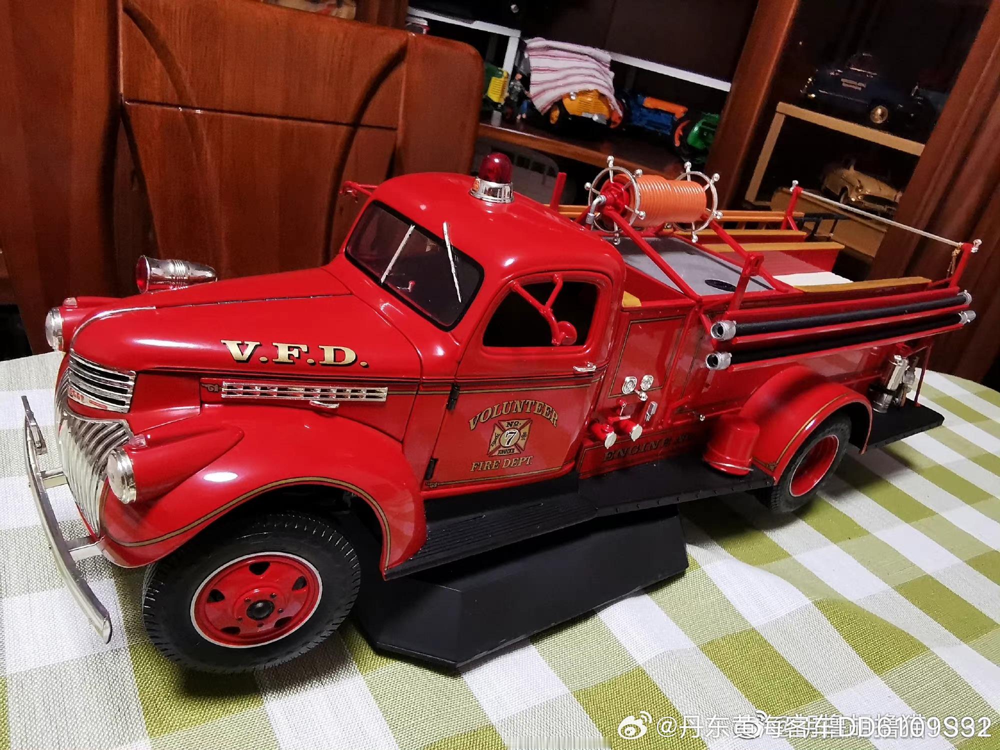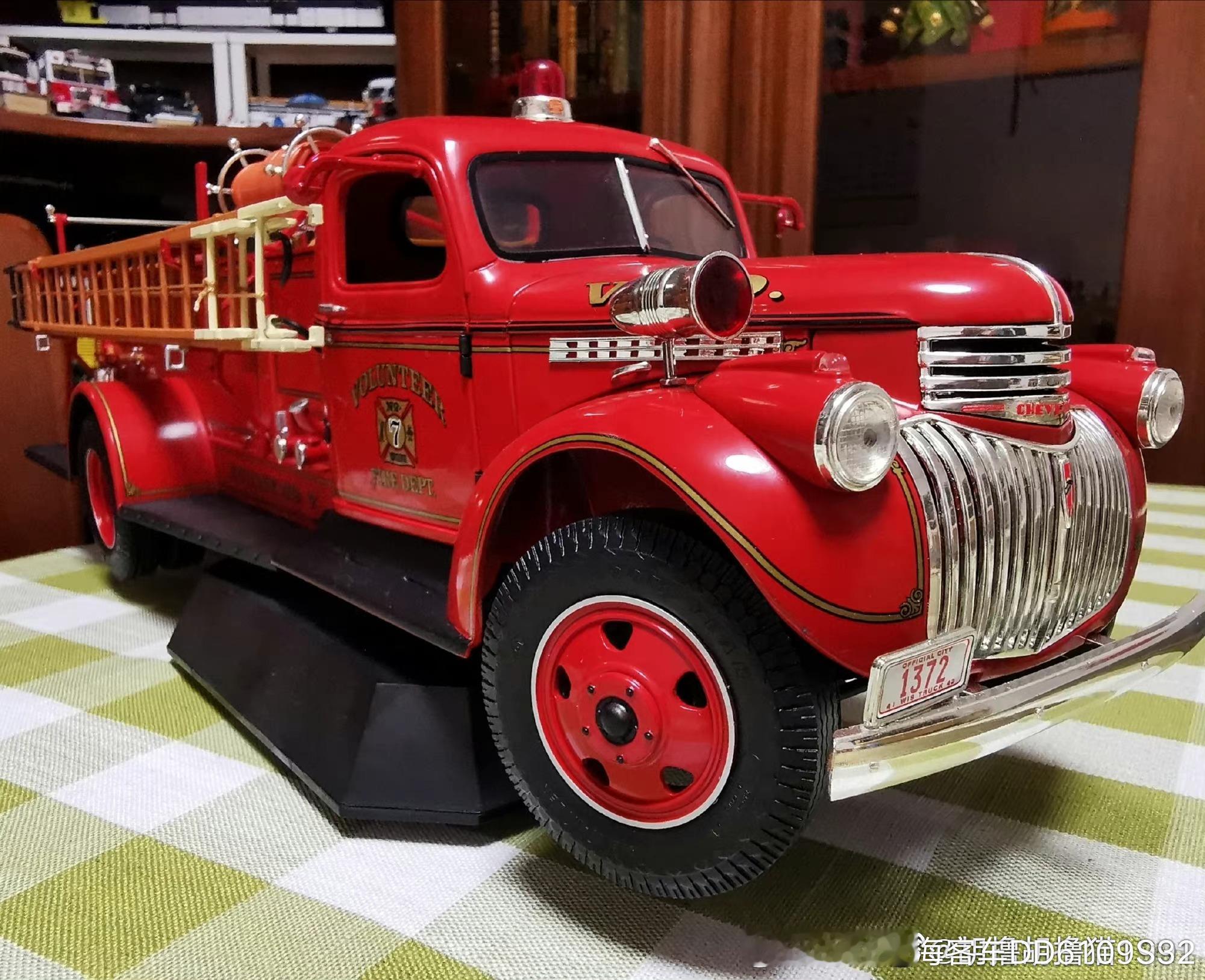 雪佛兰消防车模型,HW61出品比例16。 车底是二战前后雪佛兰中型卡车,典型的通用长鼻脸,覆盖件基本就是放大的那个时候的Suburban。此款消防车结构相对标准,附带可伸缩的梯子,大梁中部有一个水箱,水箱下有液压马达带动的水泵,后部凹槽用于盛载水龙管线。 最后两张图为当年普通型真车车底,时间久远空间不再,感谢原图作者。