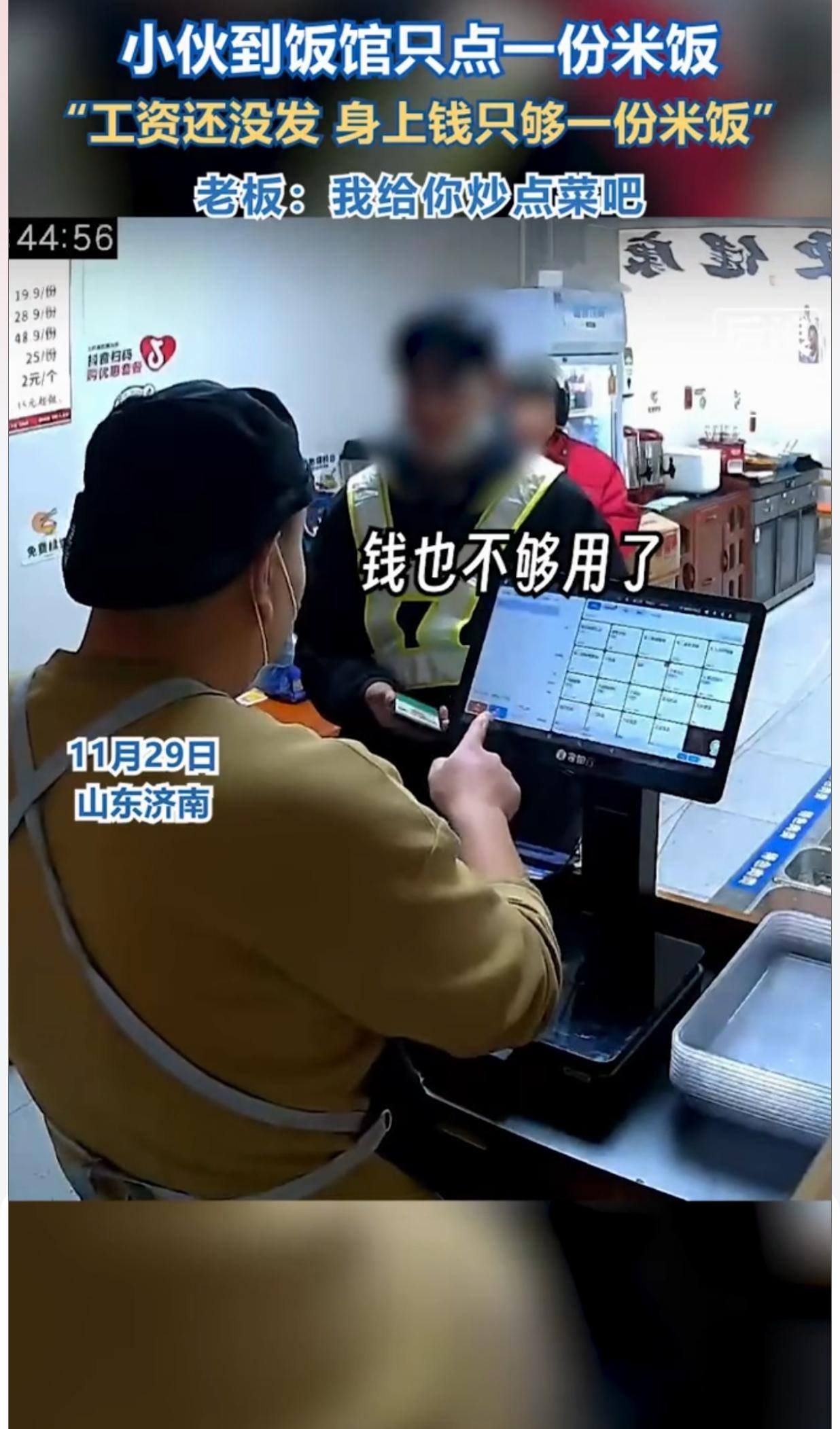 一个心怀感恩,一个知恩图报!11月29日,山东济南一小伙到一家饭馆吃饭,由于手头拮据,再加上小伙的工资没有发,因此小伙子只点了一份米饭。 老板看出了他的窘迫,就对小伙说:“我给你炒点菜吧!你只吃点米饭也没有什么营养。” 听到老板也给自己送上免费的炒菜,小伙子先是愣了一秒,可能没有遇到这么温暖的陌生人吧?接着惊讶地抬头,而后在老板招呼下,小伙子在犹豫片刻之后,找了个座位坐了下来。 等小伙用餐结束后,他也很有礼貌,主动帮忙收拾了桌子,并鞠躬表达谢意之后,这才离开。 网友看到后评论说,看似简单的一份餐,藏着的是老板的同理心和责任感。在快节奏的生活里,这种不冷漠的善意,正是我们需要的温暖,为老板点赞!! 还有的网友说,一碗白饭,一碟热菜,是老板悄悄给小伙递来‘日子会好’的底气。 这件事最动人的地方,在于善意与尊重的双向奔赴——面对小伙的拮据,老板不仅没有居高临下,反而共情小伙的遭遇。小伙的感恩没有理所当然,这恰恰是平凡生活里最珍贵的人性温度。 老板的举动不止是“送一份菜”,更是读懂他人窘迫后,用“我给你炒点菜”的温和语气维护对方尊严,这份不张扬的善意,比直接施舍更有力量。 而小伙主动帮老板收拾桌子、鞠躬致谢,这样做让善意有了回响,他没有因为生活在困境中而丢掉礼貌与分寸,这份知恩图报的态度,让温暖形成了闭环。 在当代社会下,很多人习惯了“各人自扫门前雪,莫管他人瓦上霜。”,但这份温暖的互动告诉我们:善意从不是什么惊天动地的大事,可能是一句体谅的话、一份及时的帮助。 大家觉得呢?欢迎大家评论区讨论留言。