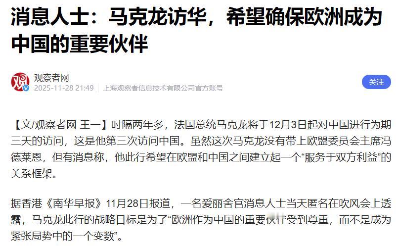时隔两年半,马克龙再次访华,中方的态度已经不同了!   还记得上一次马克龙访华,成都大熊猫基地的幼崽被临时调去"迎客",空客签下的200亿欧元订单让法媒直呼"历史性胜利"。当时马克龙在中山大学的演讲里,把"欧洲战略自主"说得像首浪漫的诗,说欧洲不能做"美国的附庸",不能在中美之间"选边站"。   可话音未落,法国转头就在欧盟内部牵头对中国电动车加征21.5%的关税,把三家中国企业塞进对俄制裁名单,甚至把中国稀土出口管制说成"经济胁迫"。   这种"要合作时喊口号,要站队时卖队友"的操作,让中方渐渐明白:法国的"战略自主",更像是个随天气变色的晴雨表——需要中国市场时是多极世界的倡导者,碰到美国压力或欧盟民粹情绪时,立刻变成对抗派的急先锋。   这种反复,在中法核能合作项目上体现得最刺眼。   2023年访华时,马克龙特意带了法电集团CEO,签下台山核电站二期协议,说这是"中法能源伙伴关系的里程碑"。但不到半年,法国议会就以"国家安全"为由,要求审查所有在法中企投资,核能项目首当其冲。   我们的一位工程师回忆称,当时法方突然增加十多项技术壁垒,原本谈好的设备交付期一拖再拖。"他们总说'战略自主',但我们看到的,是随时可以推翻的承诺。"   马克龙现在的困境,就藏在法国最近的民调里。47%的支持率创下任期新低,养老金改革引发的罢工刚消停,极右翼勒庞的支持率已经涨到32%。   这种时候访华,明眼人都看得出来马克龙是要在"外交突围"——空客需要中国新增的100架订单救市,法国农业部长刚为干邑白兰地出口下滑急得跳脚,G7主席国的位子更需要中国捧场。   但我们算的是另一本账:2023年签的60亿欧元农产品订单,到现在还有40%卡在法国海关的"安全审查"里;承诺的大熊猫新租期,总被跟电动车关税谈判绑在一起。"   更关键的是,中方对欧外交的心态变了。以前看重"中欧关系稳定器"的角色,愿意为法国的"战略自主"愿景买单,现在更在意"说了算不算"。   今年中美关税休战后,欧洲突然发现自己成了"局外人",马克龙这才想起用G7邀请函拉拢中国。但我们清楚,G7本质还是西方俱乐部,去年德国想邀请印度参会都被美国否决,法国就算当主席,又能给中国多少实质性尊重?   站在2025年末的这个时间节点看,中法关系的"冷静期",何尝不是中国外交成熟的标志?不再为元首会晤的红毯长度计较,不再为签约仪式的闪光灯买单,而是盯着项目落地的时间表、政策执行的连贯性。   当法国媒体抱怨"中方态度变冷"时,他们或许没注意到:2023年马克龙访华时,中方准备了12场企业对接会;2025年,同等规模的活动缩减到3场,主题却更务实——全围绕"已签协议落地难"的堵点。   这种变化,不是冷淡,而是把外交从"面子工程"拉回了"里子算账"。