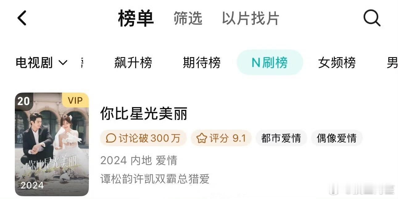 许凯今年的播剧成绩也是很厉害了,《子夜归》20天进拉新年榜,男主梅逐雨13天热度值破亿。现在《你比星光美丽》又进入了🐧的N刷榜单