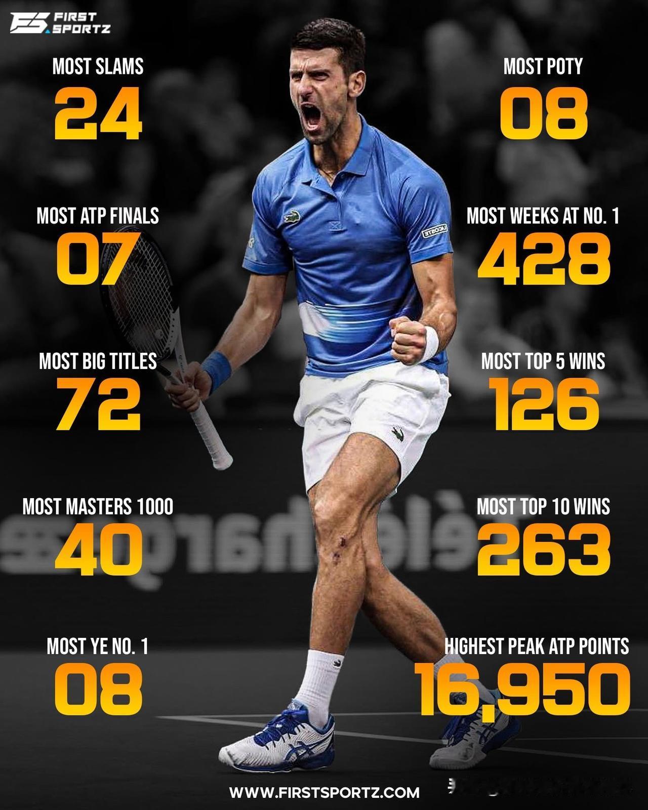 德约科维奇是否能够毫无争议成为史上最佳?看完他目前拥有的纪录之后有了答案! 最多大满贯冠军 (24) 最多ATP总决赛冠军 (7) 最多大师赛冠军 (40) 最多重大赛事冠军头衔 (72) 最多世界排名第一周数 (428) 最多年终世界排名第一赛季 (8) 最多单赛季积分(16,950) 唯一一位职业生涯获得三项大满贯冠军和两项金大师赛冠军的球员。 和主要竞争对手的交锋记录全面领先: 领先罗杰·费德勒(27胜23负) 领先拉斐尔·纳达尔(31胜29负) 一项涵盖所有类别的全面比较,从重大赛事冠军(大满贯、大师赛、ATP总决赛)和直接交锋记录,到职业生涯的持久性、稳定性、全面性以及对顶级对手的压制等,最终得出结论:德约科维奇是史上最佳! 网球