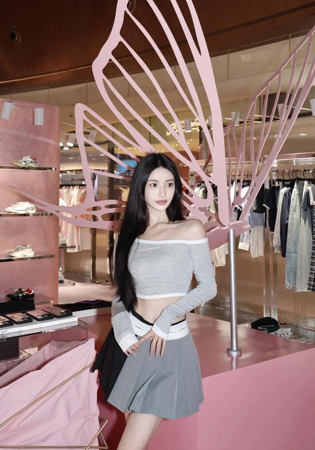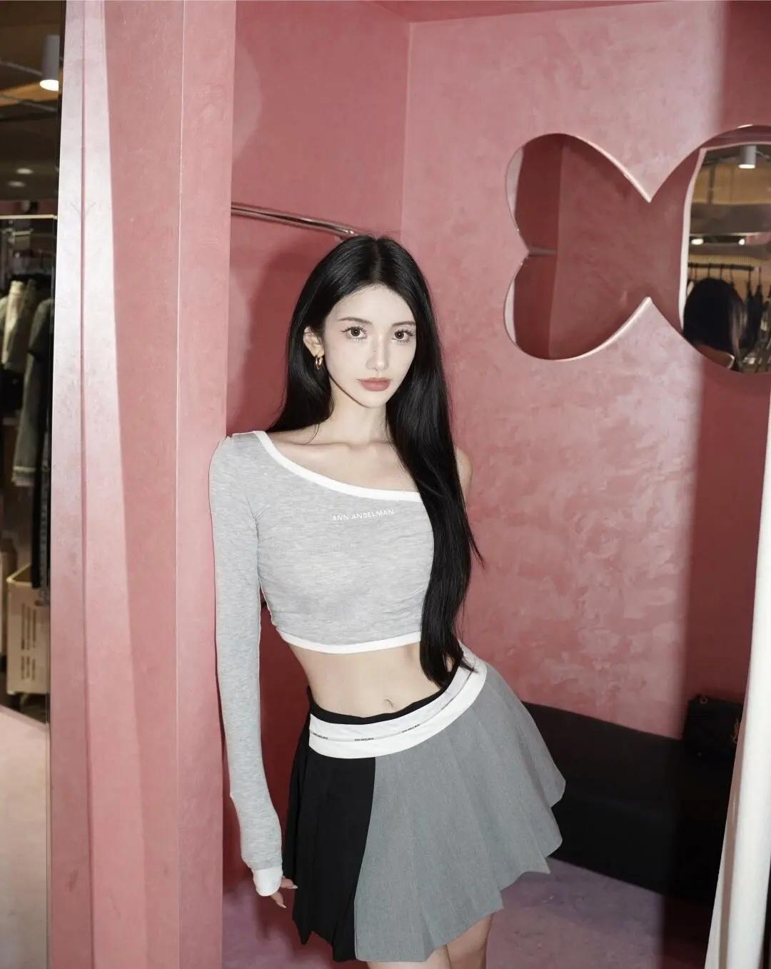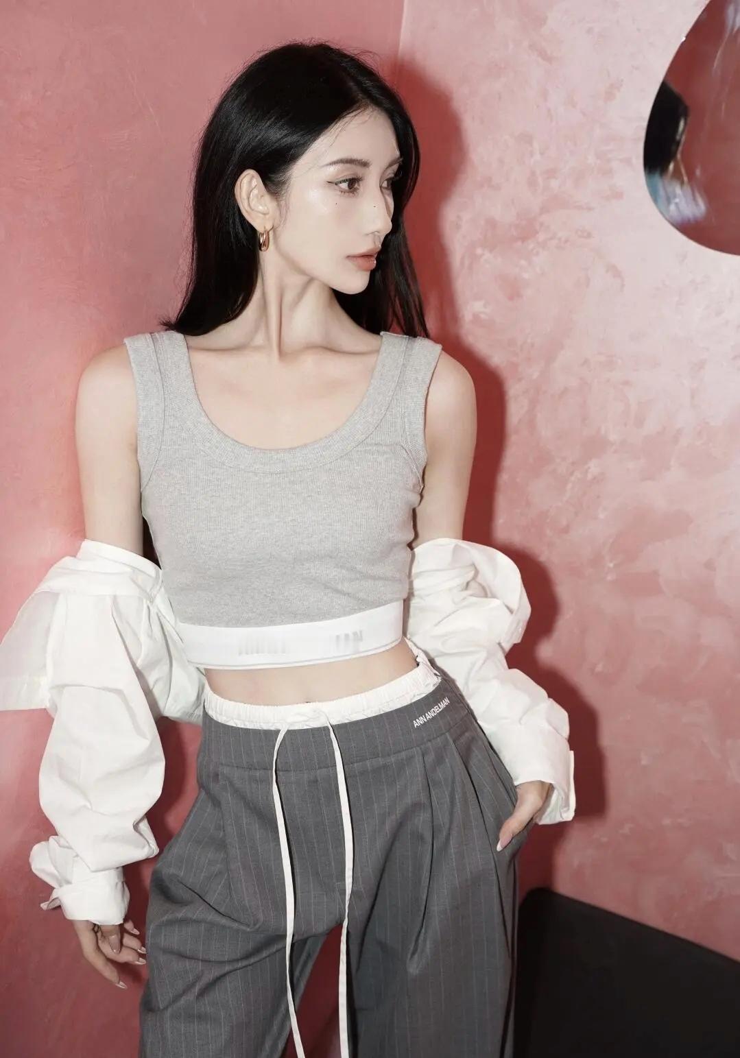 露腰灰背心叠穿蓬松白袖,条纹裤自带随性buff