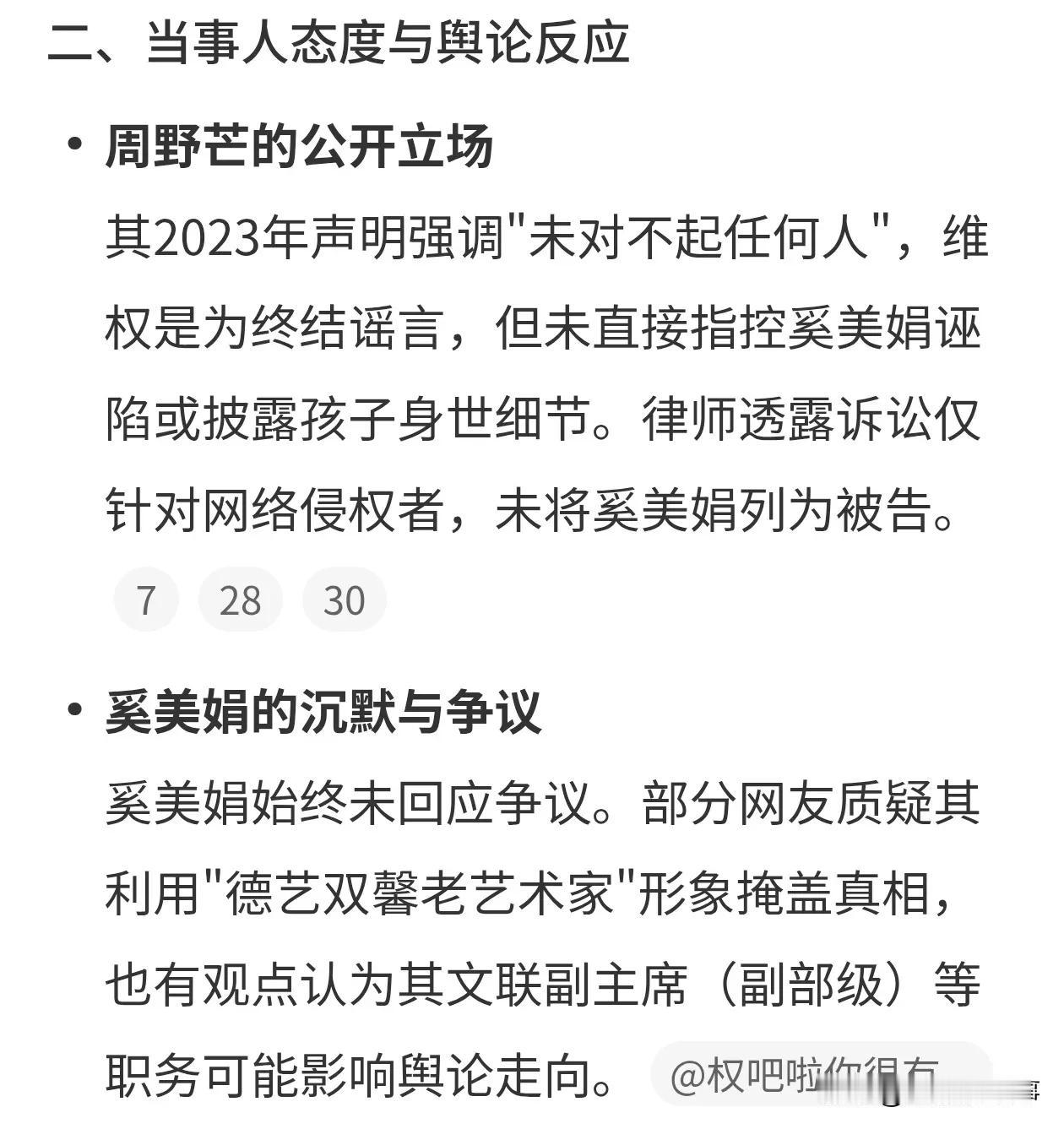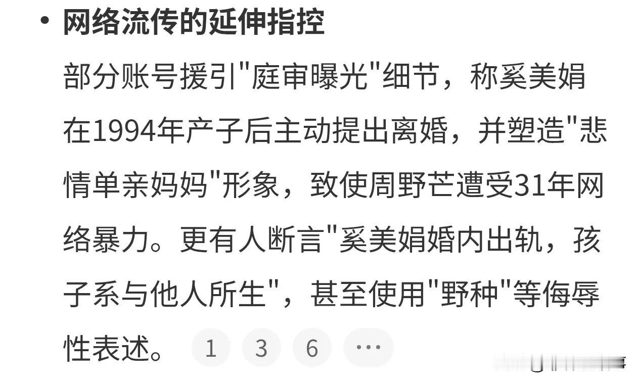 开始清算老戏骨了吗?奚美娟冤枉前夫出轨话题,登上热搜。 奚美娟的前夫周野芒,被网络用户散播谣言,称他出轨导致离婚,奚美娟一个人带大孩子不容易。 周野芒因为谣言,遭受31年网暴,实际奚美娟的孩子,和周野芒并无血缘关系。 这个圈里的人原来以前就乱。 这事,还有反转吗?