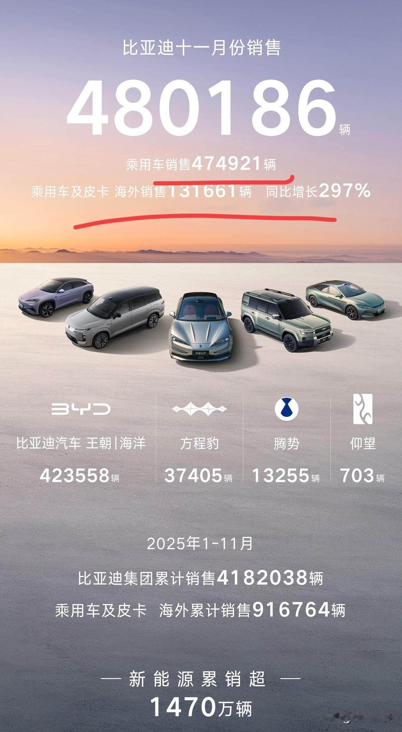 比亚迪11月销量出炉! 11月全系销量480186辆,2025全年累计销量4182038辆,其中比亚迪品牌423558辆,方程豹37405辆,腾势13255辆,仰望703辆,海外出口创新高达到13万辆! 要不说比亚迪高端拉垮呢!这么大的销量,算不上中高端的方程豹+腾势+仰望才5.1万辆,占比仅10%!整体数据是好看,但细分真的……